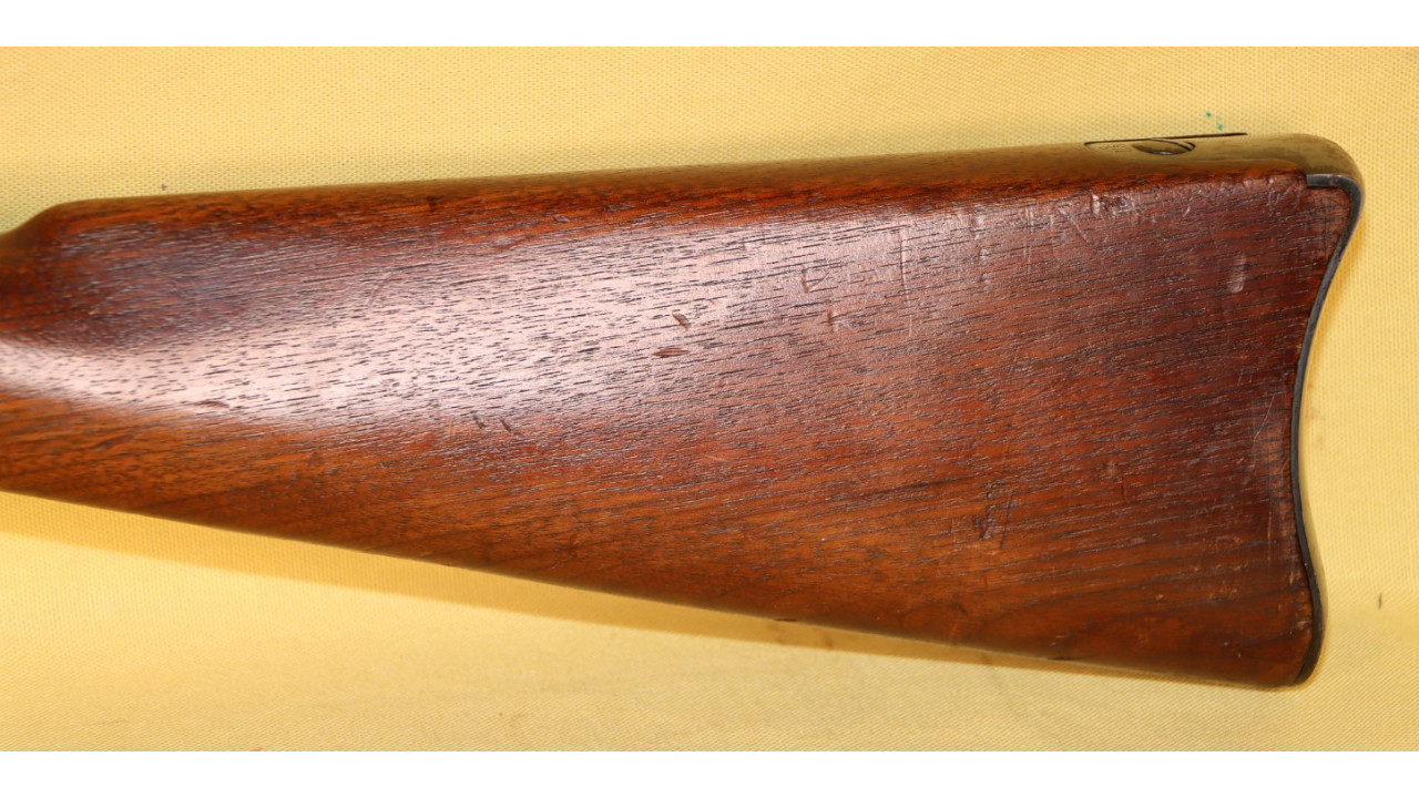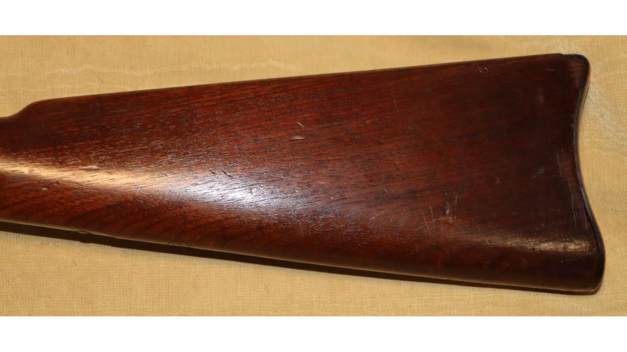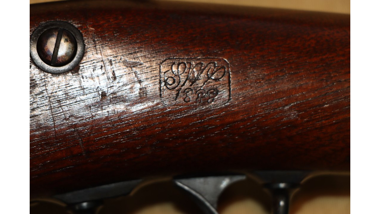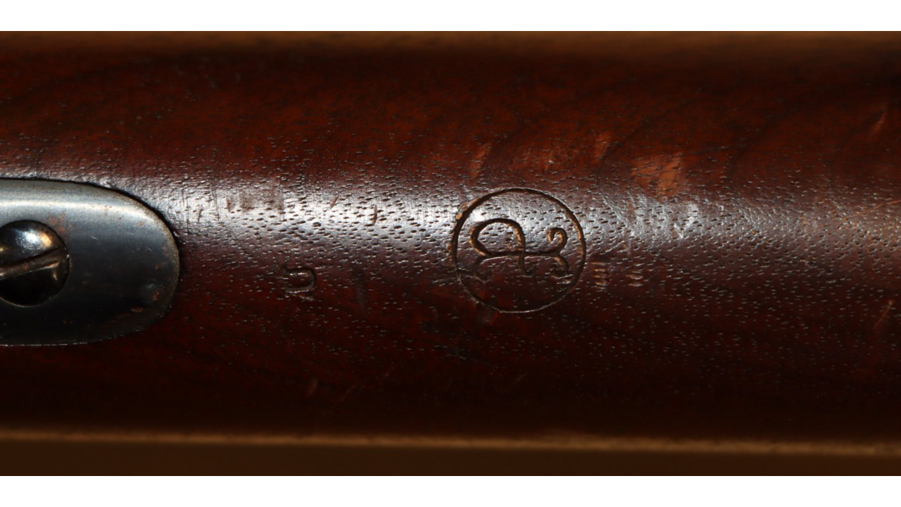 The Stock is the original Model 1873 Rifle Stock in mint condition. The lock mortise is very crisply cut. On the left stock flat is the correct, clipped corner, boxed, script “SWP/1888,” cartouche of Springfield Master Armorer Samuel W. Porter, who held this position at Springfield from 1879-1894. The cartouche is still very crisp and visible. The bottom of the stock wrist has the correct circle, script “P” firing proof stamp and a serif “U” inspection stamp. The stock has only a very few minor dings, but no cracks or chips are noted. The stock retains its original oil finish.