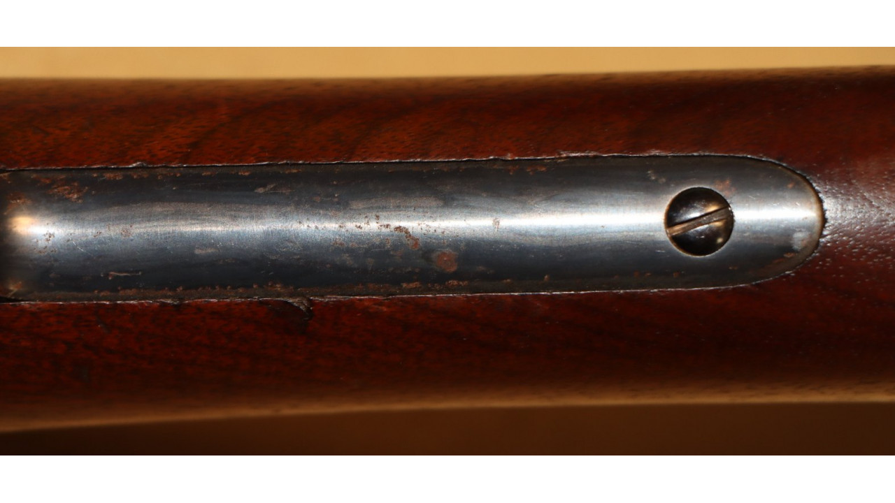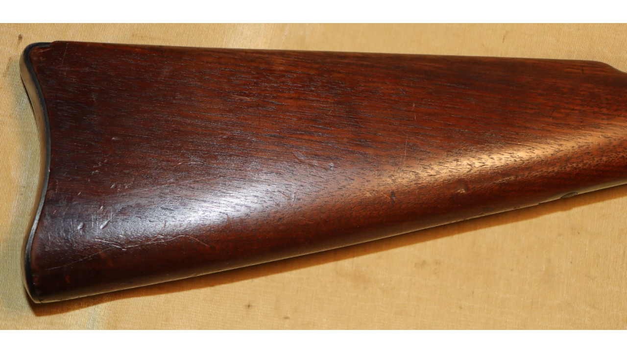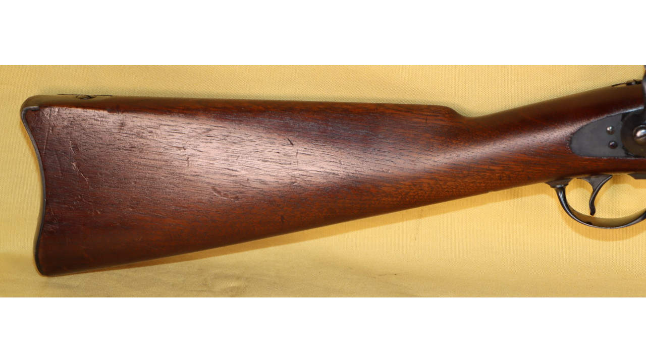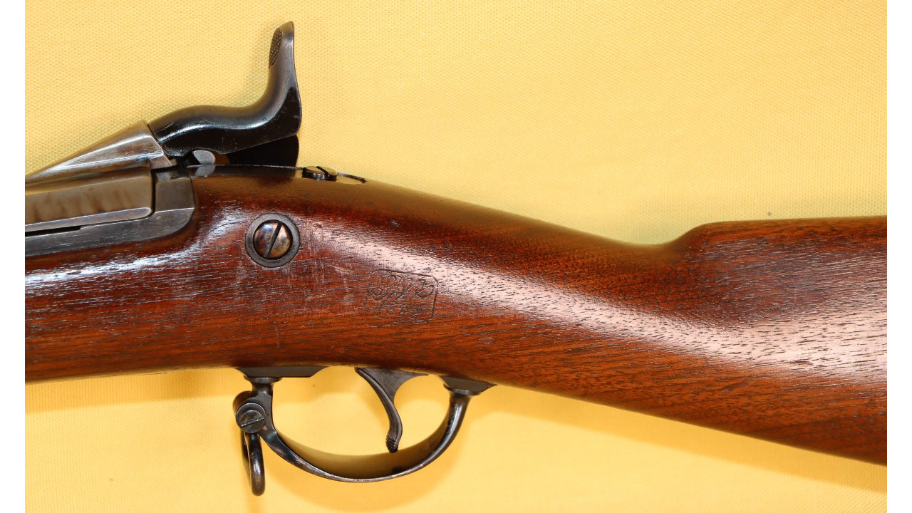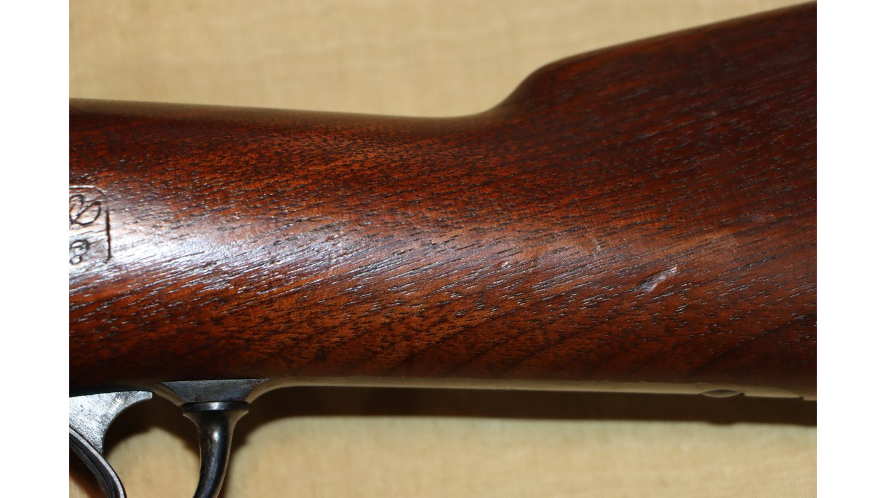 The Stock is the original Model 1873 Rifle Stock in mint condition. The lock mortise is very crisply cut. On the left stock flat is the correct, clipped corner, boxed, script “SWP/1888,” cartouche of Springfield Master Armorer Samuel W. Porter, who held this position at Springfield from 1879-1894. The cartouche is still very crisp and visible. The bottom of the stock wrist has the correct circle, script “P” firing proof stamp and a serif “U” inspection stamp. The stock has only a very few minor dings, but no cracks or chips are noted. The stock retains its original oil finish.