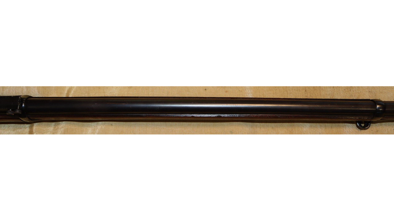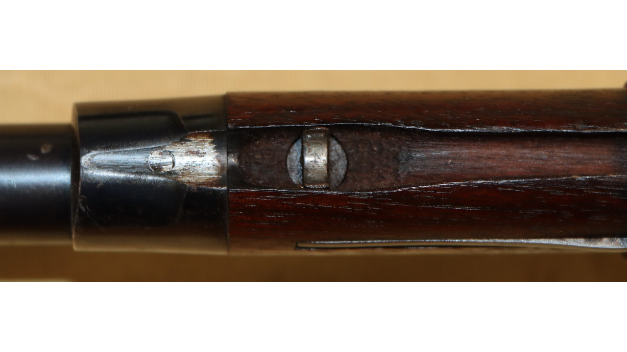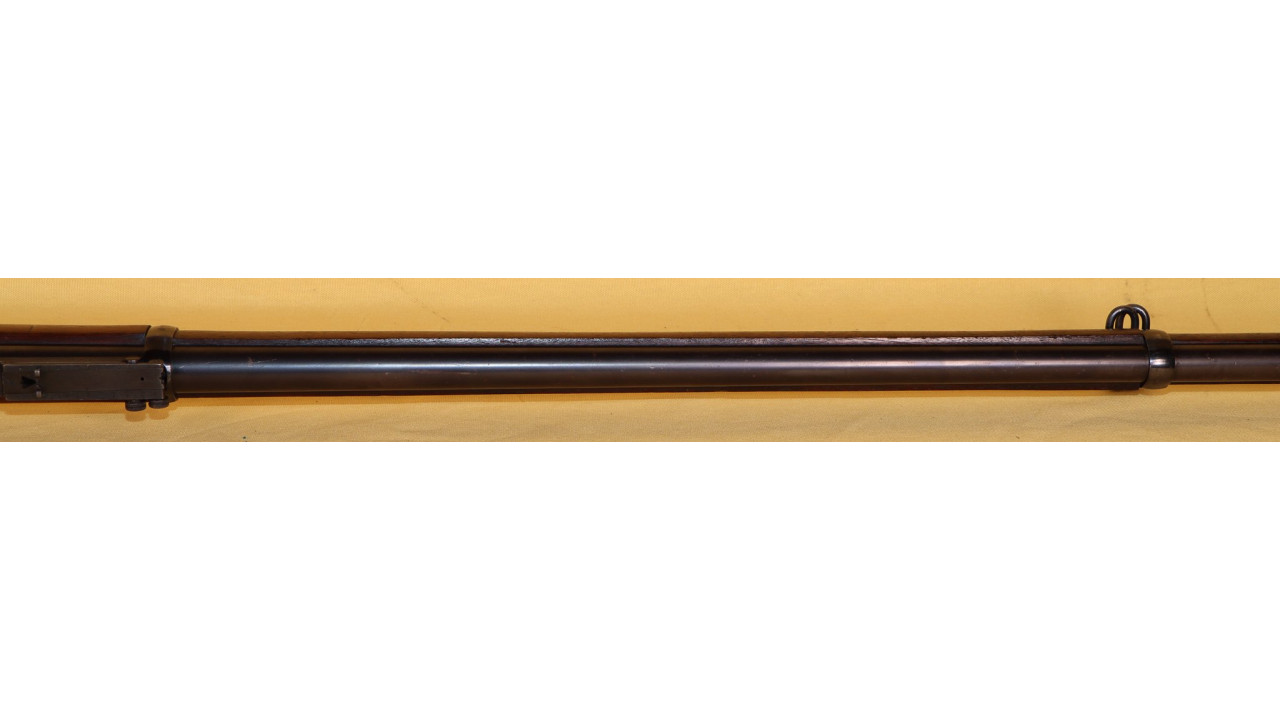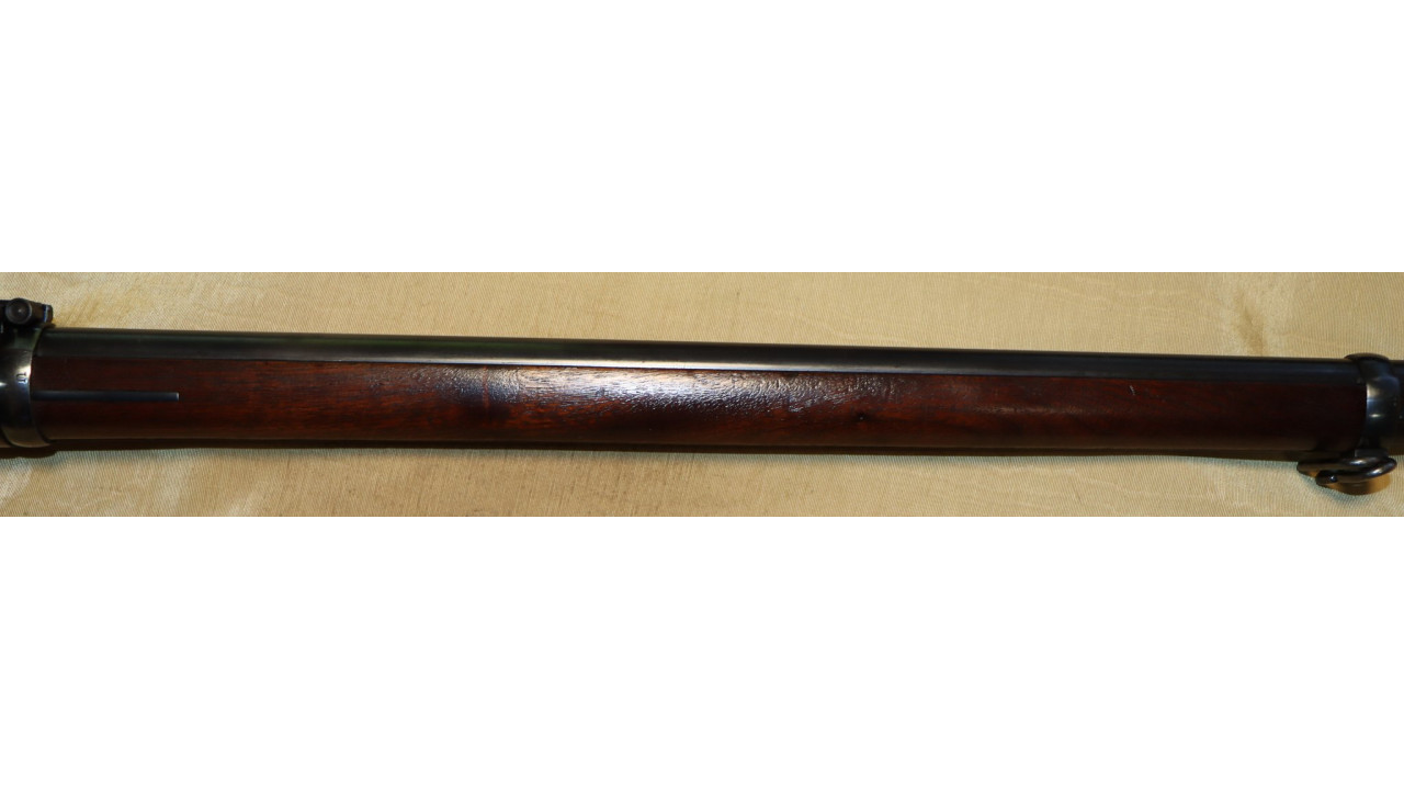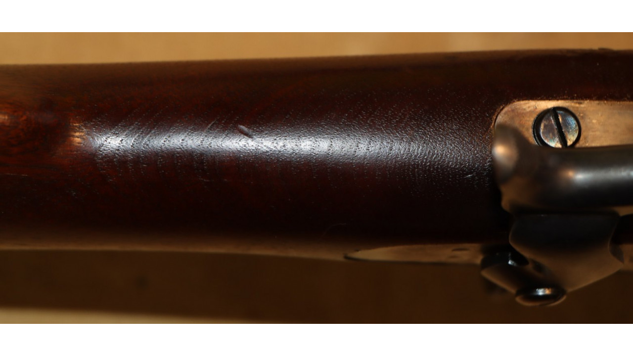 The Barrel on this Rifle is in fine condition. The barrel is 32.60” long with a 0.730” barrel diameter at the muzzle. The barrel retains 98% of the original blue finish with almost no wear noted except for a very few minor scratches to the finish. The left, rear side of the barrel has the serif “V” view proof stamp over the serif “P” firing proof stamp over the eagle head over the second serif “V” firing proof stamp, indicating proof firing with a special 80 grain cartridge of the assembled barrel, receiver, and breech block. The top of the barrel has a serif “A” barrel inspector’s stamp and another, a serif “R” on the left side adjacent to the receiver. The bore of the rifle is in very good plus condition with a mirror finish and strong rifling with only minor frosting in the lands and grooves, mainly towards the muzzle. The chamber is also in mint condition and appears to have been fired very little after proof testing. The Breech Plug and Tang both retain 99% of the original color case-hardened finish. The Tang Screw is the correct single-slot type and is unmarred and it also retains all of its original blued finish.
