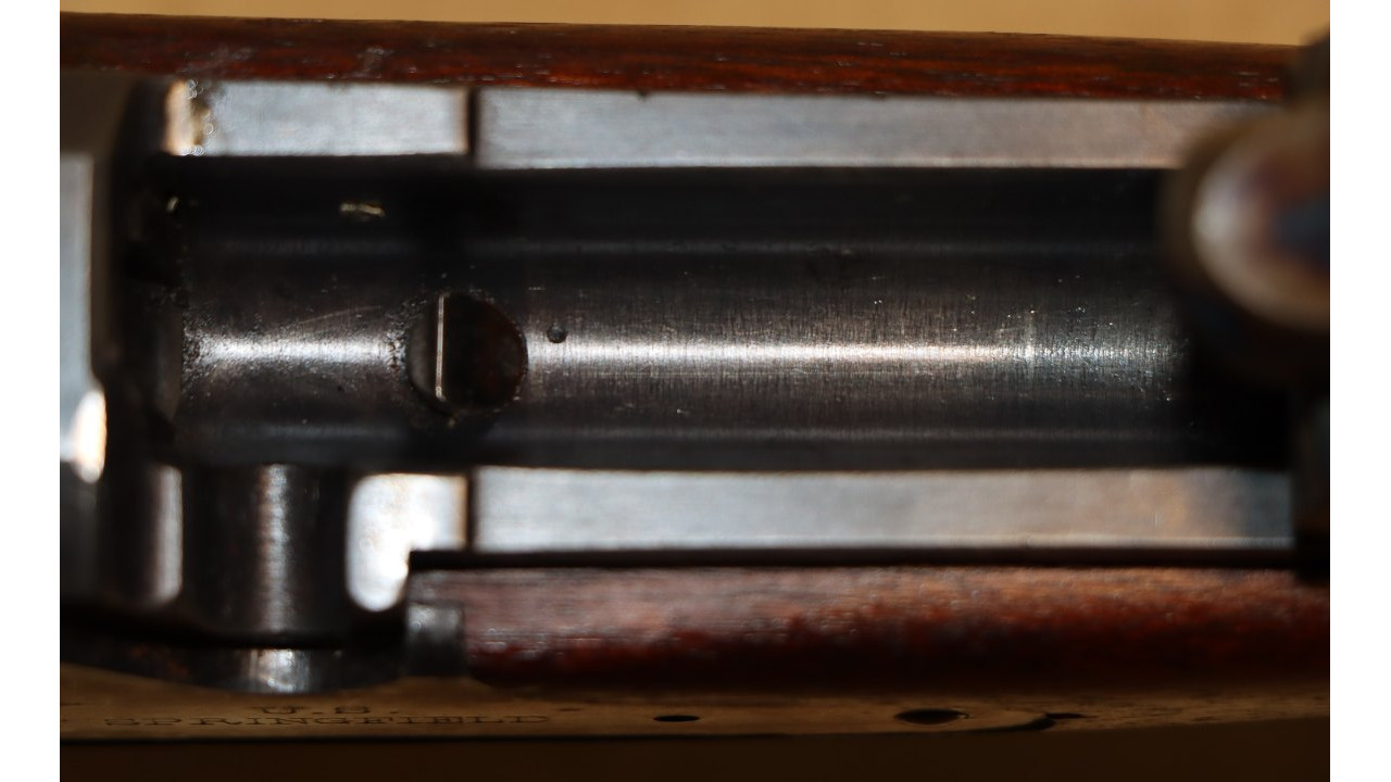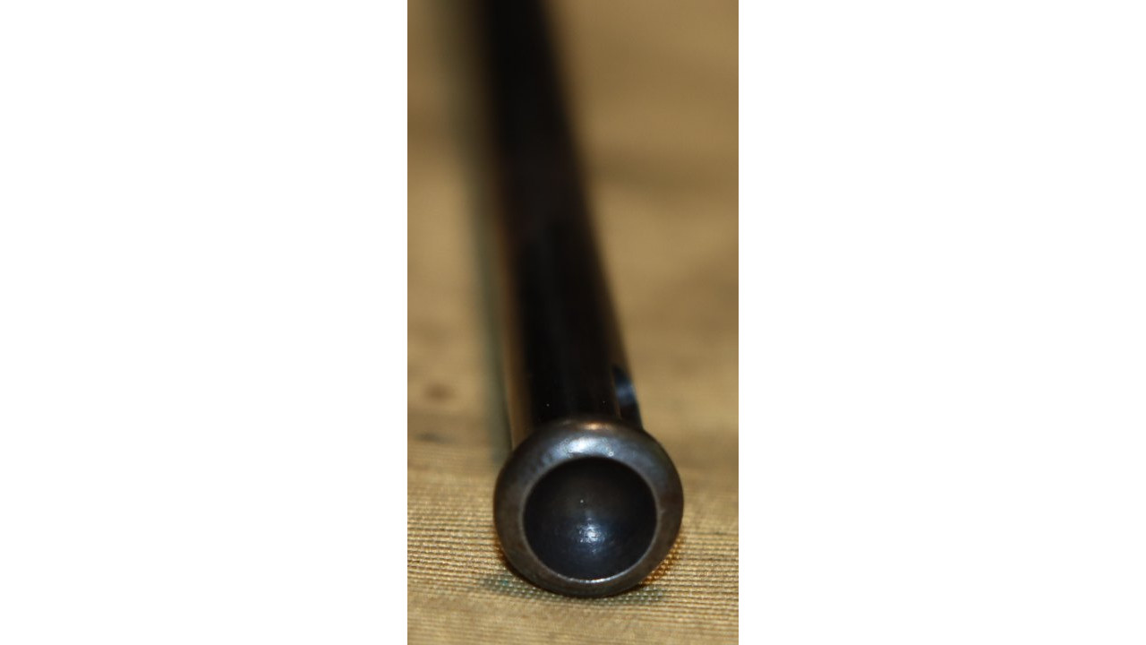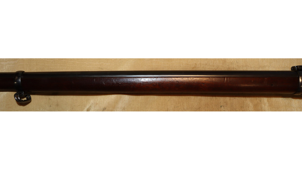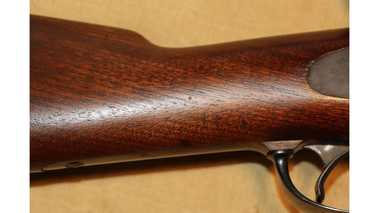 The Barrel on this Rifle is in fine condition. The barrel is 32.60” long with a 0.730” barrel diameter at the muzzle. The barrel retains 98% of the original blue finish with almost no wear noted except for a very few minor scratches to the finish. The left, rear side of the barrel has the serif “V” view proof stamp over the serif “P” firing proof stamp over the eagle head over the second serif “V” firing proof stamp, indicating proof firing with a special 80 grain cartridge of the assembled barrel, receiver, and breech block. The top of the barrel has a serif “A” barrel inspector’s stamp and another, a serif “R” on the left side adjacent to the receiver. The bore of the rifle is in very good plus condition with a mirror finish and strong rifling with only minor frosting in the lands and grooves, mainly towards the muzzle. The chamber is also in mint condition and appears to have been fired very little after proof testing. The Breech Plug and Tang both retain 99% of the original color case-hardened finish. The Tang Screw is the correct single-slot type and is unmarred and it also retains all of its original blued finish.