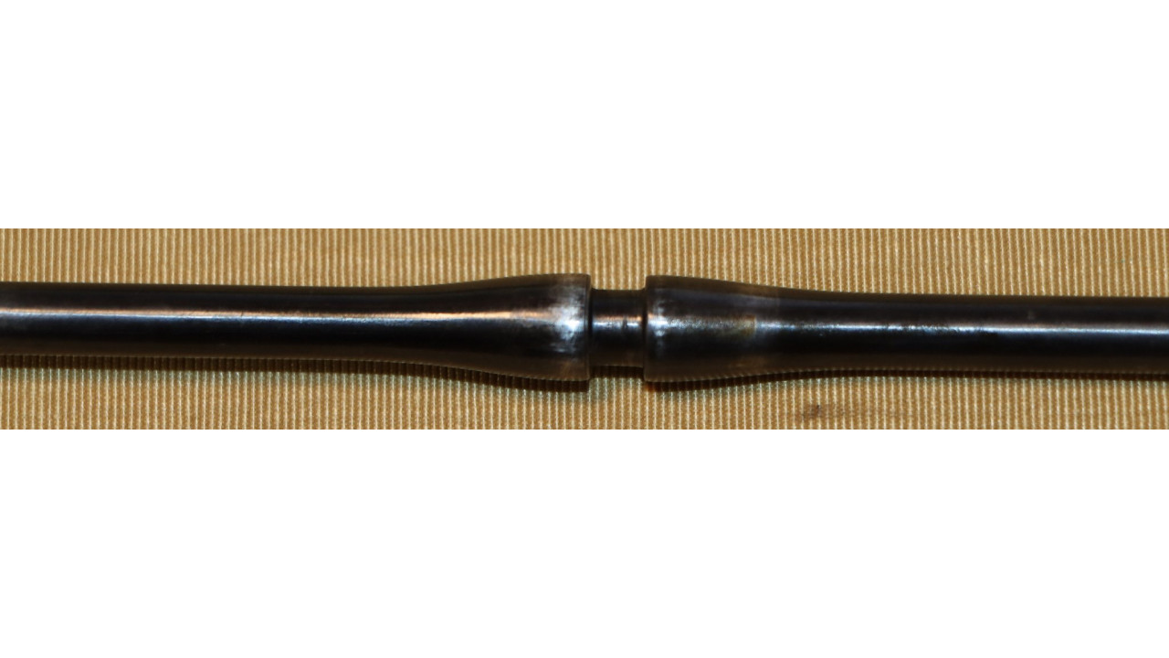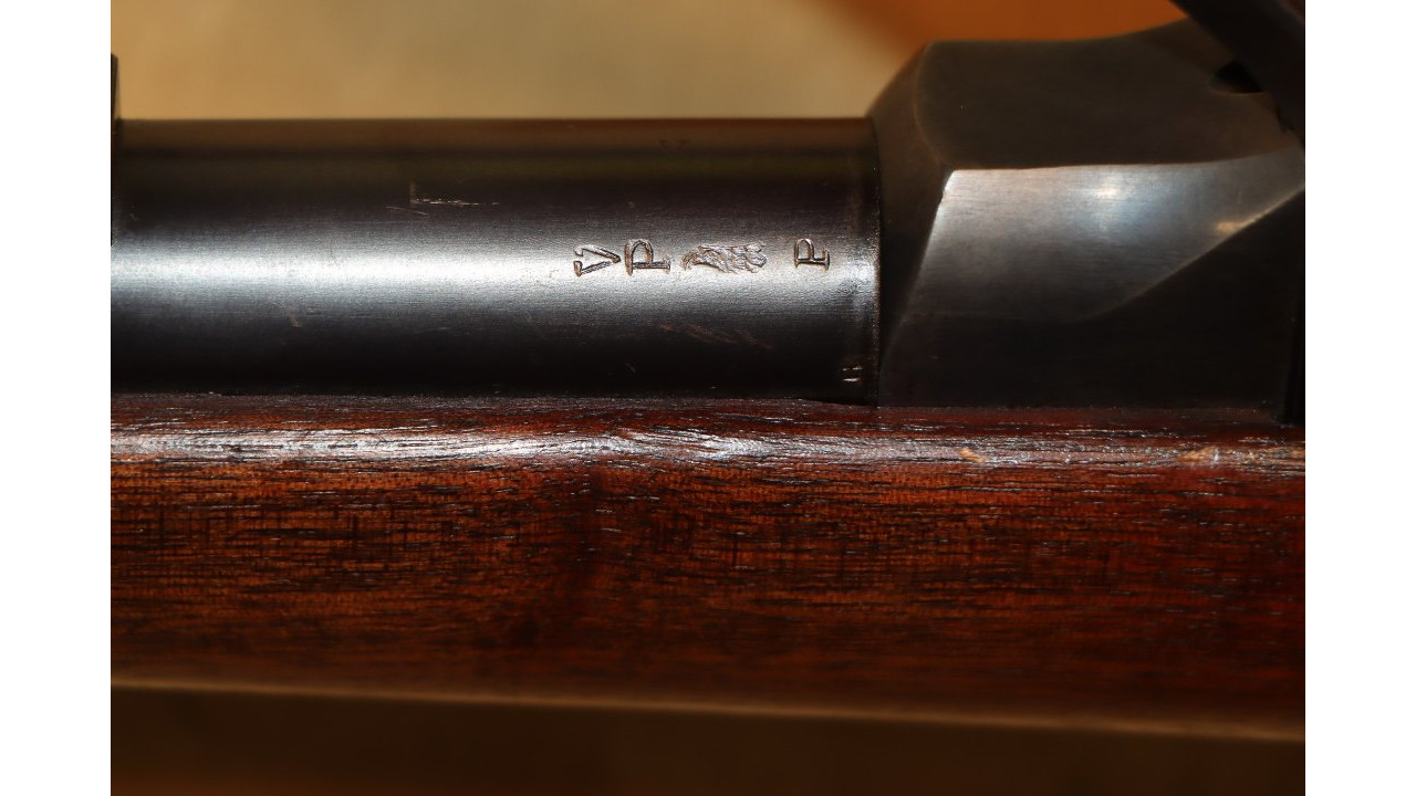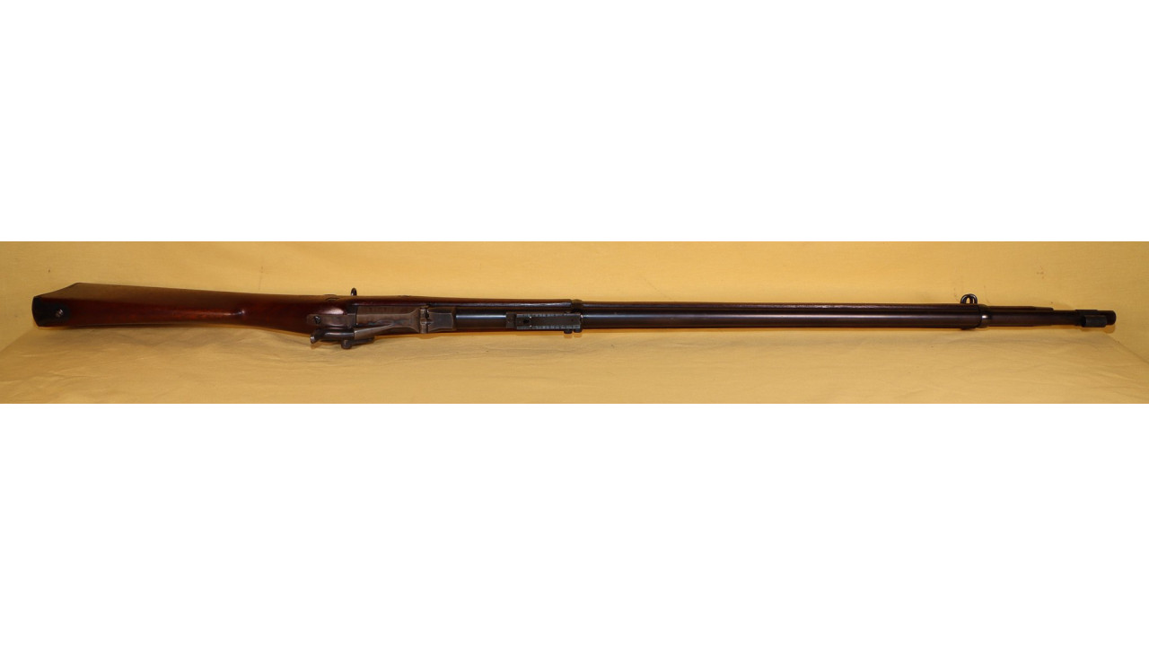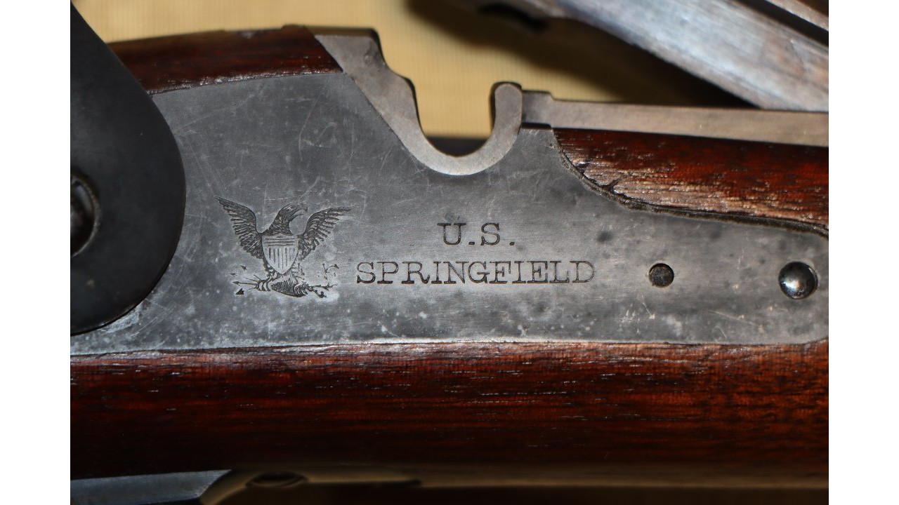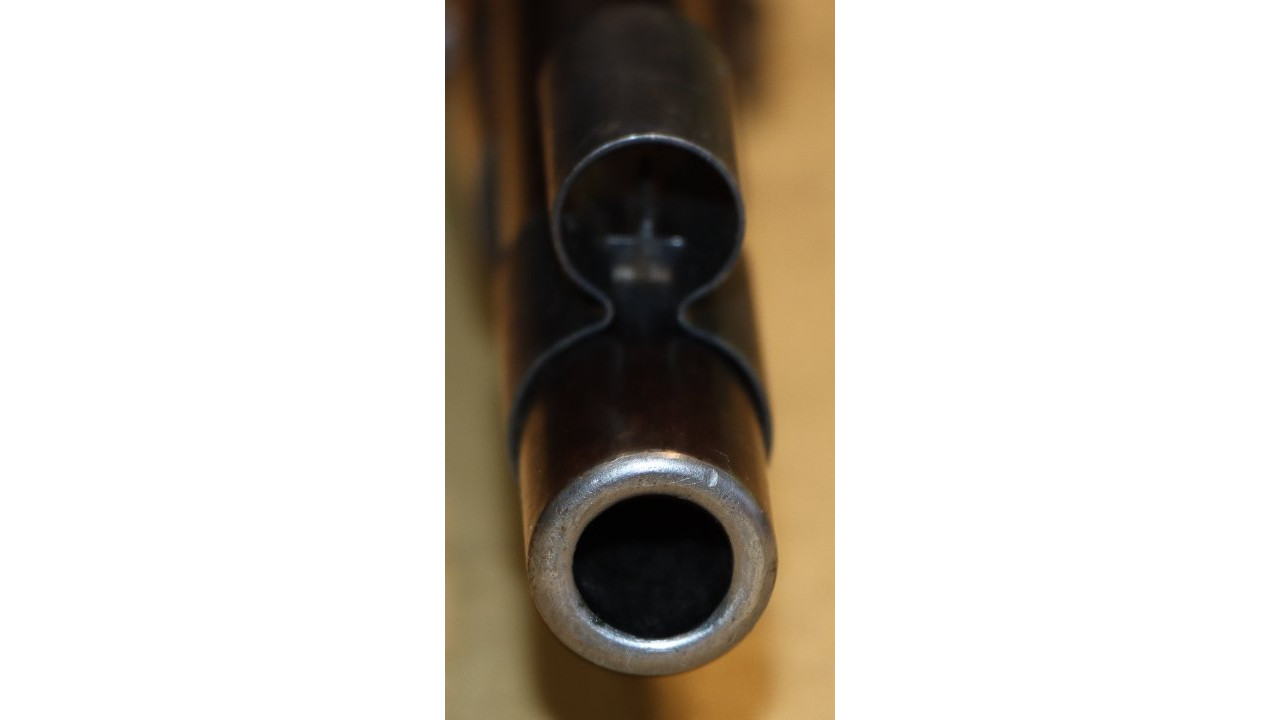 The Barrel on this Rifle is in fine condition. The barrel is 32.60” long with a 0.730” barrel diameter at the muzzle. The barrel retains 98% of the original blue finish with almost no wear noted except for a very few minor scratches to the finish. The left, rear side of the barrel has the serif “V” view proof stamp over the serif “P” firing proof stamp over the eagle head over the second serif “V” firing proof stamp, indicating proof firing with a special 80 grain cartridge of the assembled barrel, receiver, and breech block. The top of the barrel has a serif “A” barrel inspector’s stamp and another, a serif “R” on the left side adjacent to the receiver. The bore of the rifle is in very good plus condition with a mirror finish and strong rifling with only minor frosting in the lands and grooves, mainly towards the muzzle. The chamber is also in mint condition and appears to have been fired very little after proof testing. The Breech Plug and Tang both retain 99% of the original color case-hardened finish. The Tang Screw is the correct single-slot type and is unmarred and it also retains all of its original blued finish.