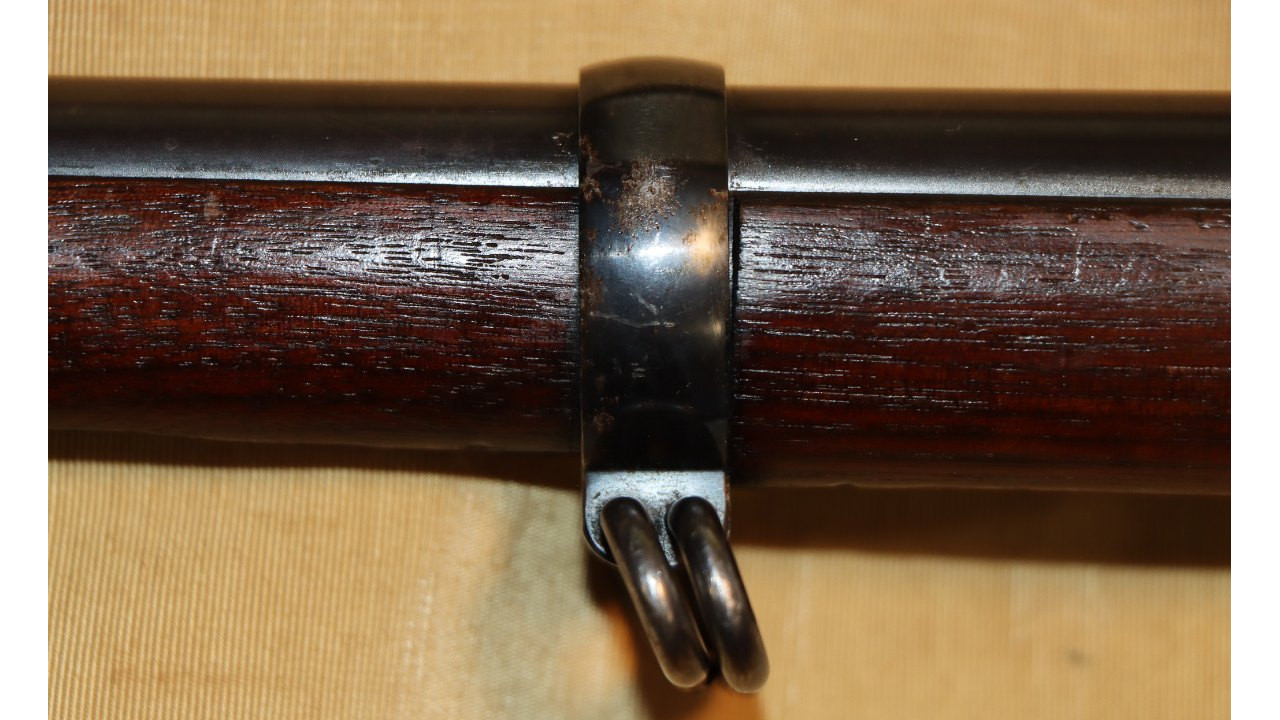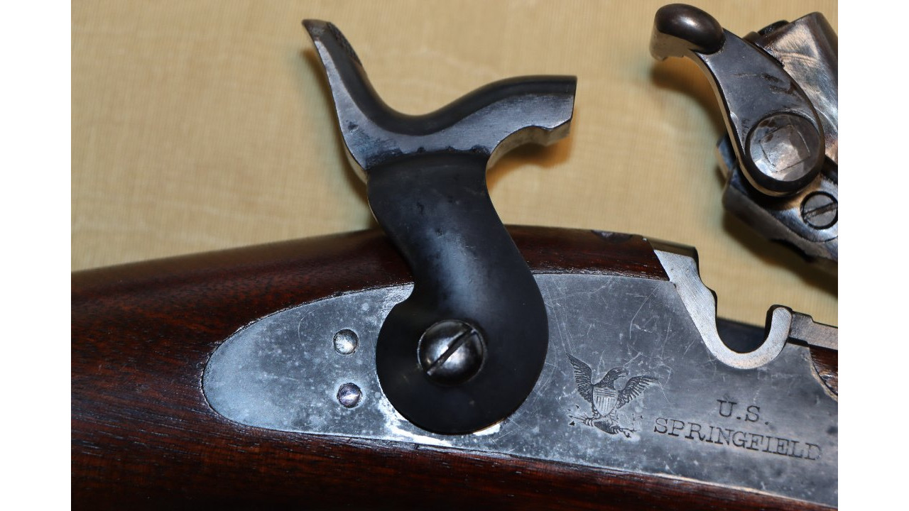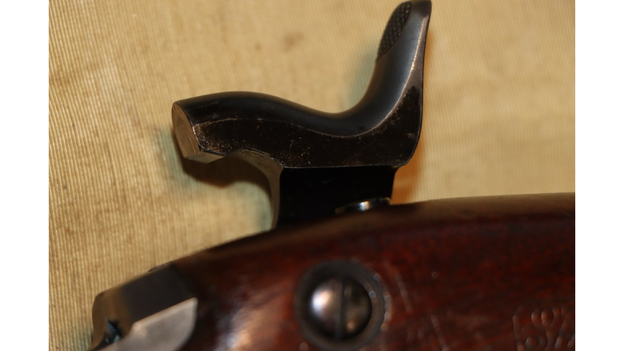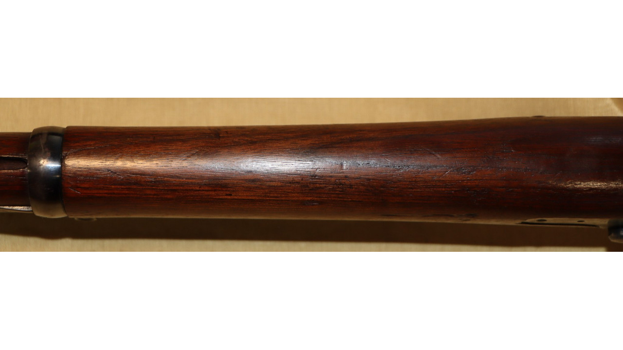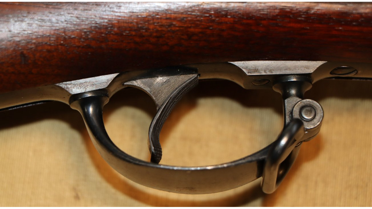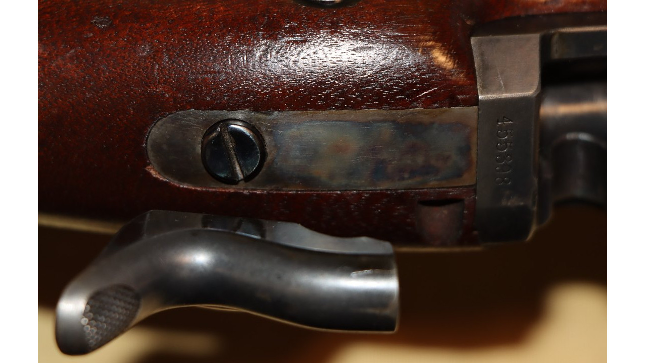 The Trigger Guard is the correct two-piece type used up until the Model 1888 Rifle with the single-piece design was adopted. The Trigger Guard Plate is the correct Model 1863 pattern with rounded pads, which was used almost exclusively on Model 1884 production. The Trigger Guard Bow is the correct Model 1863 pattern. The Trigger Guard Plate, Bow and Sling Swivel all retain the majority of the beautiful pale niter blue finish, which was introduced on furniture at Springfield in 1885 and it is in very fine condition, with only small areas of wear and fine corrosion staining along the edges. Both single-slot wood screws are present, and both retain virtually all of their original blued finish. The Trigger is the correct Second Type with longitudinal grooves and an angled tip that points to the bottom of the guard with cross-hatched grooves. The Trigger retains virtually all of its original oil case-hardened finish with no wear at all on the checkering. The trigger release is still crisp.