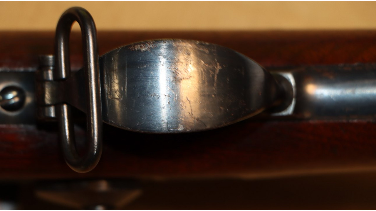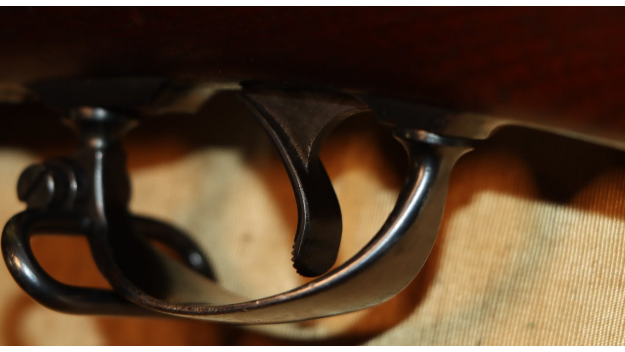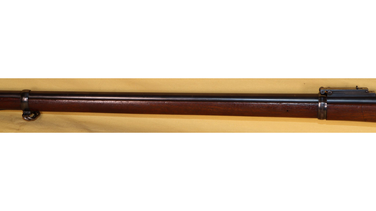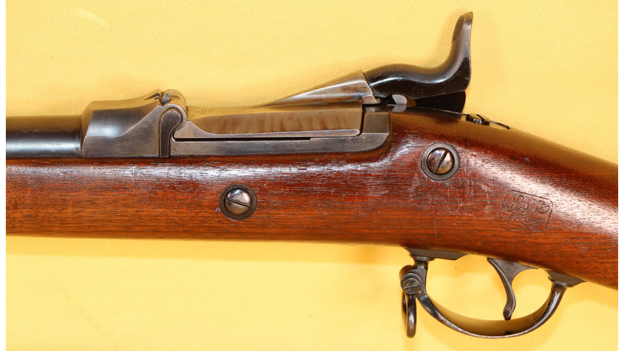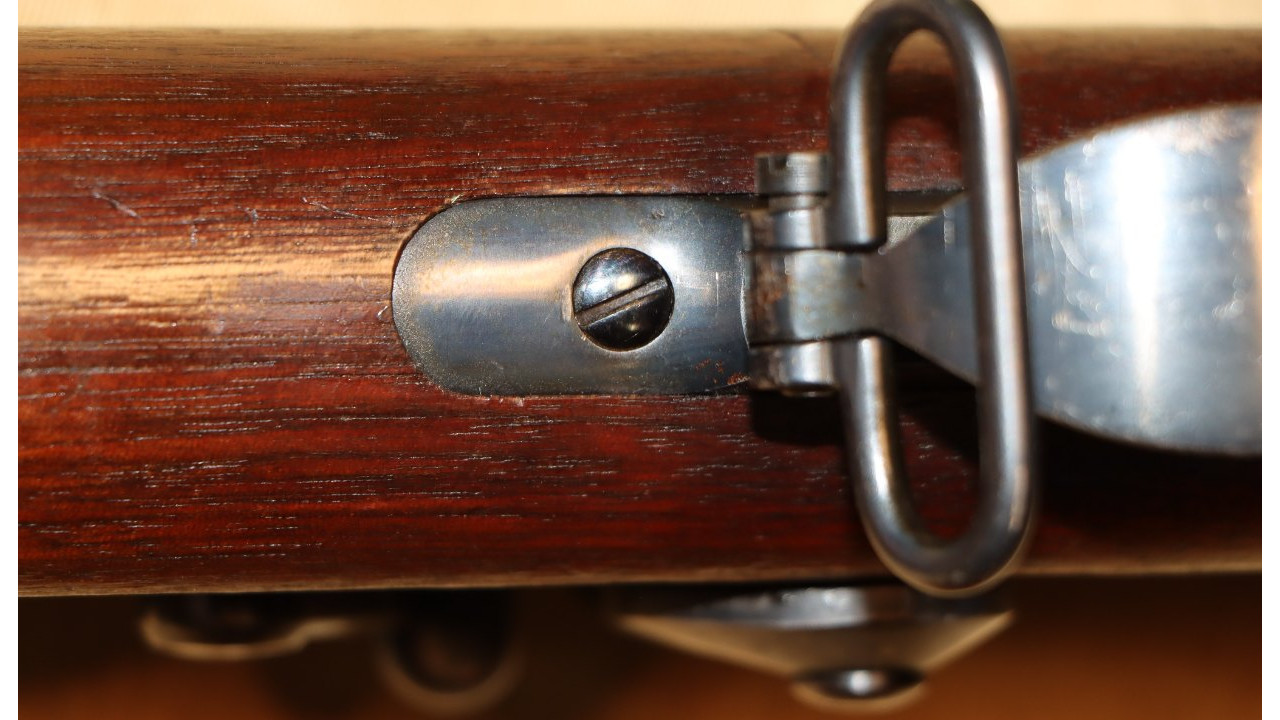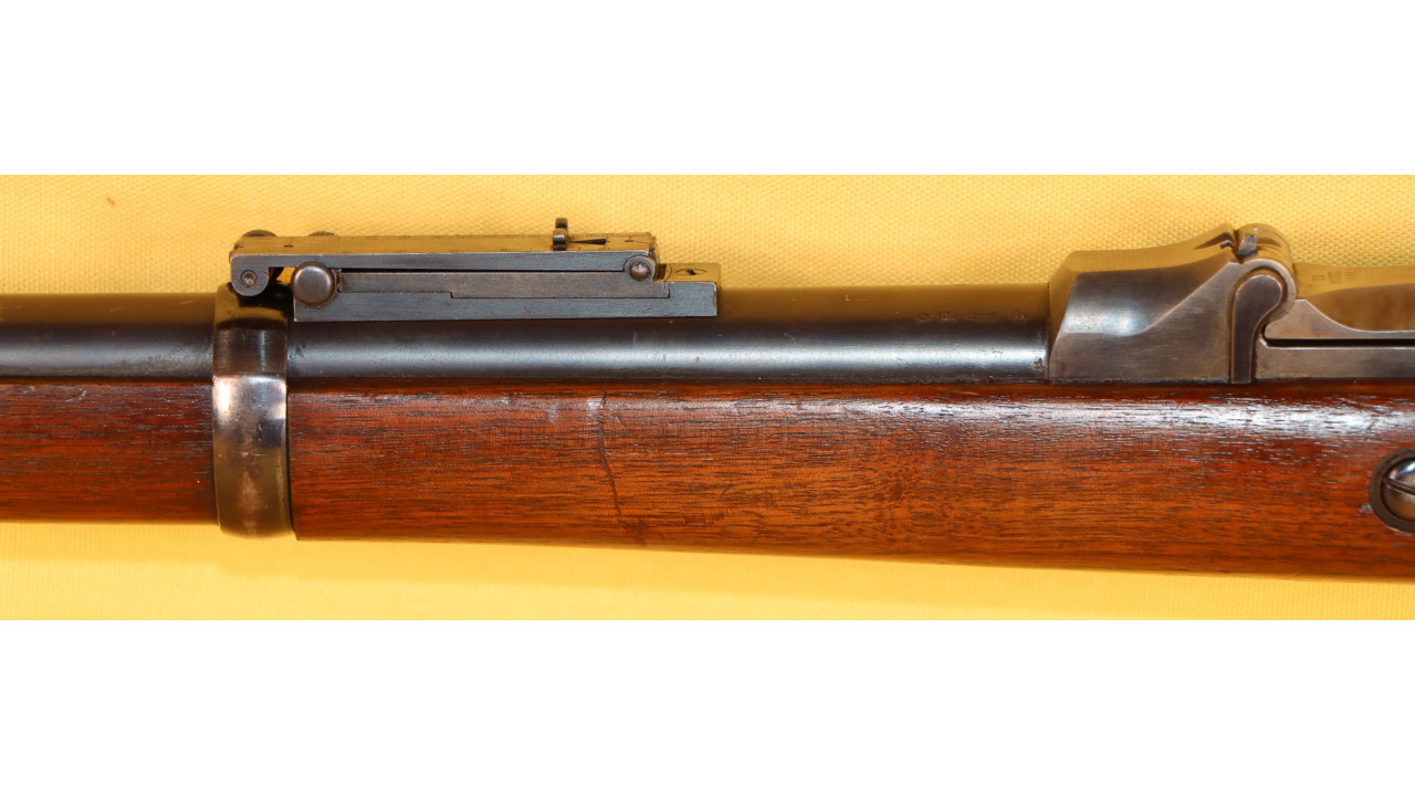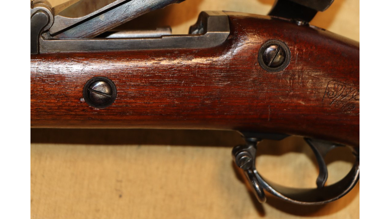 The Trigger Guard is the correct two-piece type used up until the Model 1888 Rifle with the single-piece design was adopted. The Trigger Guard Plate is the correct Model 1863 pattern with rounded pads, which was used almost exclusively on Model 1884 production. The Trigger Guard Bow is the correct Model 1863 pattern. The Trigger Guard Plate, Bow and Sling Swivel all retain the majority of the beautiful pale niter blue finish, which was introduced on furniture at Springfield in 1885 and it is in very fine condition, with only small areas of wear and fine corrosion staining along the edges. Both single-slot wood screws are present, and both retain virtually all of their original blued finish. The Trigger is the correct Second Type with longitudinal grooves and an angled tip that points to the bottom of the guard with cross-hatched grooves. The Trigger retains virtually all of its original oil case-hardened finish with no wear at all on the checkering. The trigger release is still crisp.