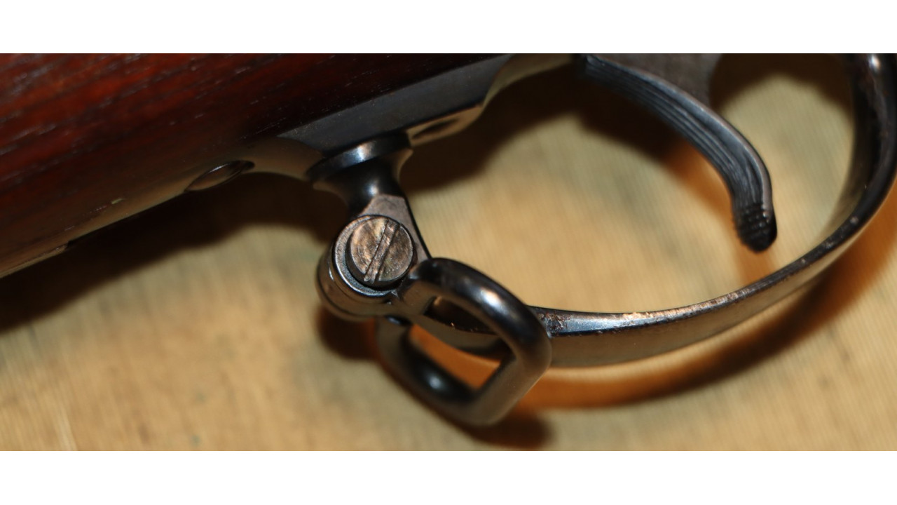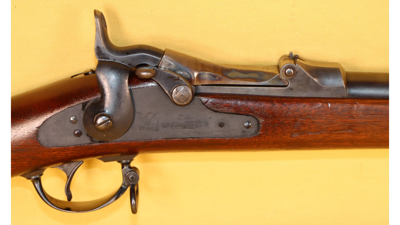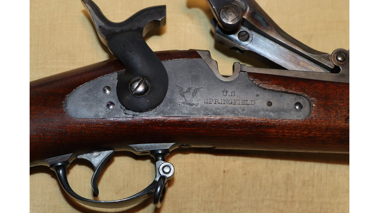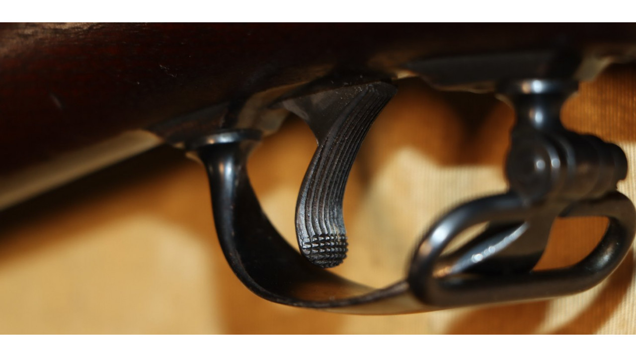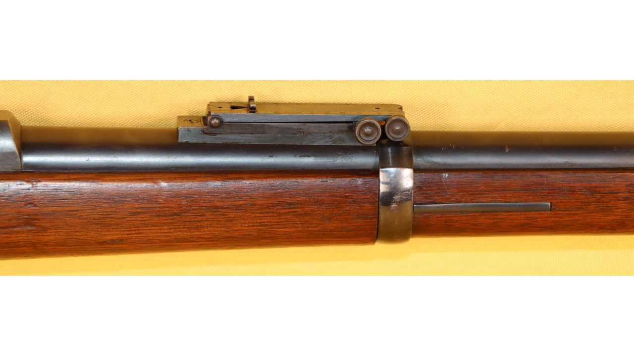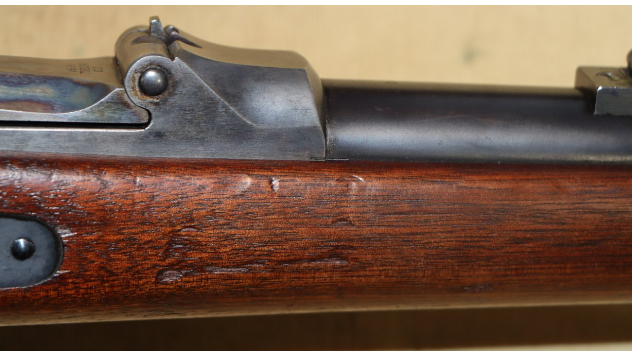 The Trigger Guard is the correct two-piece type used up until the Model 1888 Rifle with the single-piece design was adopted. The Trigger Guard Plate is the correct Model 1863 pattern with rounded pads, which was used almost exclusively on Model 1884 production. The Trigger Guard Bow is the correct Model 1863 pattern. The Trigger Guard Plate, Bow and Sling Swivel all retain the majority of the beautiful pale niter blue finish, which was introduced on furniture at Springfield in 1885 and it is in very fine condition, with only small areas of wear and fine corrosion staining along the edges. Both single-slot wood screws are present, and both retain virtually all of their original blued finish. The Trigger is the correct Second Type with longitudinal grooves and an angled tip that points to the bottom of the guard with cross-hatched grooves. The Trigger retains virtually all of its original oil case-hardened finish with no wear at all on the checkering. The trigger release is still crisp.