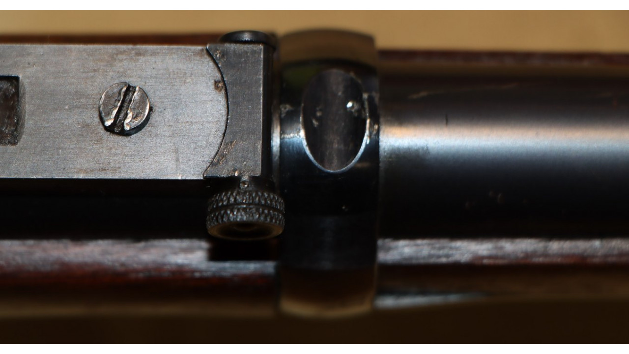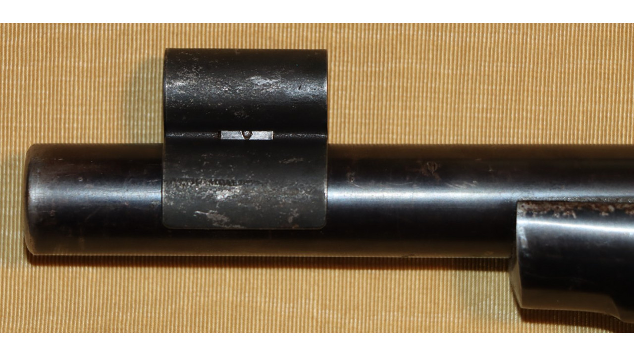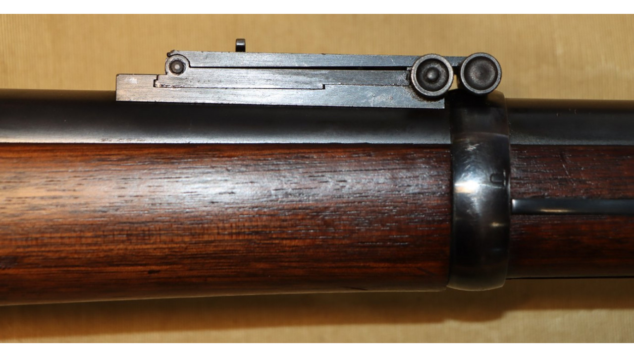 The Front Sight Stud remains tightly brazed to the barrel and it retains 98% of its original blued finish. The Front Sight Blade is the correct Fourth Type with rounded top rear that was used from August 1887 until the end of production. The Front Sight Blade is still tightly pinned into the stud. This rifle also has the Model 1883 Buffington Front Sight Cover installed. The sight protector is in mint condition and retains 98% of its original blued finish.