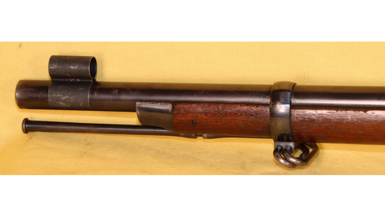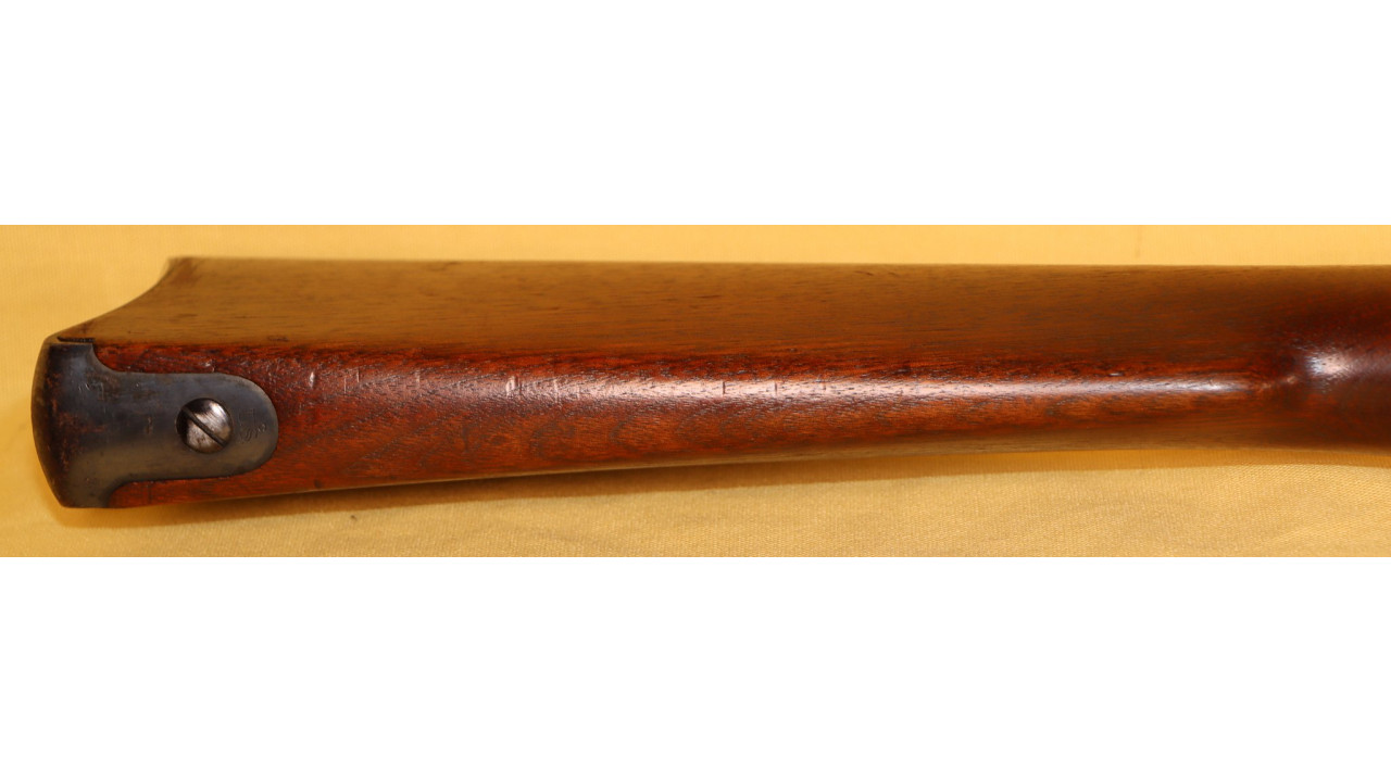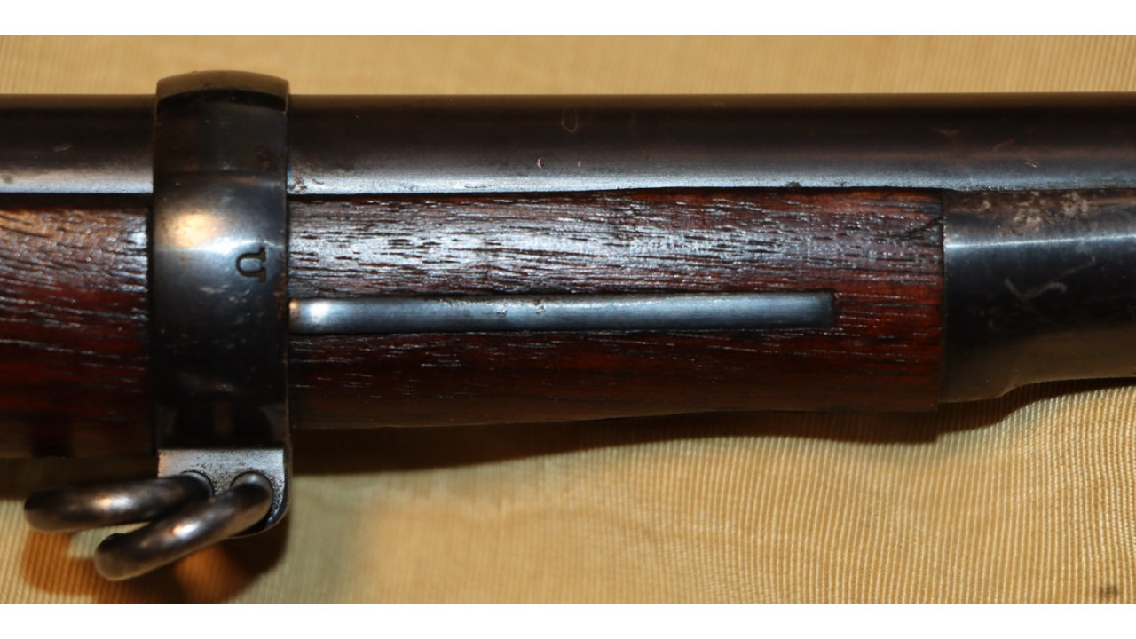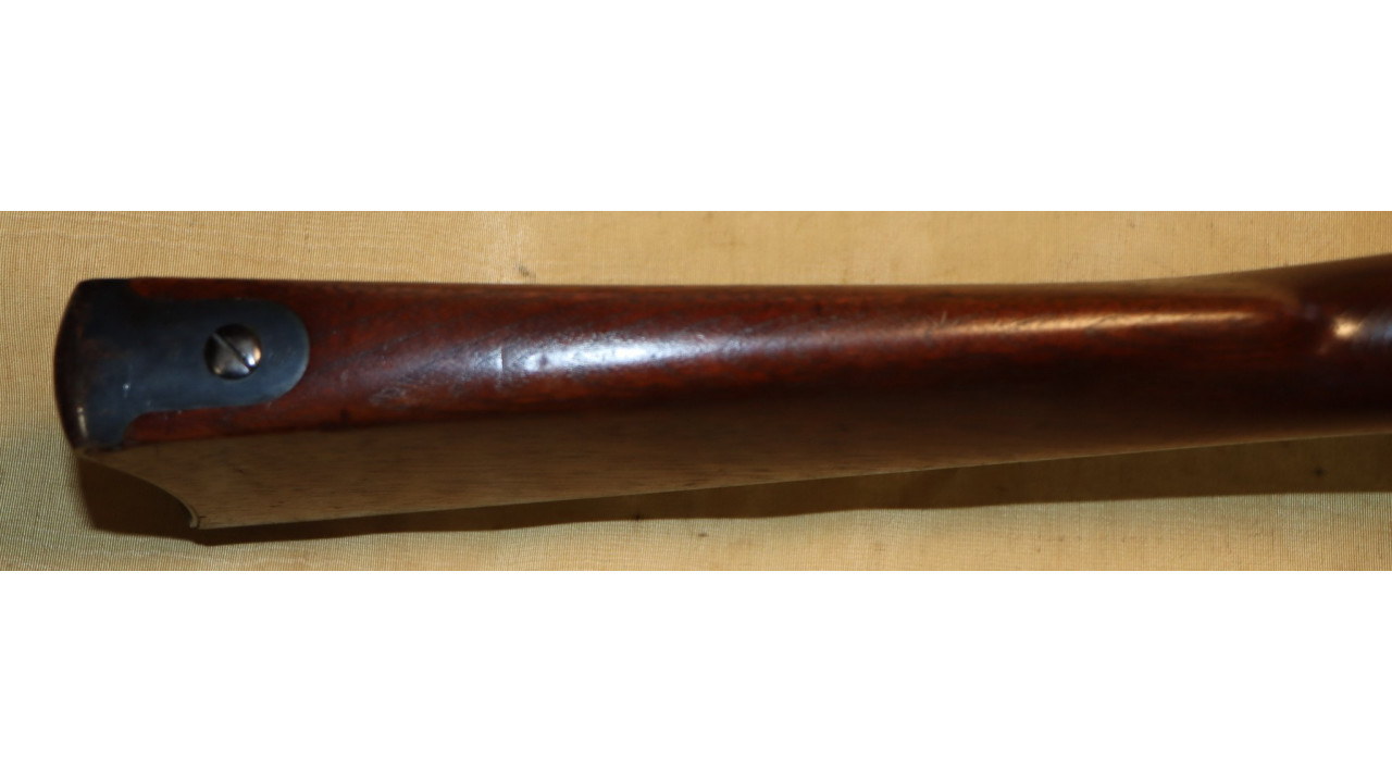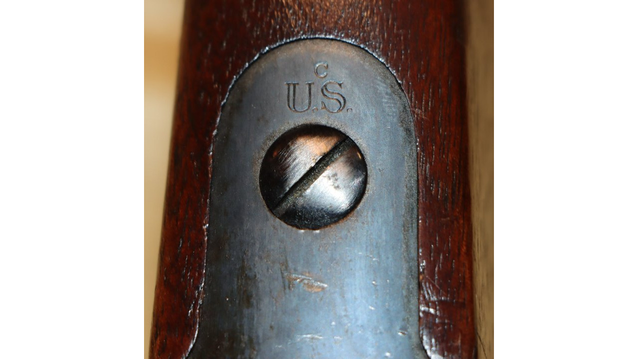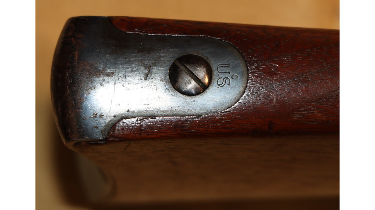 The Nose Cap is still solidly in place and retains 98% of its original finish. The ramrod retainer is in mint condition. The correct Model 1877 Rifle Butt Plate is present, and the tang retains 90% of its original blue finish with numerous small old corrosion staining spots, particularly at the bend, where there is some pitting present. The tang is stamped with the serif “U.S.” stamp, below a serif “C” inspection stamp. The back side of the butt plate retains 90% of the original blue finish. Both original butt plate screws are present, and both retain considerable original blued finish with unmarred slots. There is wear at the shoulder of the butt plate and there are isolated areas of old staining on the back of the plate. The stock carries the correct and mint condition Model 1878 Rifle Ramrod, Second Type, with cupped end. The ramrod retains 99% plus of its original blued finish and still attaches securely when stowed. All of the original finger cannelures at the other end of the ramrod remain crisply machined.