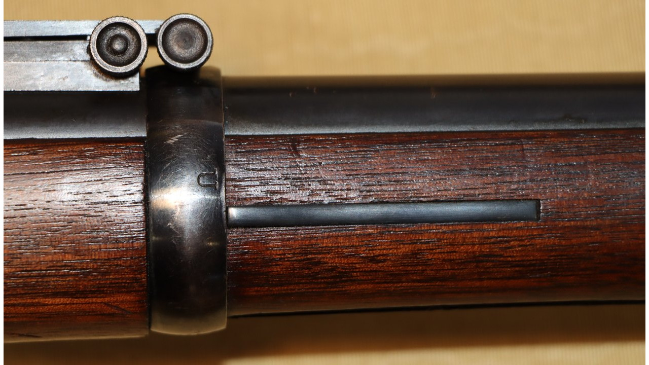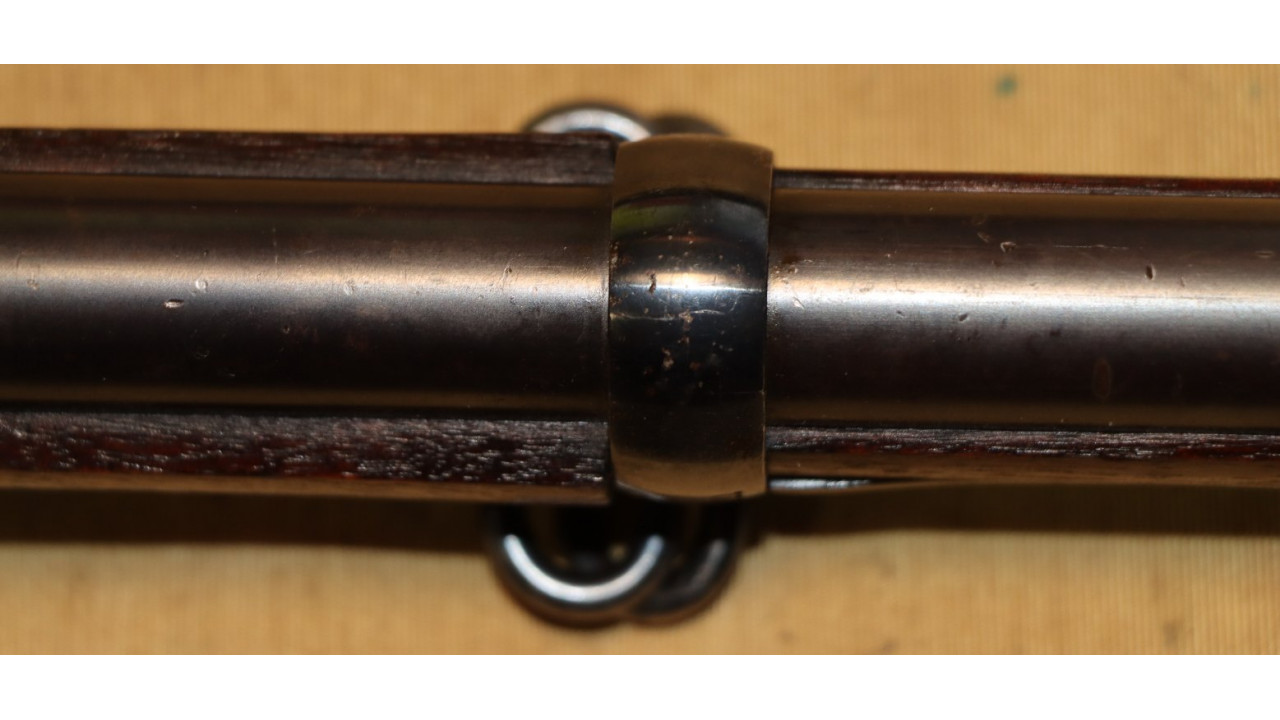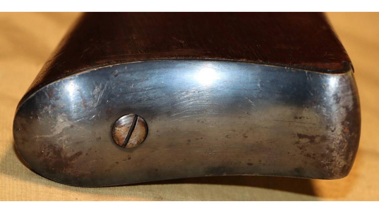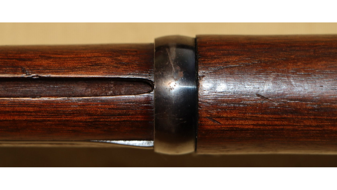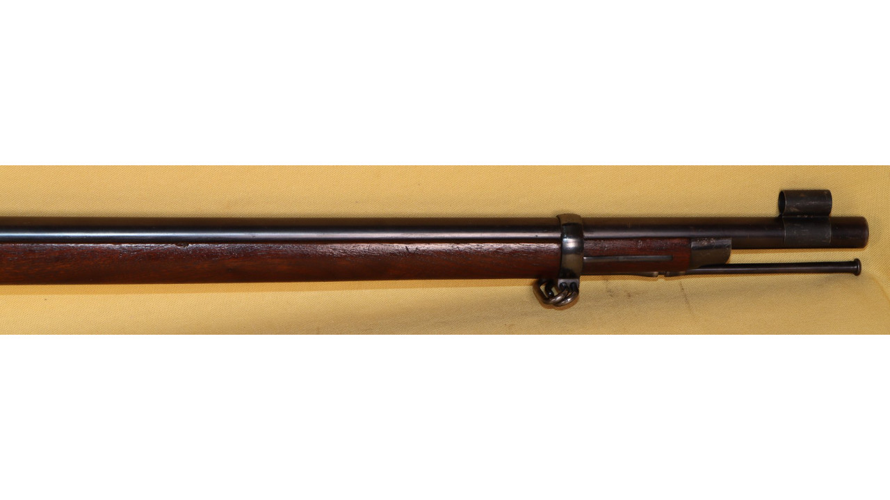 The Nose Cap is still solidly in place and retains 98% of its original finish. The ramrod retainer is in mint condition. The correct Model 1877 Rifle Butt Plate is present, and the tang retains 90% of its original blue finish with numerous small old corrosion staining spots, particularly at the bend, where there is some pitting present. The tang is stamped with the serif “U.S.” stamp, below a serif “C” inspection stamp. The back side of the butt plate retains 90% of the original blue finish. Both original butt plate screws are present, and both retain considerable original blued finish with unmarred slots. There is wear at the shoulder of the butt plate and there are isolated areas of old staining on the back of the plate. The stock carries the correct and mint condition Model 1878 Rifle Ramrod, Second Type, with cupped end. The ramrod retains 99% plus of its original blued finish and still attaches securely when stowed. All of the original finger cannelures at the other end of the ramrod remain crisply machined.