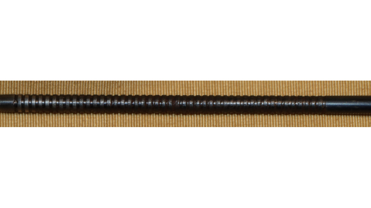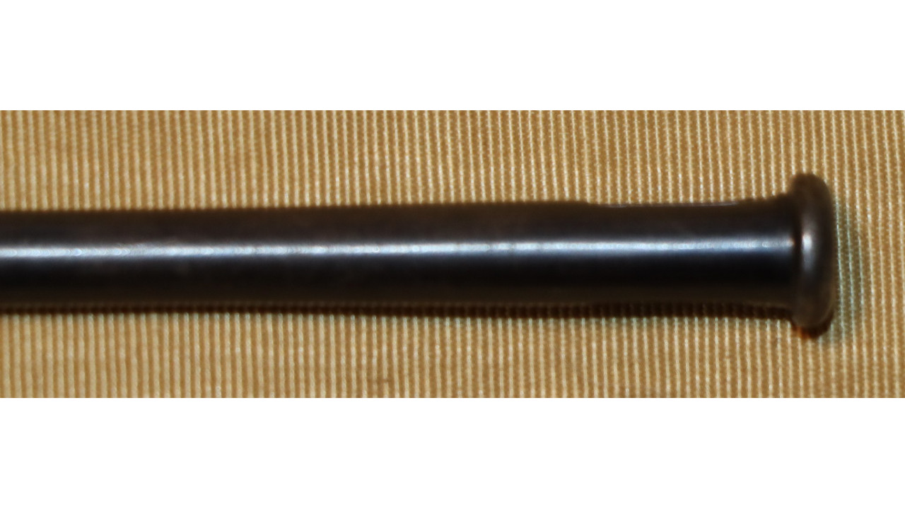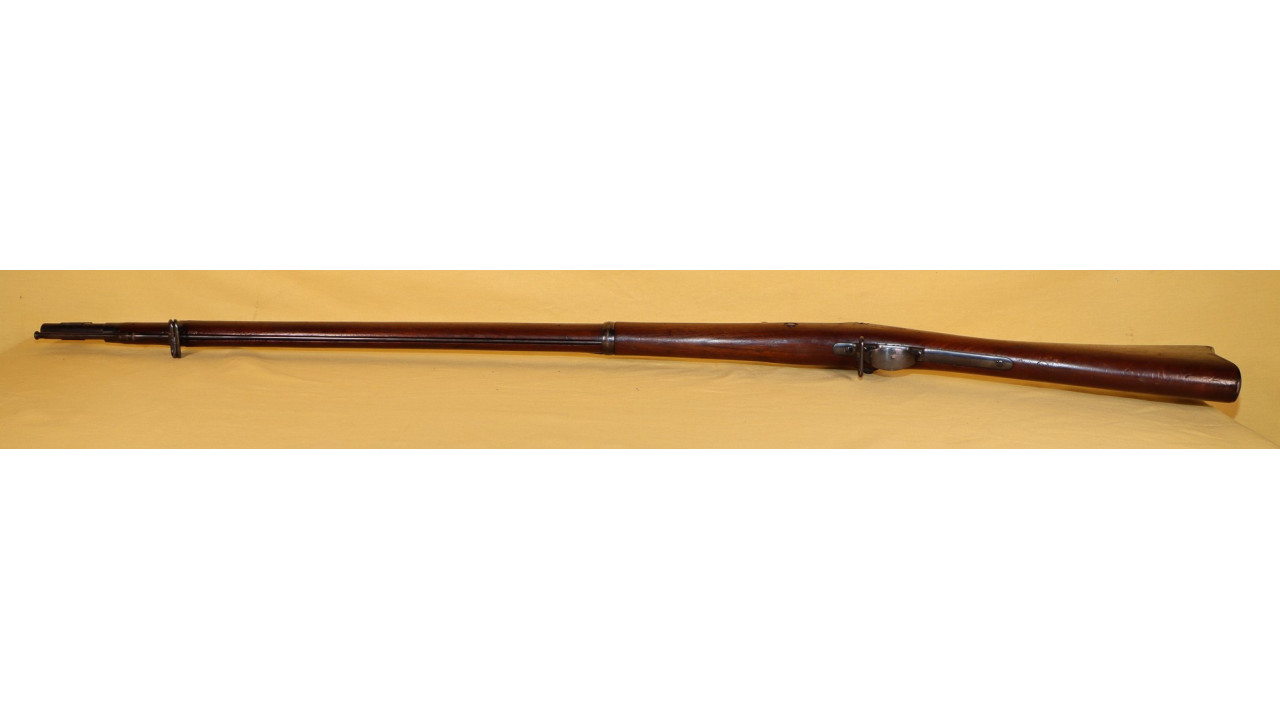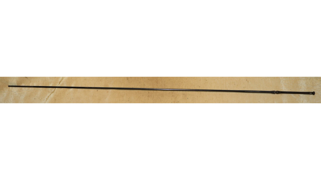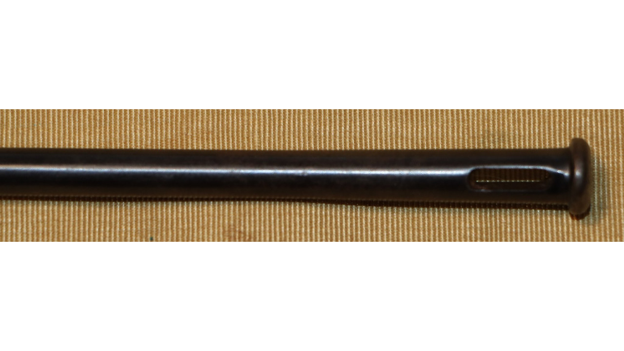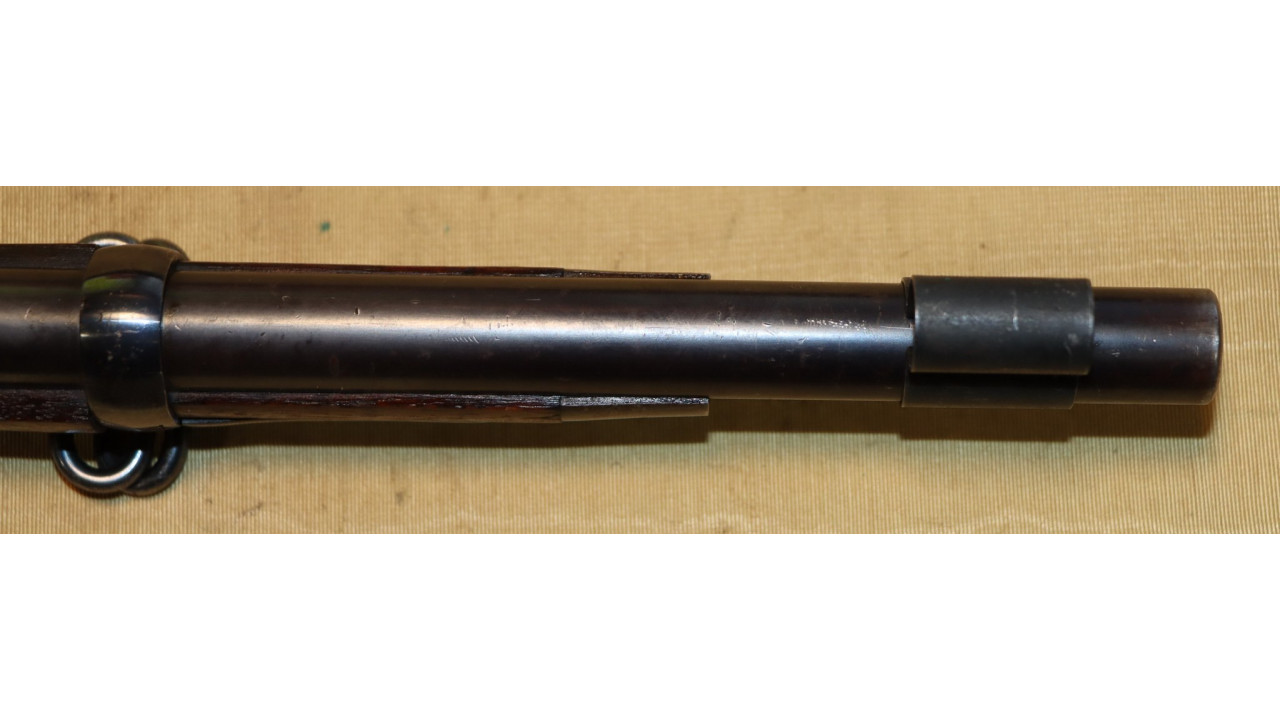 The Nose Cap is still solidly in place and retains 98% of its original finish. The ramrod retainer is in mint condition. The correct Model 1877 Rifle Butt Plate is present, and the tang retains 90% of its original blue finish with numerous small old corrosion staining spots, particularly at the bend, where there is some pitting present. The tang is stamped with the serif “U.S.” stamp, below a serif “C” inspection stamp. The back side of the butt plate retains 90% of the original blue finish. Both original butt plate screws are present, and both retain considerable original blued finish with unmarred slots. There is wear at the shoulder of the butt plate and there are isolated areas of old staining on the back of the plate. The stock carries the correct and mint condition Model 1878 Rifle Ramrod, Second Type, with cupped end. The ramrod retains 99% plus of its original blued finish and still attaches securely when stowed. All of the original finger cannelures at the other end of the ramrod remain crisply machined.