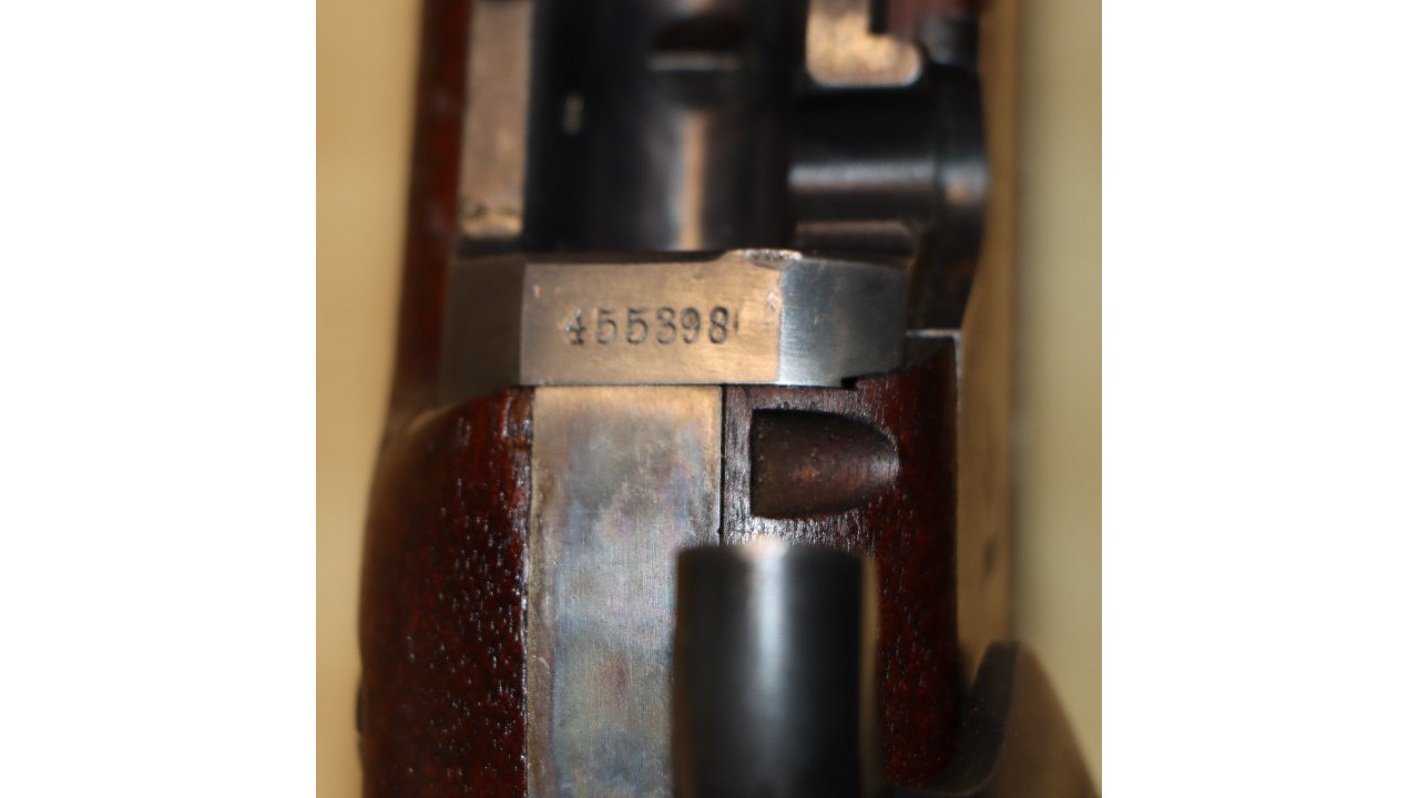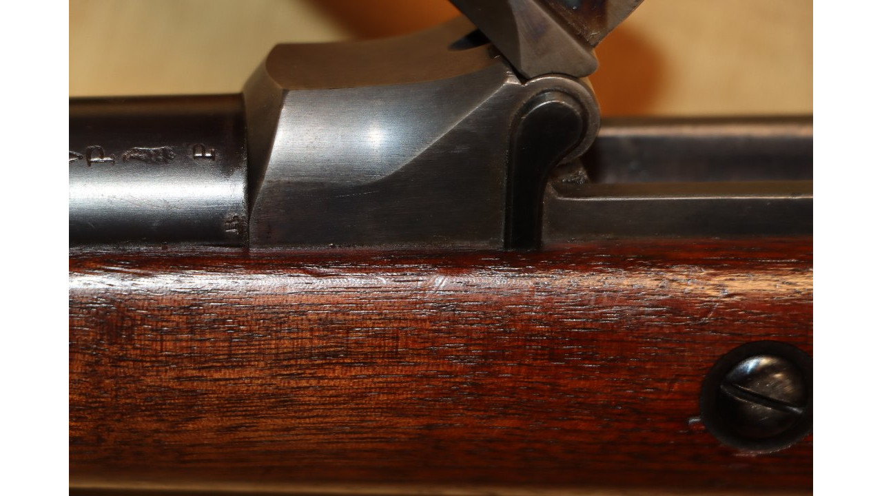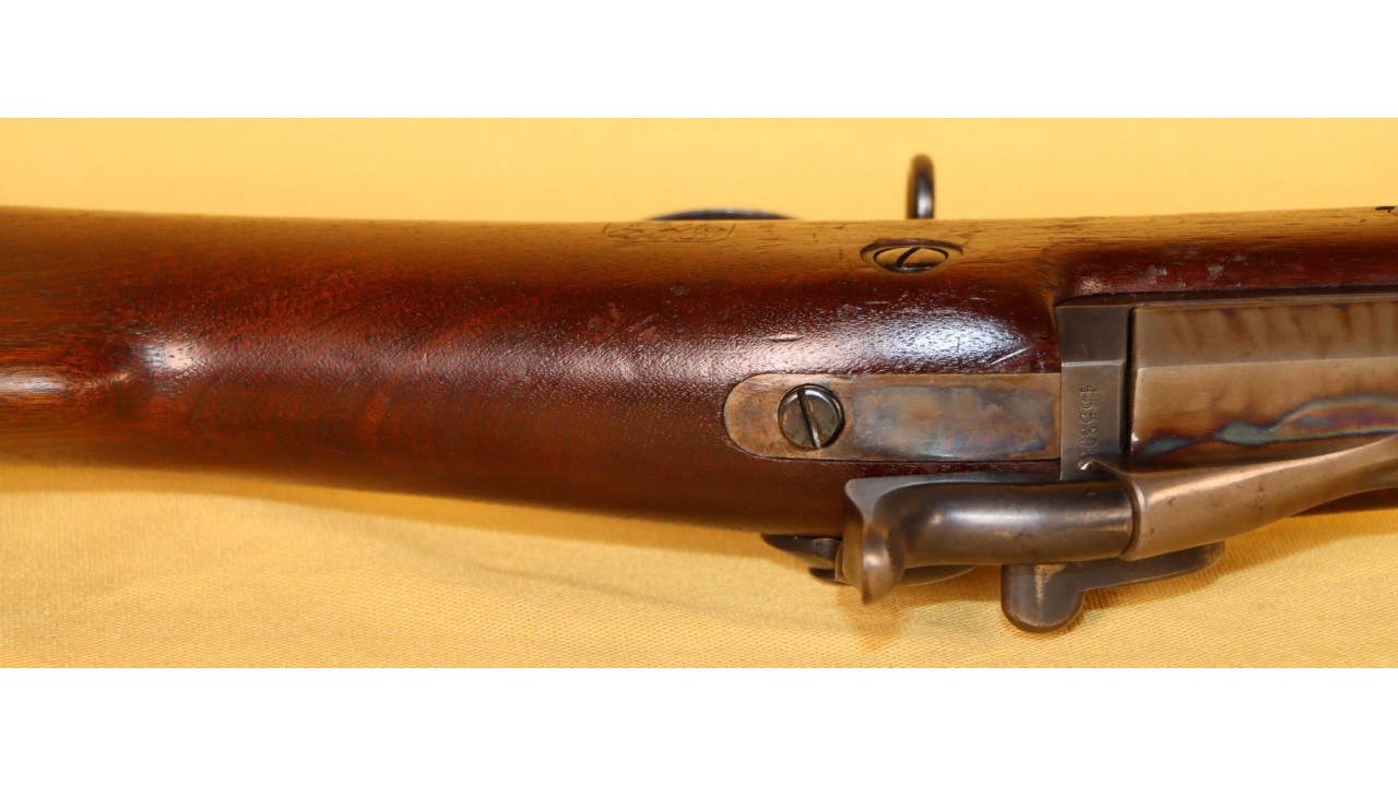 The Receiver is the correct .45-70 type with gas ports milled into both the left and right sides. The breech block recess area is in very fine condition and retains 99% of the original blue finish. The rear of the Receiver has the full serial number “455398,” without the characteristic wear mark adjacent to the last number from the cam latch assembly, which is an indication that this rifle was seldom used. The Receiver remains in fine condition and retains 98% of its original dark, oil case hardened finish.