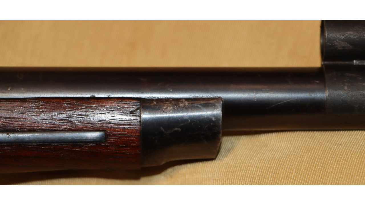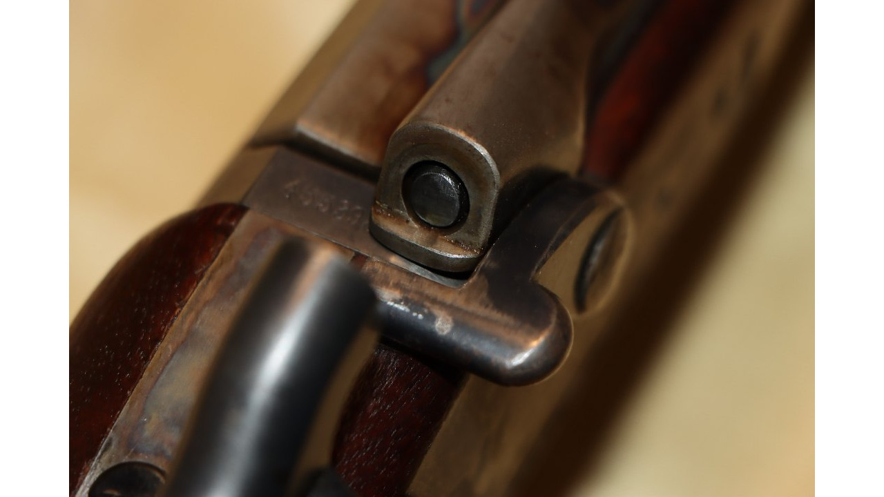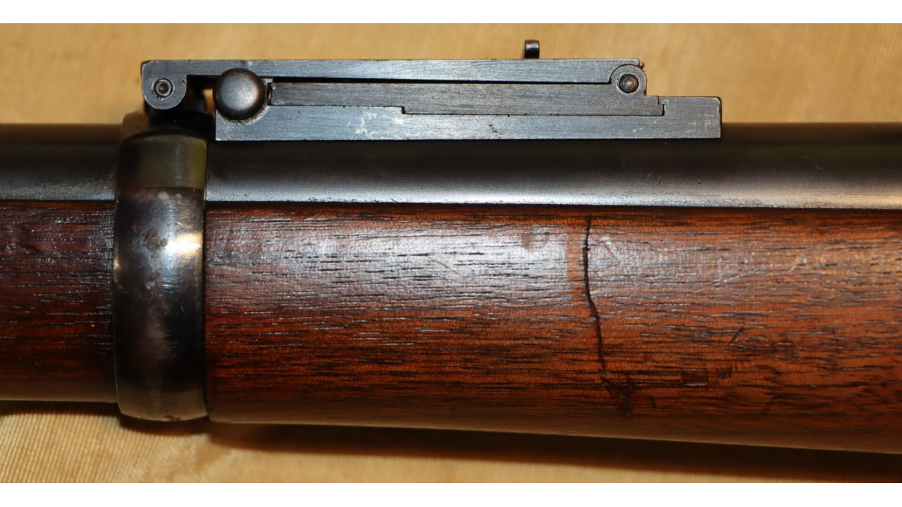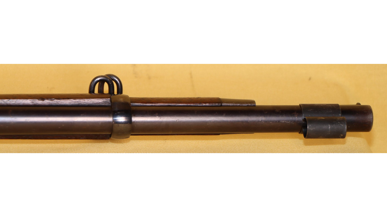 The Receiver is the correct .45-70 type with gas ports milled into both the left and right sides. The breech block recess area is in very fine condition and retains 99% of the original blue finish. The rear of the Receiver has the full serial number “455398,” without the characteristic wear mark adjacent to the last number from the cam latch assembly, which is an indication that this rifle was seldom used. The Receiver remains in fine condition and retains 98% of its original dark, oil case hardened finish.