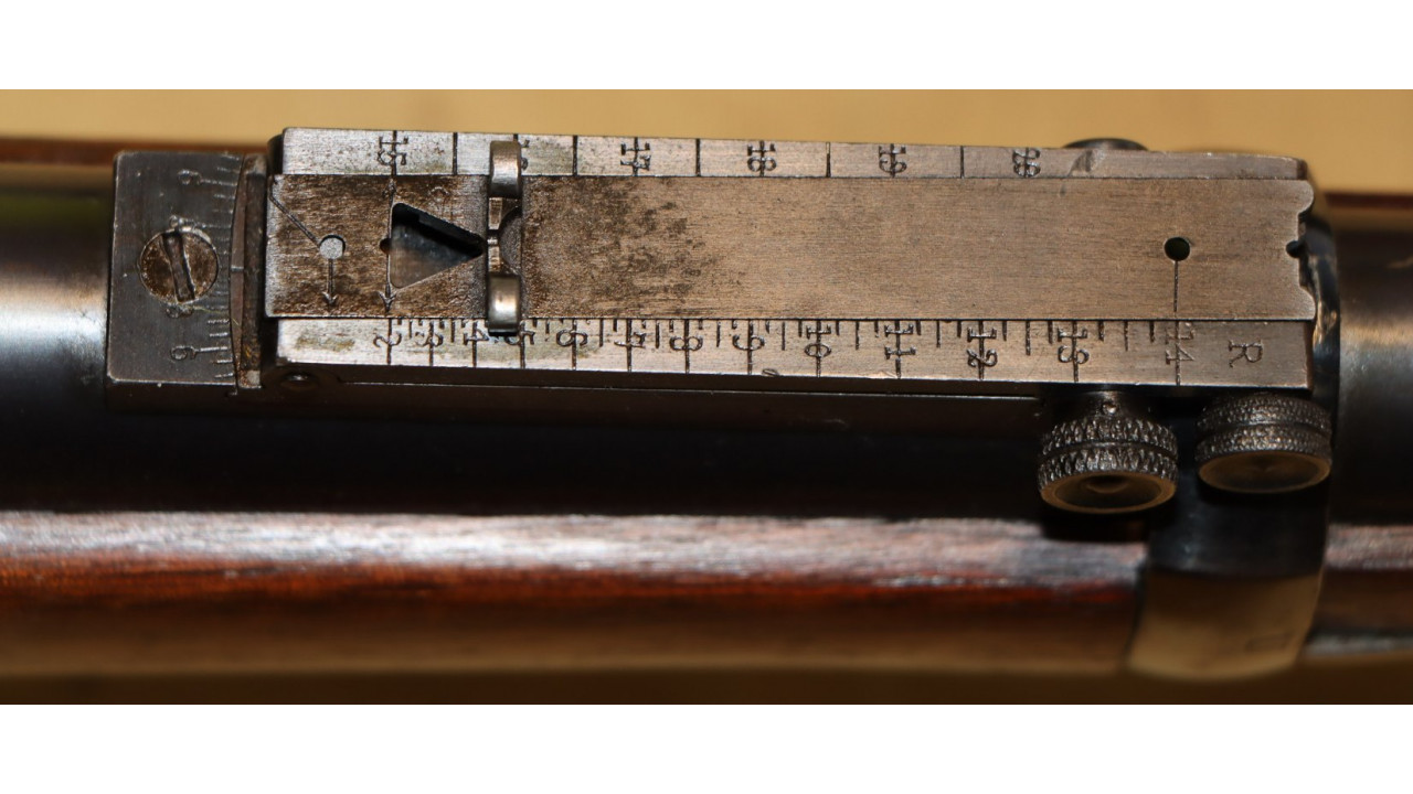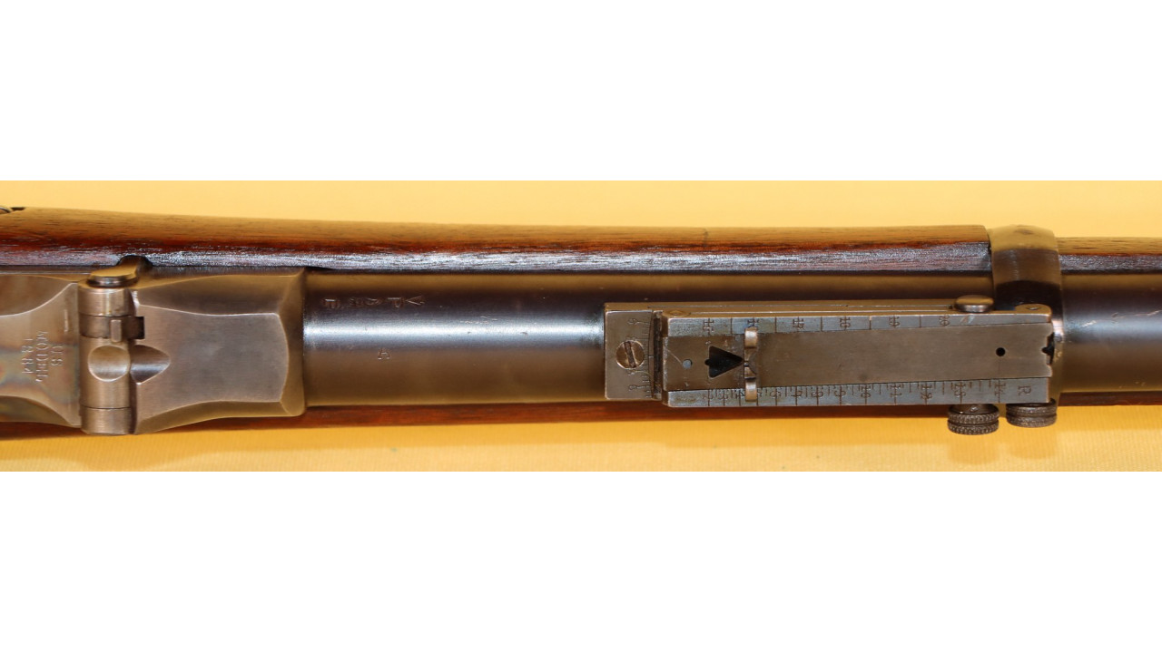 The Rear Sight is a mint condition and correct Model 1884 Rifle Sight, also known as the Buffington Rear Sight. This particular sight is the Second Variation. The sight is graduated to 2,000 yards with the leaf marked in 25-yard increments from 200 to 1,400 yards on the right and in 50-yard increments from 15,00 to 2,000 yards on the left. The right side, top of the leaf has the correct serif “R” for rifle stamp. The open “buckhorn” sight is on the slide, which was used for rolling fire set at 266 yards. The top of the slide has the second open sight, which is a “u” shaped aperture. The bottom of the arrow shaped opening at the bottom of the slide is the third “u” shaped open aperture. There are two closed apertures, one at the top and one at the bottom. Both arrow lines, (on the right for the right-side range markings; and the angled line on the left for the left-side range markings) are still visible. Both the Windage Knob and Binding Knob retain all of their original finish as does the leaf, slide and rear sight base. The single-slot base screw is unmarred. The Rear Sight is in very fine condition.
