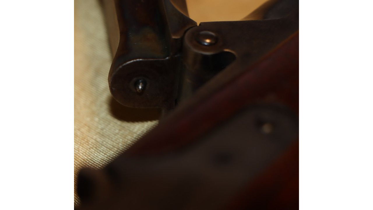 The Lock Plate is the correct Third Type with the large shield on the eagle. Both the eagle and the serif “U.S./SPRINGFIELD” stampings remain clear. The lock plate is in mint condition and retains all of its original blued finish. The Hammer is the correct Third Type with beveled lip. The cross hatching on the thumb piece is still crisply cut. The Hammer retains 95% of its original oil case-hardened finish as does the Hammer Screw, which is the correct single slot type. The Hammer, and Tumbler, works correctly in all three positions and the Main Spring remains strong. Both original Lock Screws retain virtually all of their original tempered blue finish.