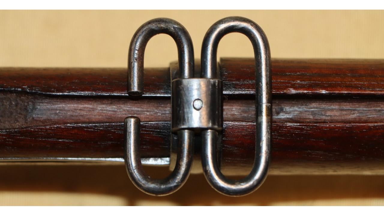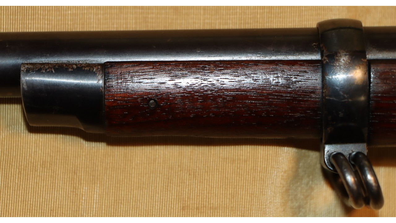 The Lower Band is the correct Model 1885 Lower Band with the dish at the top to accommodate the Model 1884 Rear Sight. The Band is correctly marked with the serif “U” stamp, and it retains 98% of its original niter blue finish and is in mint condition. The Lower Band Spring retains 99% of its original blue finish. The Upper Band is the correct Model 1874 Rifle Upper Barrel Band with the larger “U” stamp, which was incorporated in 1879. The Band retains 99% of its original niter blue finish. The Lug also retains the majority of its niter blue finish, and the lug pin remains solidly in place. Both the sling swivel and stacking swivel are present and both retain the vast majority of their original niter blue finish. The Front Band Spring retains 99% of its original blued finish and both bands remain solidly on the stock.