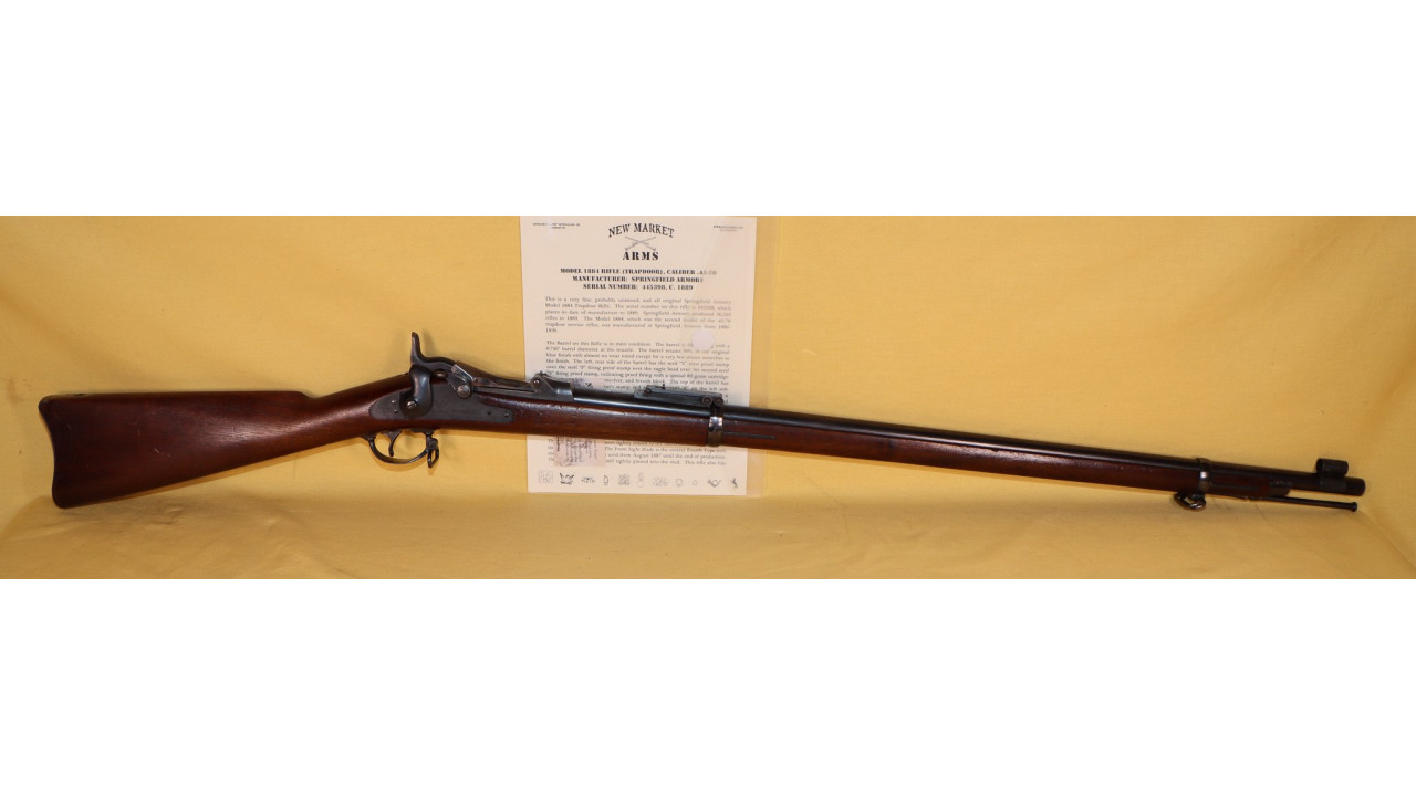 This is a very fine, probably unissued, and all original Springfield Armory Model 1884 Trapdoor Rifle. The serial number on this rifle is 445398, which places its date of manufacture to 1888. Springfield Armory produced 35,025 rifles in 1888. The Model 1884, which was the second model of the .45-70 trapdoor service rifles, was manufactured at Springfield Armory from 1886-1890.