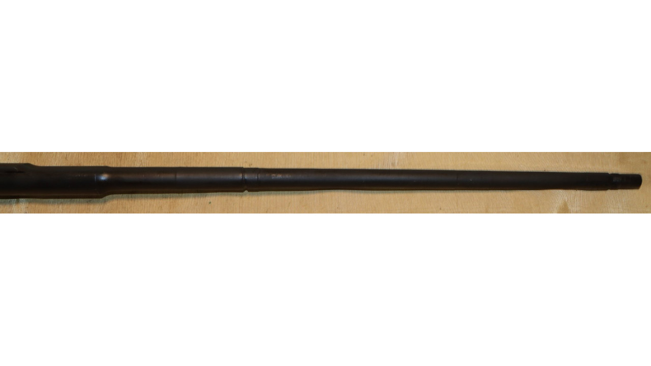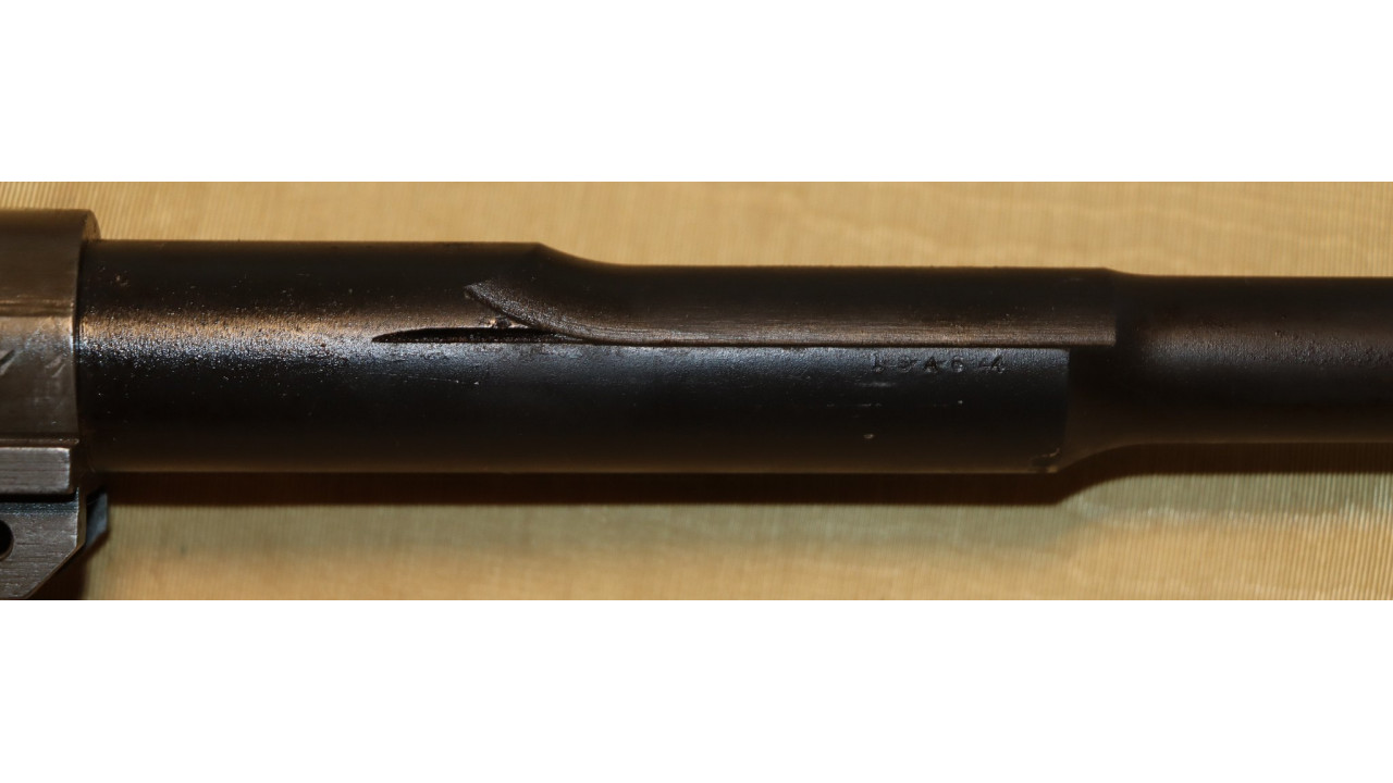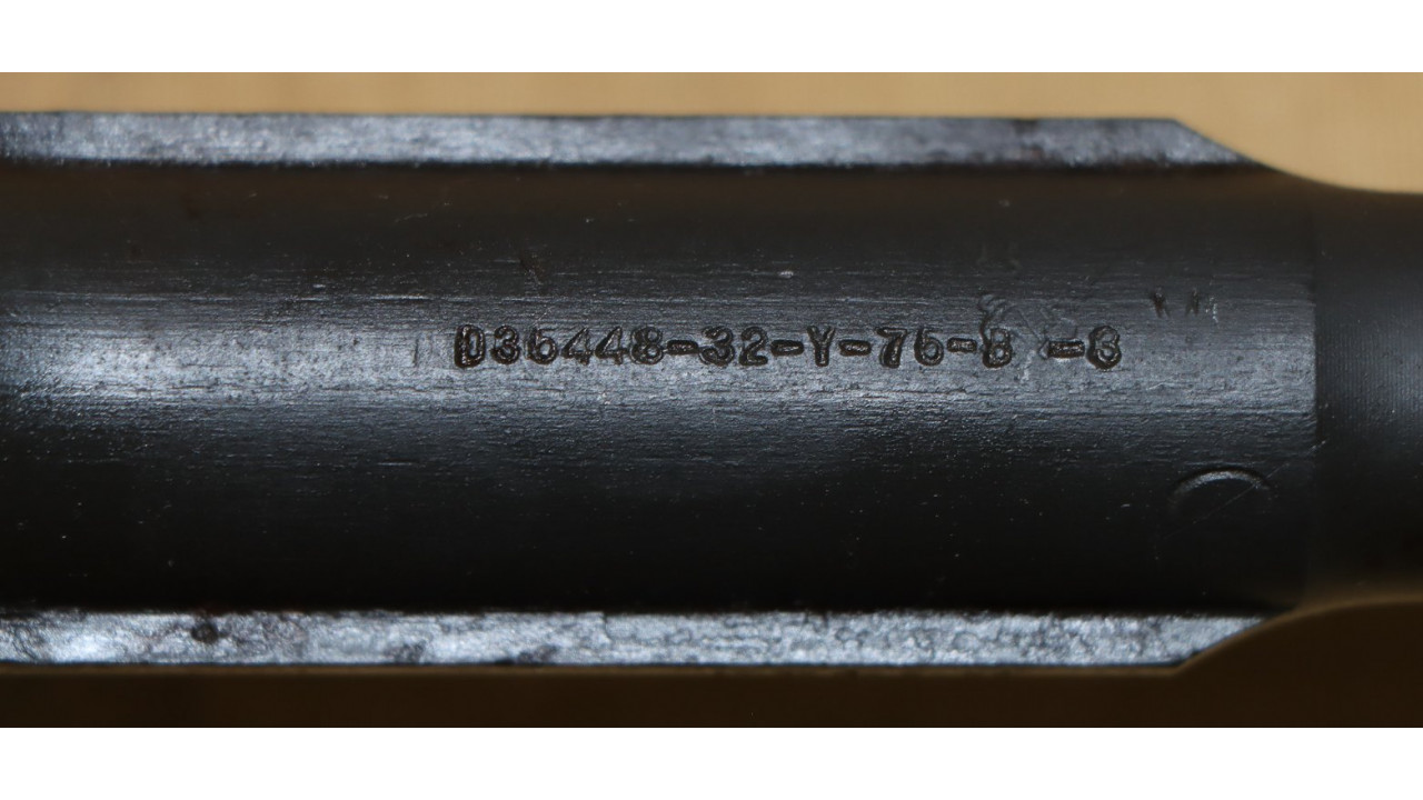 The barrel is the original Springfield armory manufactured barrel that is marked “1-S-A 6 44,” on the right side just below the hand guard line. The barrel also has a proof mark P and hardness test punch mark. The pads retain their original parkerized finish and have not been chrome plated. There is slight wear on the pad with the gas hole but it and the other pads still retain 95% plus of the original finish. The top of the barrel has the drawing number “D35448-32-Y-75-B-3.” The barrel retains approximately 98% of its parkerized finish. The barrel has strong rifling and a very shiny bore with evidence of copper fouling in the grooves, and it gauges “0” at the muzzle. There is minor throat erosion with the chamber measuring 3.0. The barrel is in excellent condition and would make a very accurate shooting rifle.