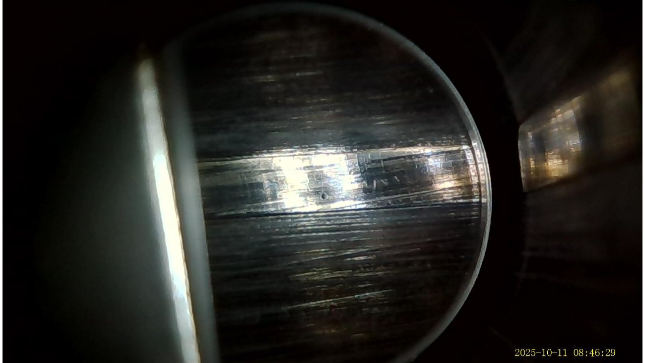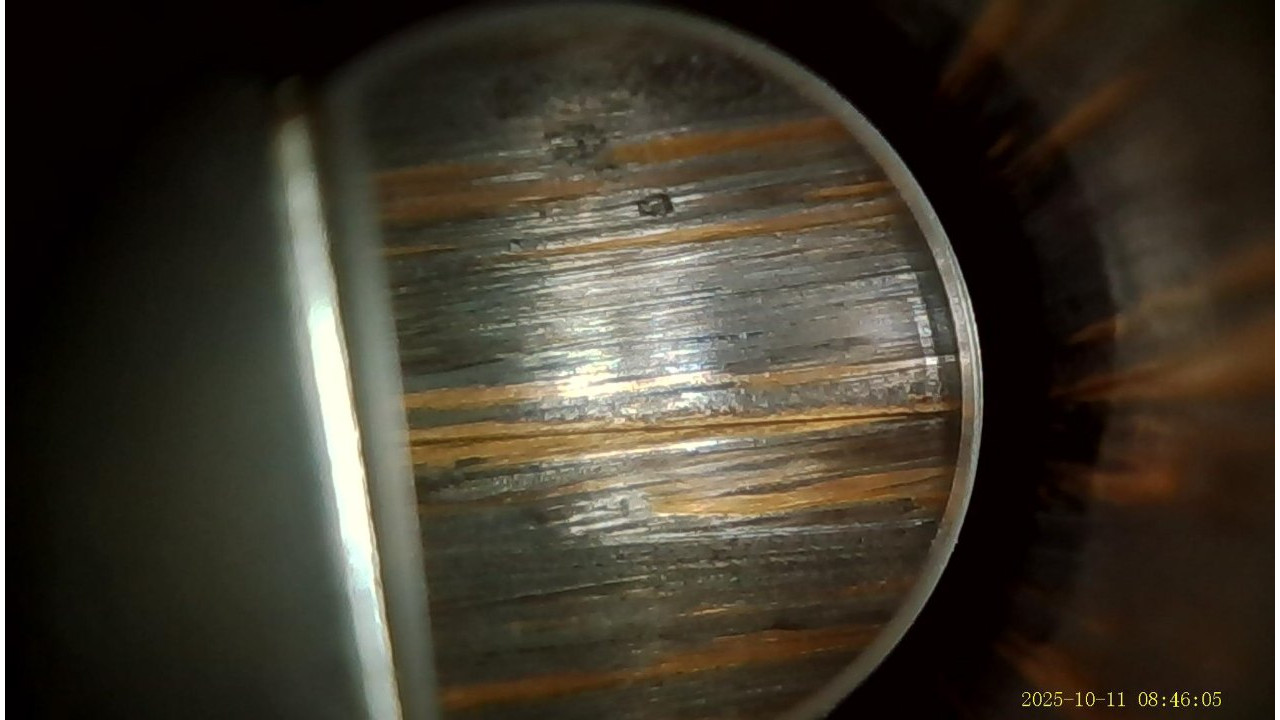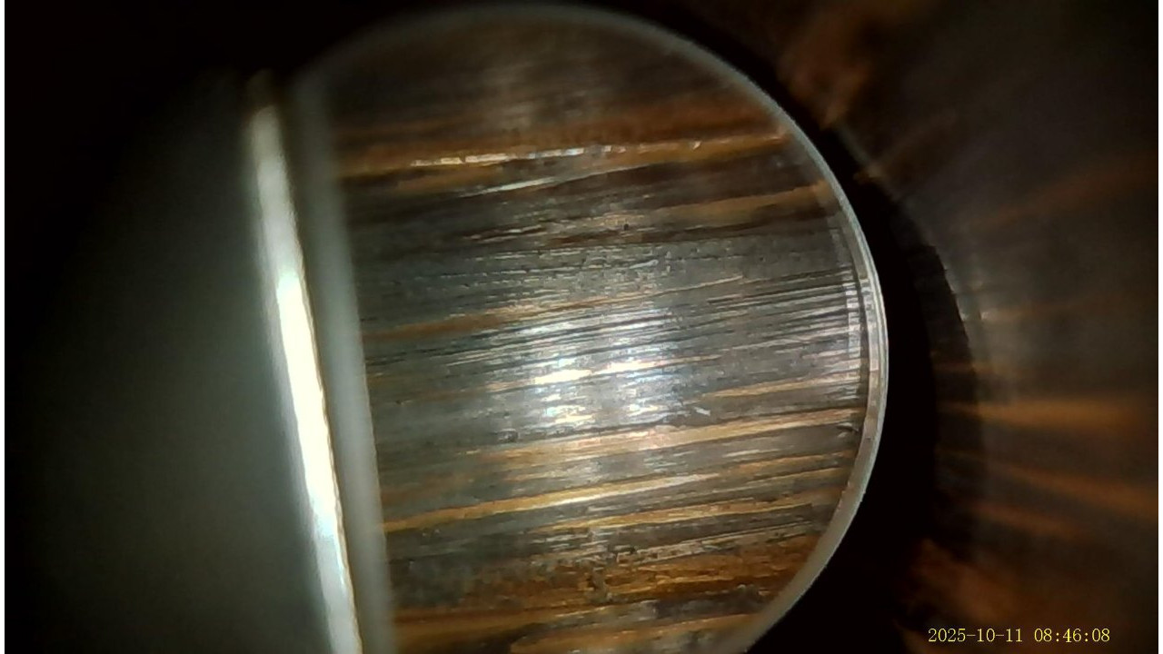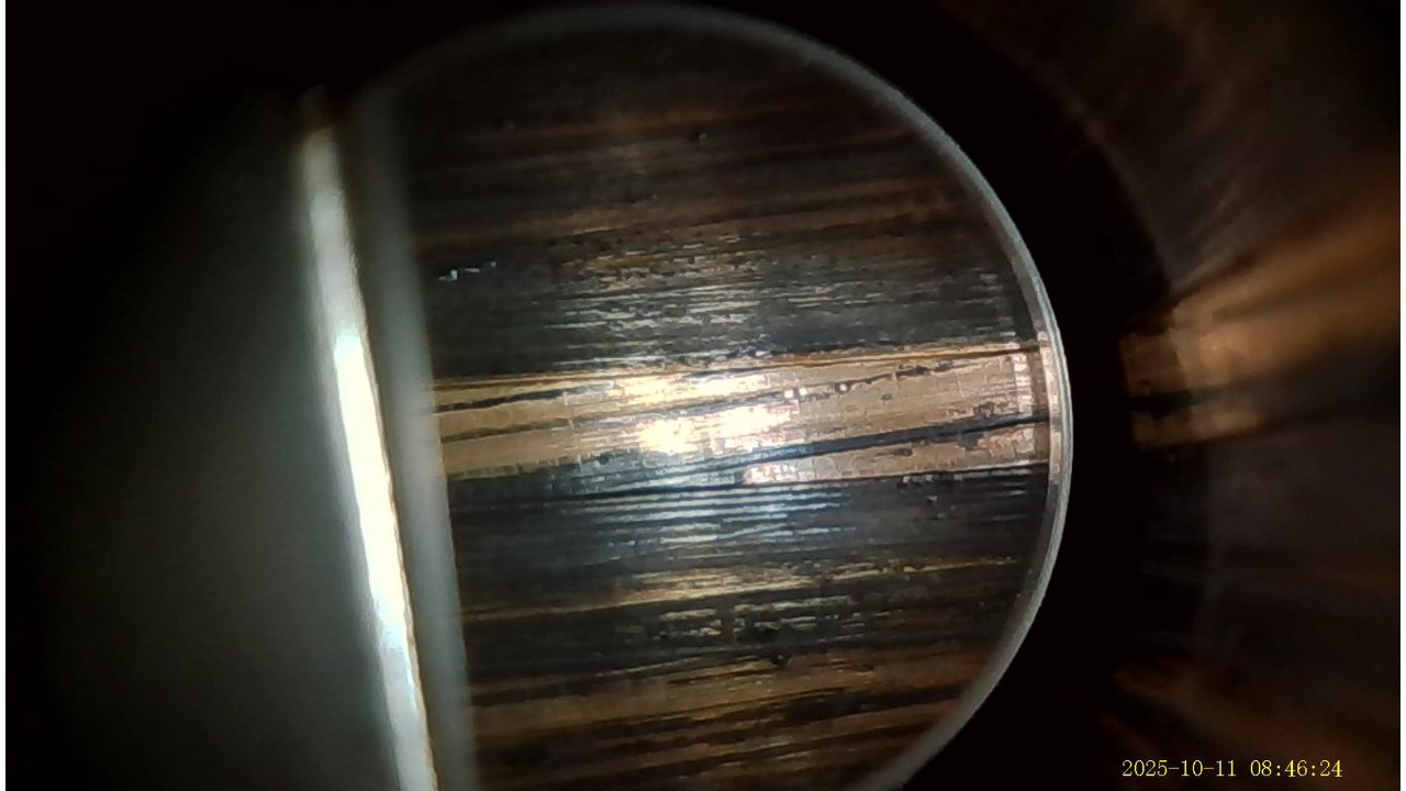 The barrel is the original Springfield armory manufactured barrel that is marked “1-S-A 6 44,” on the right side just below the hand guard line. The barrel also has a proof mark P and hardness test punch mark. The pads retain their original parkerized finish and have not been chrome plated. There is slight wear on the pad with the gas hole but it and the other pads still retain 95% plus of the original finish. The top of the barrel has the drawing number “D35448-32-Y-75-B-3.” The barrel retains approximately 98% of its parkerized finish. The barrel has strong rifling and a very shiny bore with evidence of copper fouling in the grooves, and it gauges “0” at the muzzle. There is minor throat erosion with the chamber measuring 3.0. The barrel is in excellent condition and would make a very accurate shooting rifle.