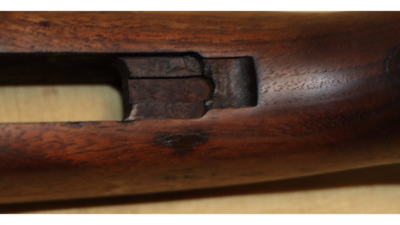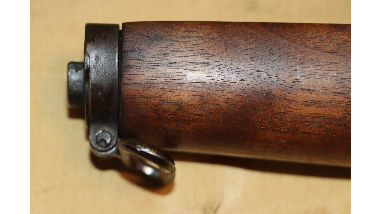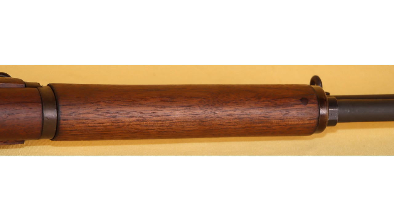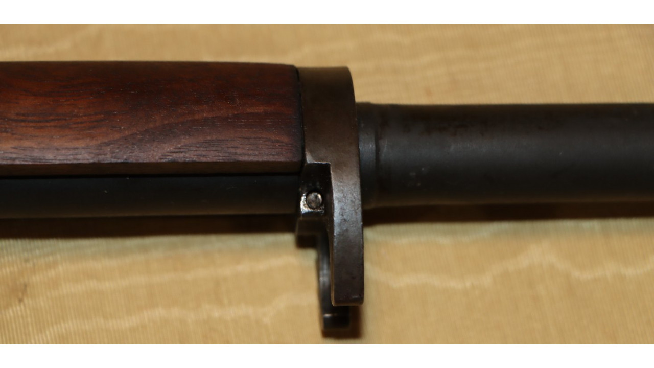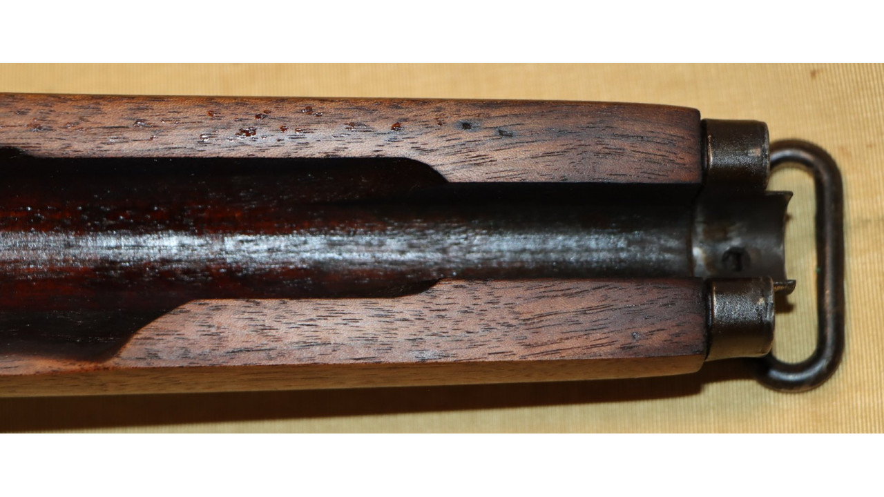 The front hand guard is also in near mint condition and has almost no dings or scratches and no cracks or chips noted. The front hand guard ferrule retains the majority of its original parkerized finish. The front hand guard liner has the correct holes on both ends and the notch at the front.