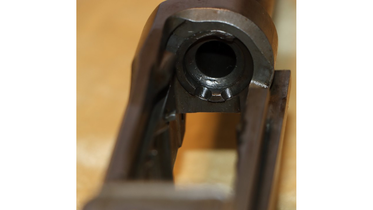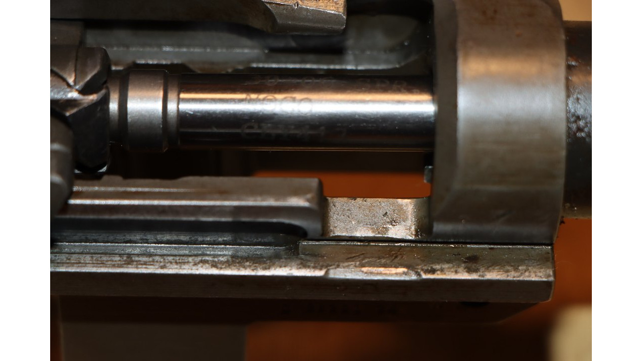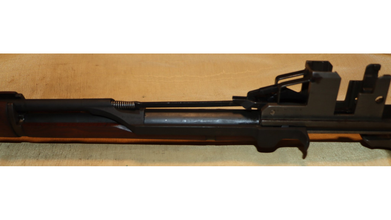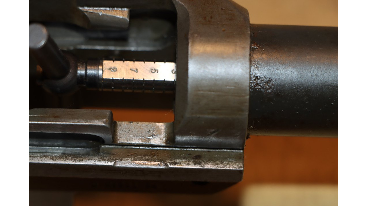 The operating rod is the correct “9 SA” type that has the correct concave side. The operating rod remains in its original configuration and is unmodified or uncut. The operating rod retains the vast majority of its dark parkerized finish with wear noted at the friction points. The piston face is smooth with no pitting or chips and remains within specifications measuring .526 inches in diameter.