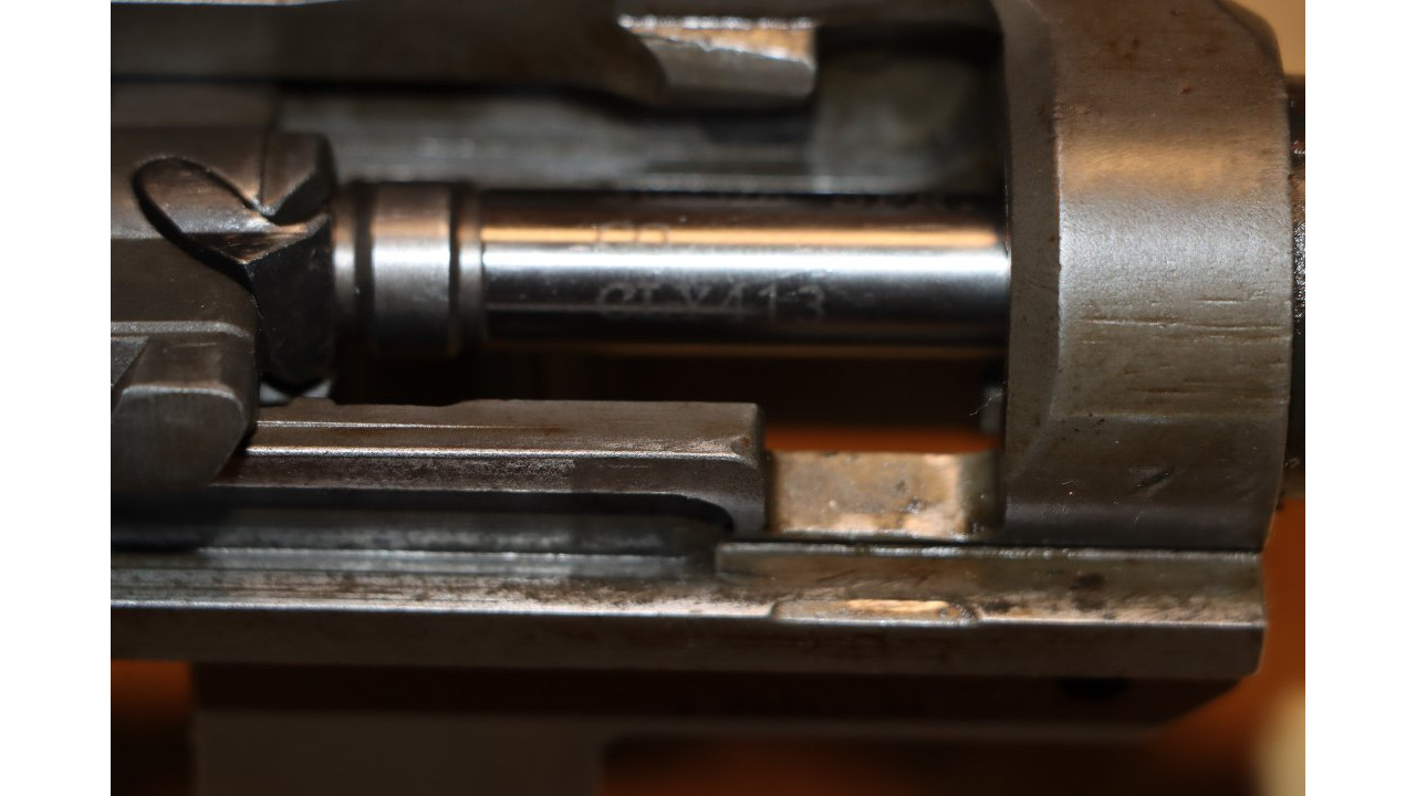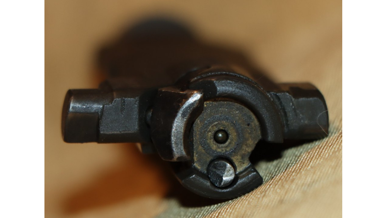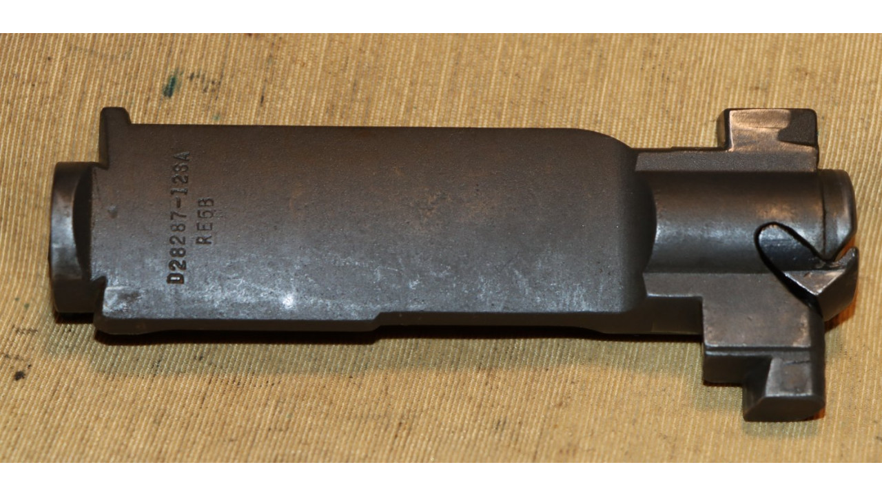The bolt is the correct Springfield -12SA drawing number with “RE5B” heat lot number. The bolt retains 95% of its parkerized finish. The extractor retains approximately 90% of its original blued finish with wear noted on the friction bearing surfaces. The extractor retains considerable original bluing on the barrel with wear on the plunger head. The ejector is generally in the white except for the extractor pin notch. The bolt face retains considerable original finish.