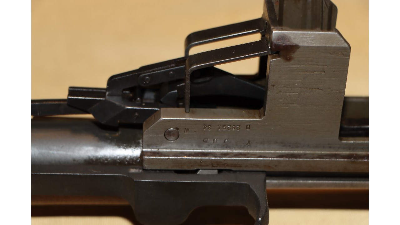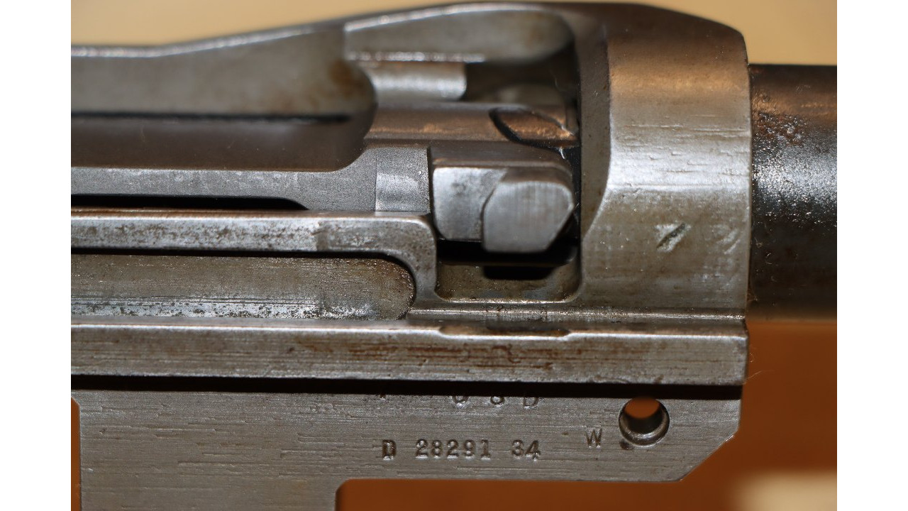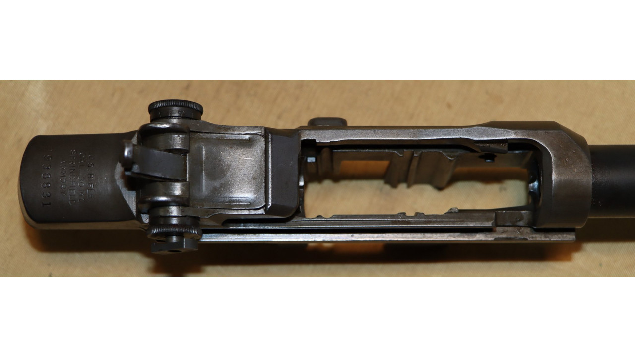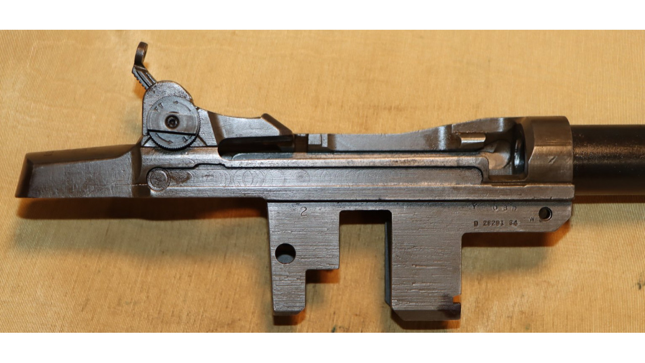 The ejector clip is the second type with rounded front end that retains the majority of its original parkerized finish. The ejector clip spring remains in the white. The clip latch pin retains the majority of its original dark parkerized finish. The receiver retains 95% of its parkerized finish. The right side has the drawing number “D 28291 34,” and heat lot number “Y08D. There are various inspection marks on the receiver to include “W” on the right side, “2” on right rear leg. The Springfield, nomenclature and serial number stamps all remain crisp. The breech face remains in the white. There are minimal wear marks along the rails and other friction points.