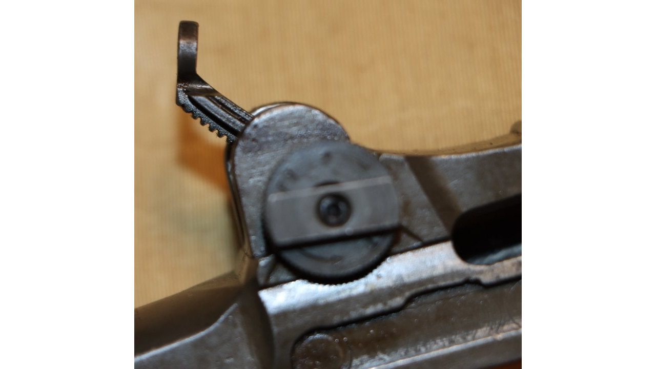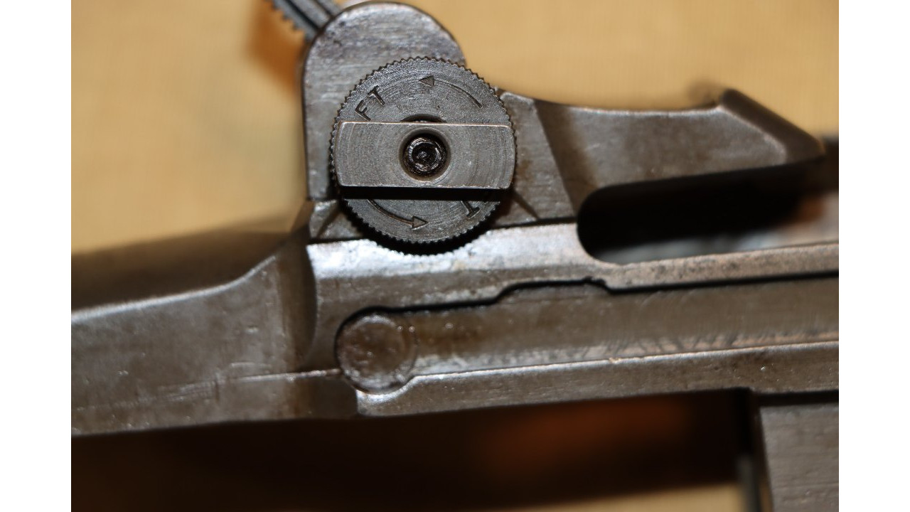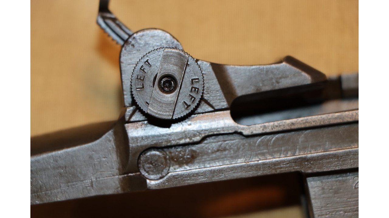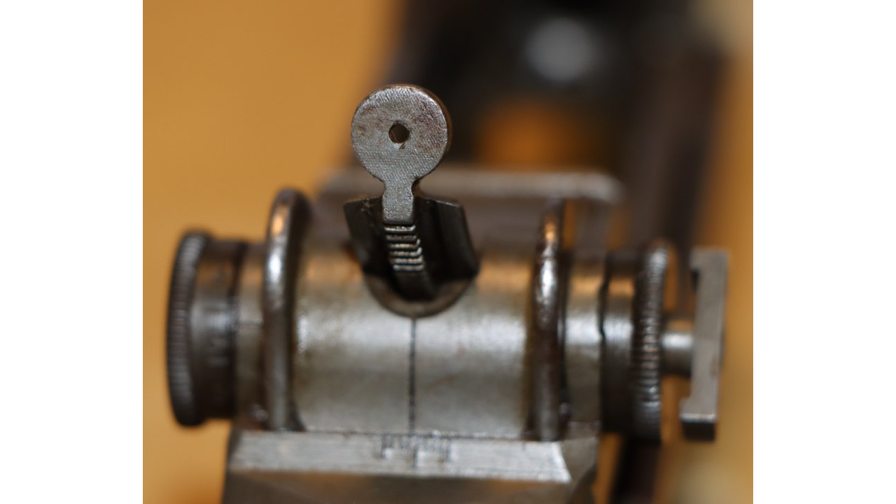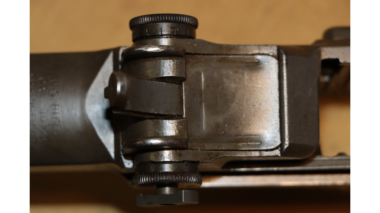 The rear sight is the correct long pinion, rounded lock bar type with knurled windage and elevation knobs. The correct rounded end lock bar exhibits minimal wear along the outer edges. The staking hole on the end of the long pinion is clearly visible with the lock bar staked to it. The windage knob has the correct closed arrowheads and sharp knurling on the outer edge. The aperture has the correct Springfield narrow neck. The rear face of the aperture has the Springfield-characteristic fine, even checkering with no milling marks below the checkering. The aperture retains 98% of its original finish. The rear site cover has the correct reinforcing ribs with parallel lines on both sides (parallel to barrel) and towards the rear of the face (perpendicular to barrel), and it retains the majority of its original gray-green finish with some minor scratches on the outer surface. The elevation knob is the correct Springfield closed arrowhead type with knurled edge and unmarred single slot screw. The elevation knob cover retains approximately 98% of its original finish. The entire rear site assembly functions crisply and correctly.