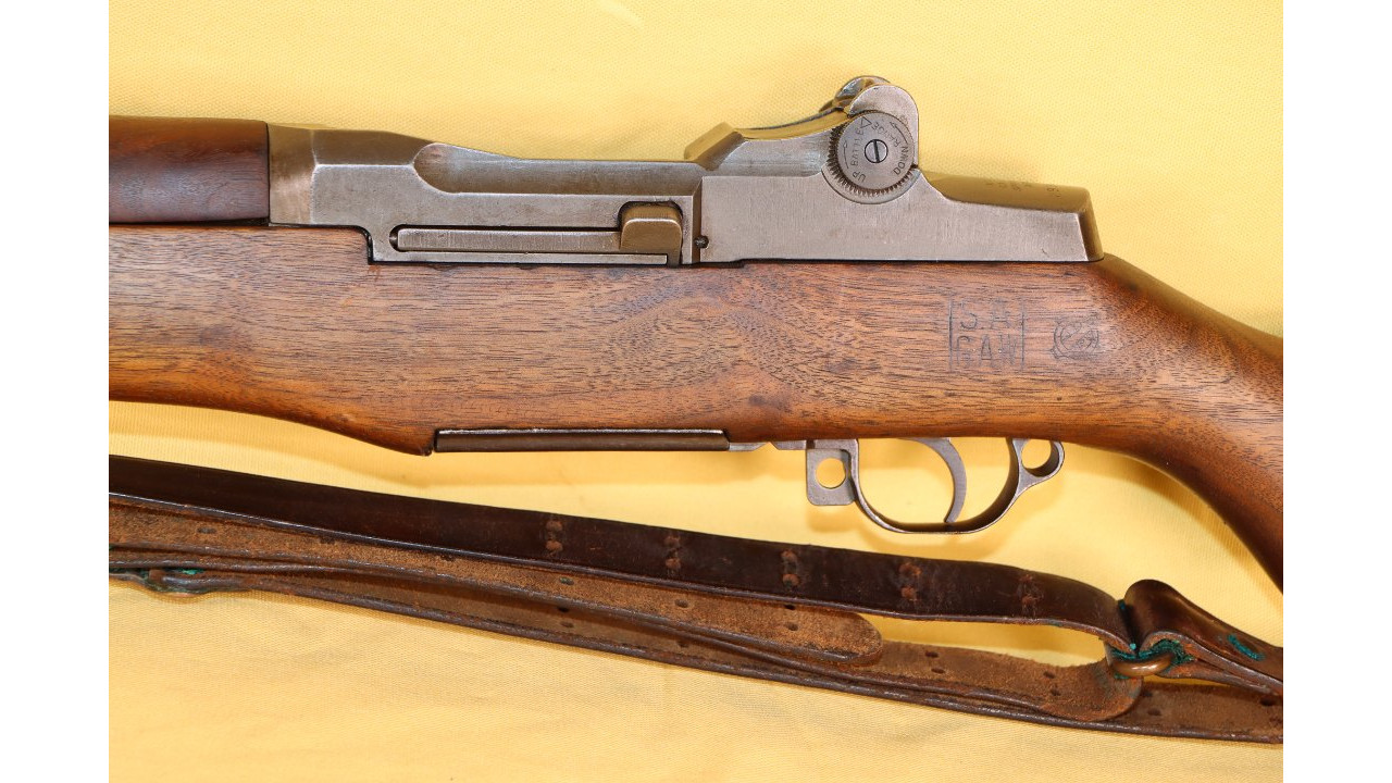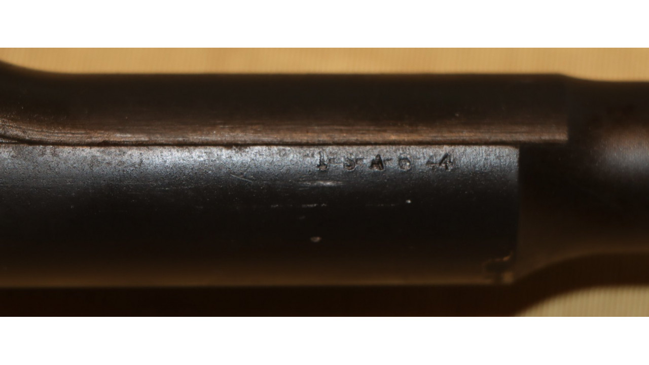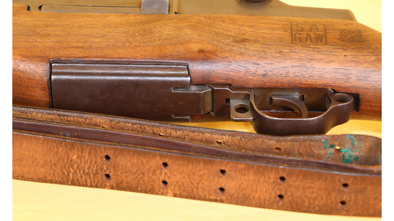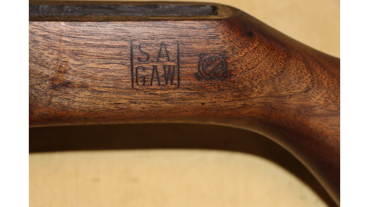 The stock is the correct Springfield short barrel channel type with correct stamped and brazed stock ferrule with hole in the channel. The upper sling swivel is secured by an unmarred, single-slot screw. The butt plate is the correct WWII Springfield type with six squares on the top line, four squares on the bottom line and partial squares along the sides and around the screw hole recesses. The trap door has the correct Springfield checkering that extends 1 1/2 diamonds onto the hinge bar. The plunger is correctly flat. The butt plate retains the majority of its parkerized finish with wear noted on the outer edges and at the hinge portion of the plate. The left side stock flat has the correct boxed “S.A./G.A.W.” cartouche of Colonel George A. Woody, who was Superintendent at Springfield Armory from August 1943 - August 1944. To the right of the cartouche is the small Ordinance Escutcheon. Both the cartouche and Ordnance Escutcheon are still crisply stamped. The bottom of the stock wrist has the correct and still crisply stamped, circle, serif “P” firing proof stamp. There are no other marks on the stock. The stock also has almost no dings and scratches from use and no cracks or chips noted and it is in fine condition along with the hand guards, all of which have never been sanded and all of which retain their original oil finish.