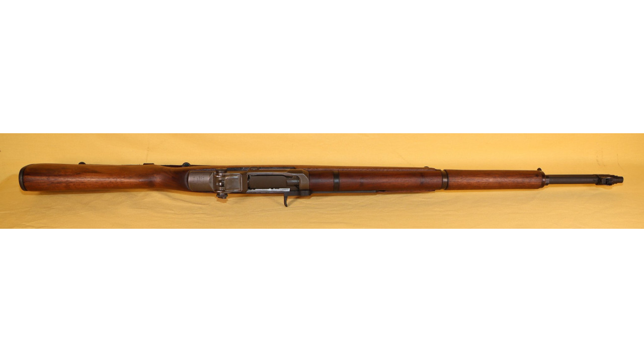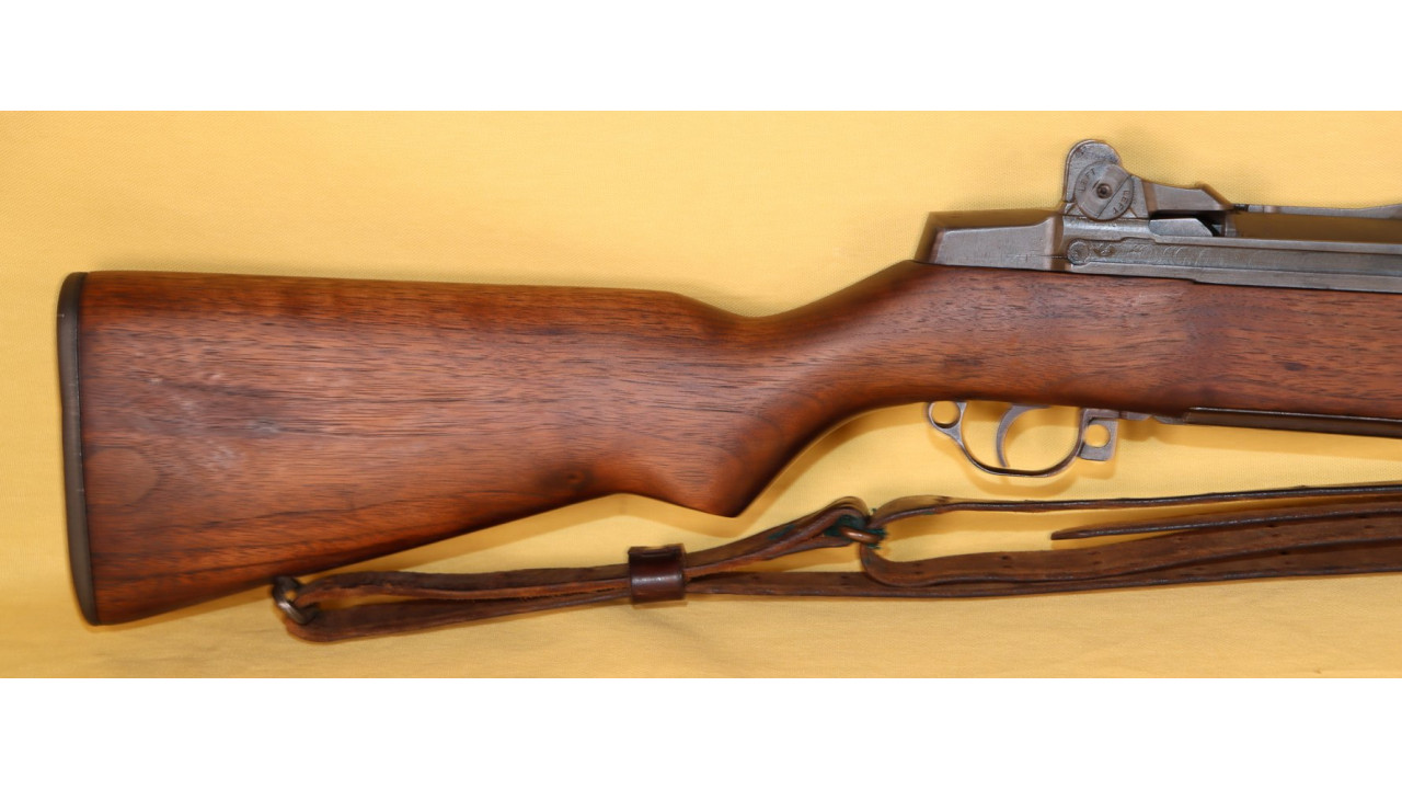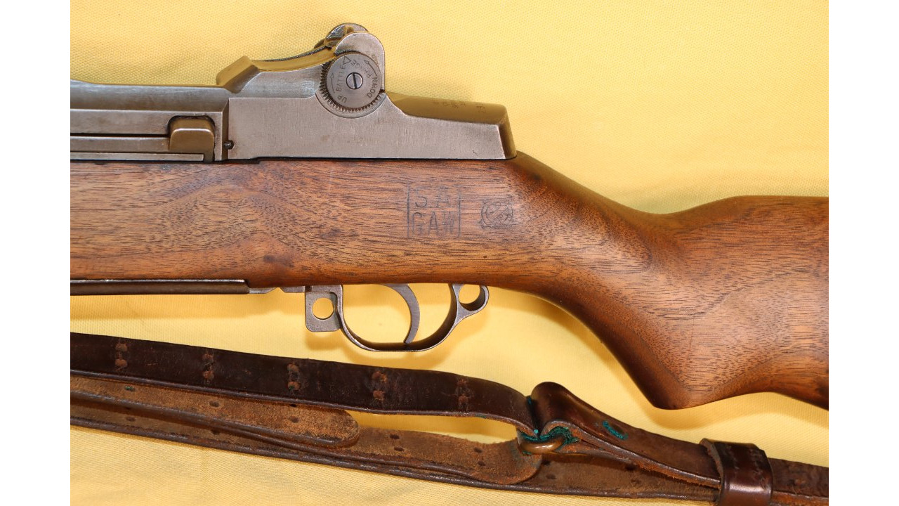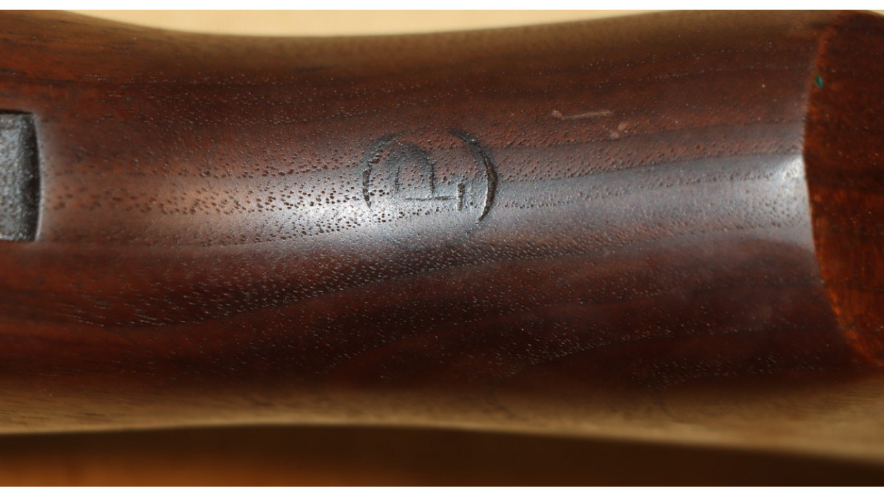 The stock is the correct Springfield short barrel channel type with correct stamped and brazed stock ferrule with hole in the channel. The upper sling swivel is secured by an unmarred, single-slot screw. The butt plate is the correct WWII Springfield type with six squares on the top line, four squares on the bottom line and partial squares along the sides and around the screw hole recesses. The trap door has the correct Springfield checkering that extends 1 1/2 diamonds onto the hinge bar. The plunger is correctly flat. The butt plate retains the majority of its parkerized finish with wear noted on the outer edges and at the hinge portion of the plate. The left side stock flat has the correct boxed “S.A./G.A.W.” cartouche of Colonel George A. Woody, who was Superintendent at Springfield Armory from August 1943 - August 1944. To the right of the cartouche is the small Ordinance Escutcheon. Both the cartouche and Ordnance Escutcheon are still crisply stamped. The bottom of the stock wrist has the correct and still crisply stamped, circle, serif “P” firing proof stamp. There are no other marks on the stock. The stock also has almost no dings and scratches from use and no cracks or chips noted and it is in fine condition along with the hand guards, all of which have never been sanded and all of which retain their original oil finish.