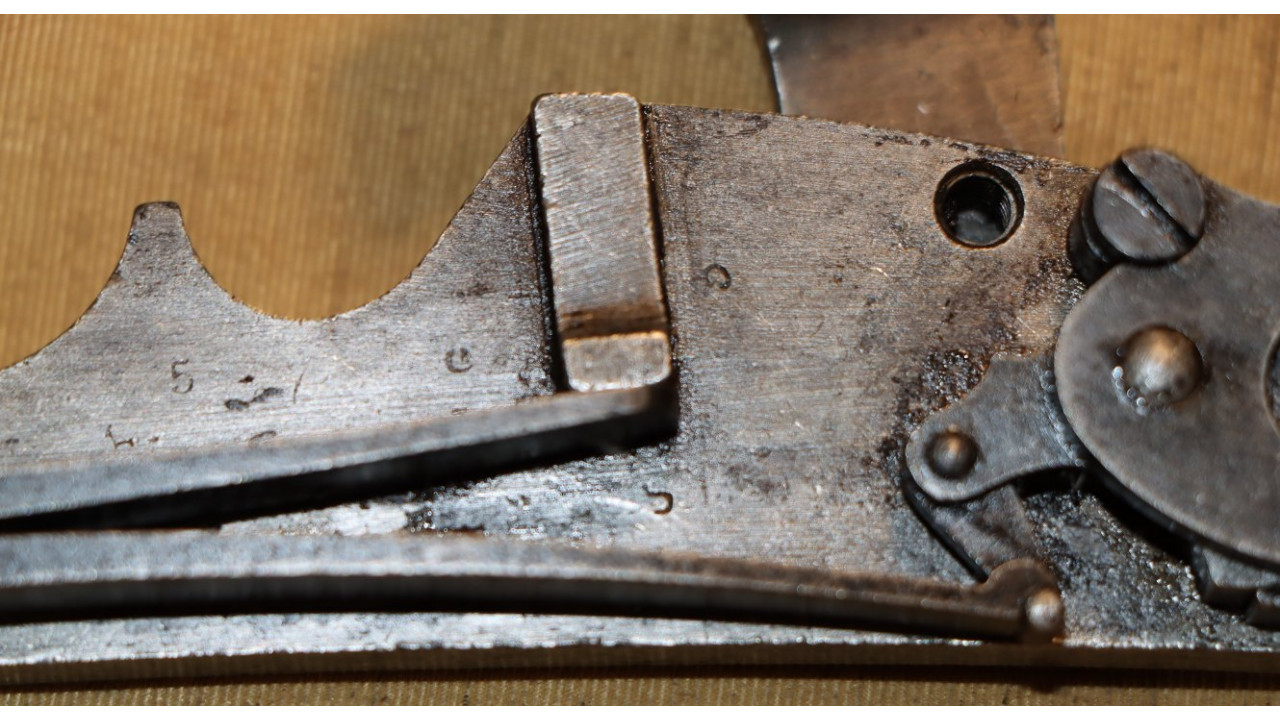 The interior of the lock mechanism is in very fine condition. The interior wall of the lock plate retains all of its original color case-hardened finish. The interior wall has numerous inspection stamps, including a serif “G” and a “5” stamp. The Hammer Main Spring is still very strong and retains all of its original heat tempered finish and is marked with a “19” stamp on the top leaf. The Bridle retains 98% of its original oil quenched finish as does the original two-position Tumbler, which is marked with a “8” stamp, the Sear, which is marked with a “O” stamp, and the Tumbler Lever Arm. The Sear Spring retains all of its blue tempered finish and is marked with a “2” stamp. All three internal lock mechanism screws retain all of their dark oil finish, and all have unmarred slots. Both lock plate screw washers are present on the stock, and both remain correctly in the white and retain their beautiful national armory bright finish. Both original lock screws also retain considerable original national armory bright finish on the heads with the balance exhibiting a dark patina.