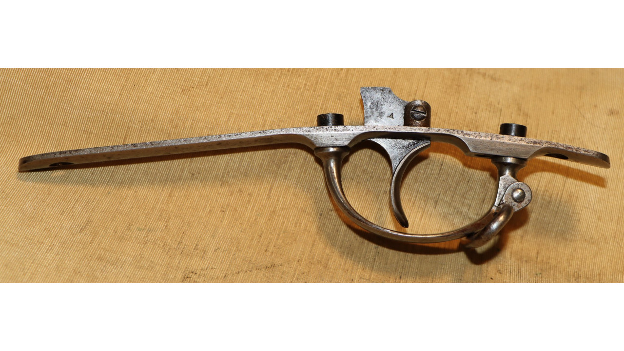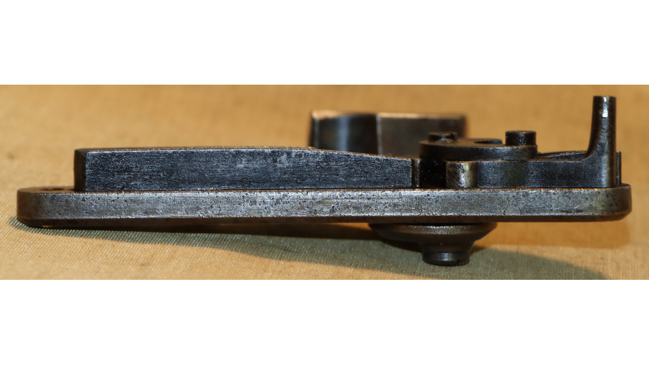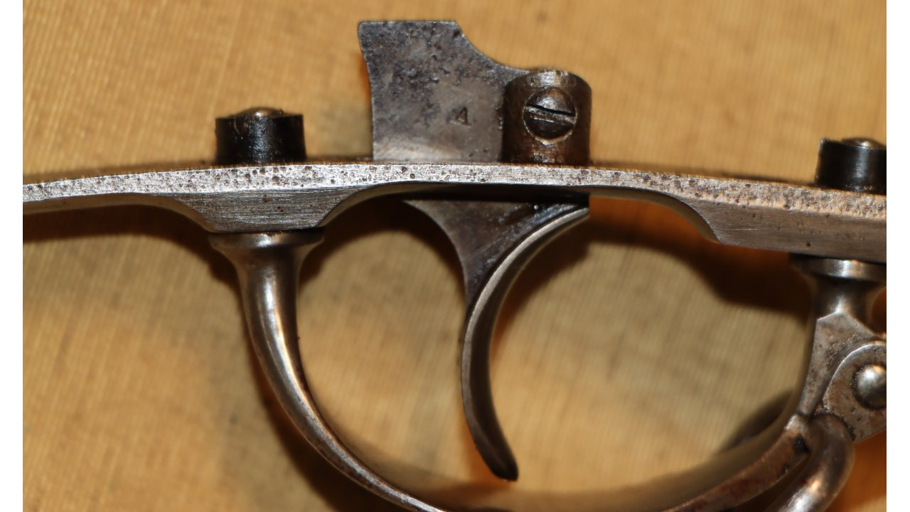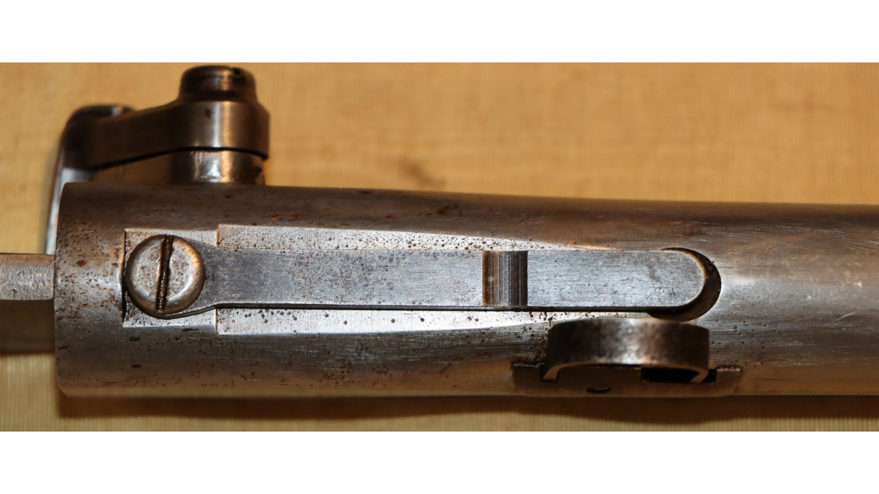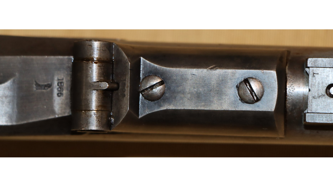 The original Thumb Latch retains the majority of its original dark oil-quenched finish with virtually no wear. The top of the Thumb Latch is correctly smooth, and the single-slot, rounded head Latch Screw is unmarred. The Thumb Latch is the first of two types used on the Model 1866, which is the “two piece” cam latch without the machined cam latch cap or plate recess on the left side of the breech block. This first type of cam was used until around production number 7,000, when the “one piece” latch with cam plate was introduced.