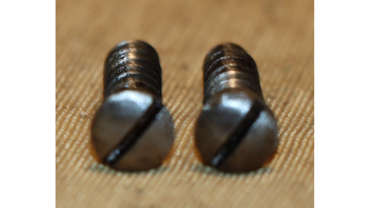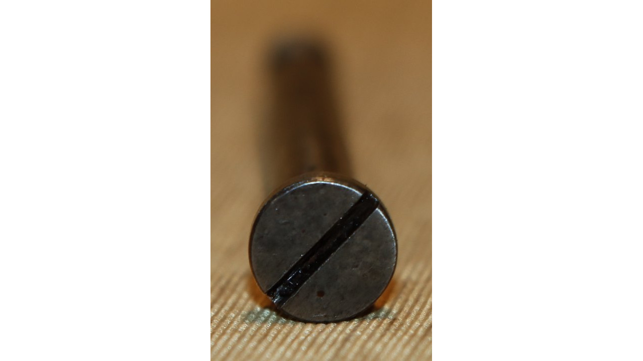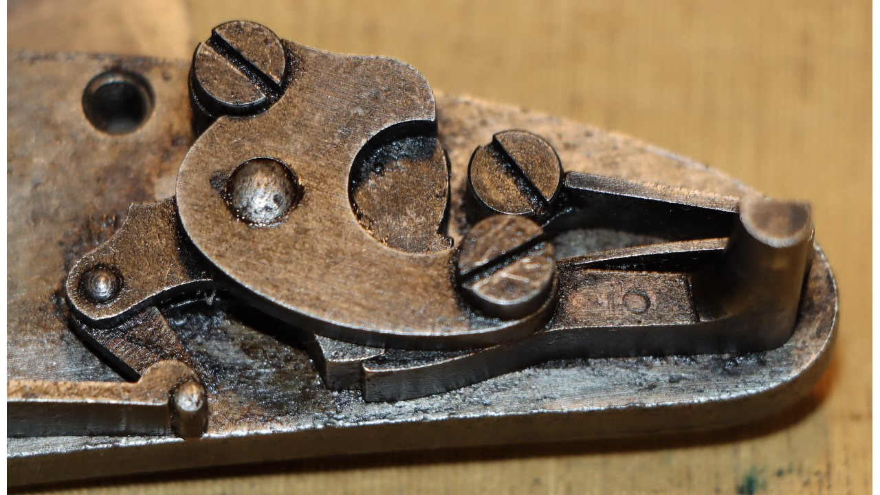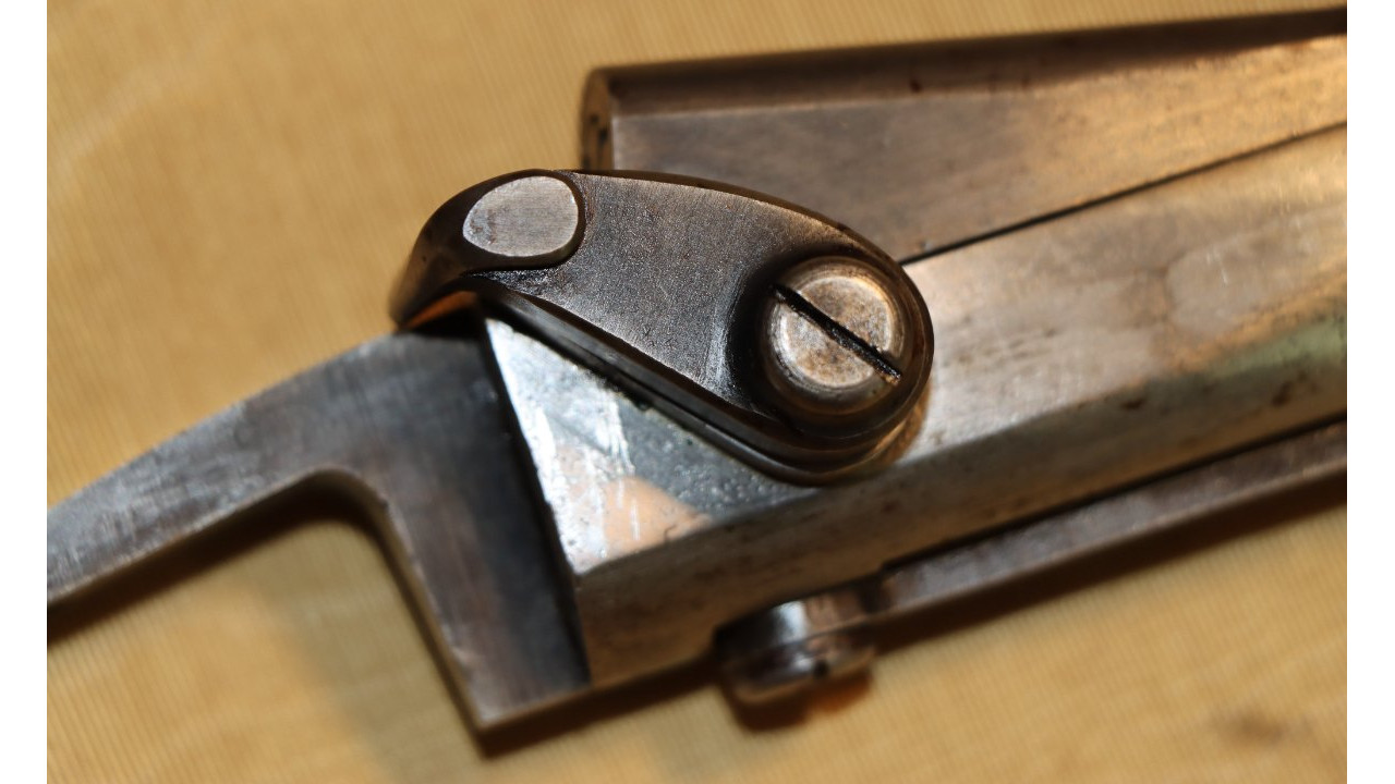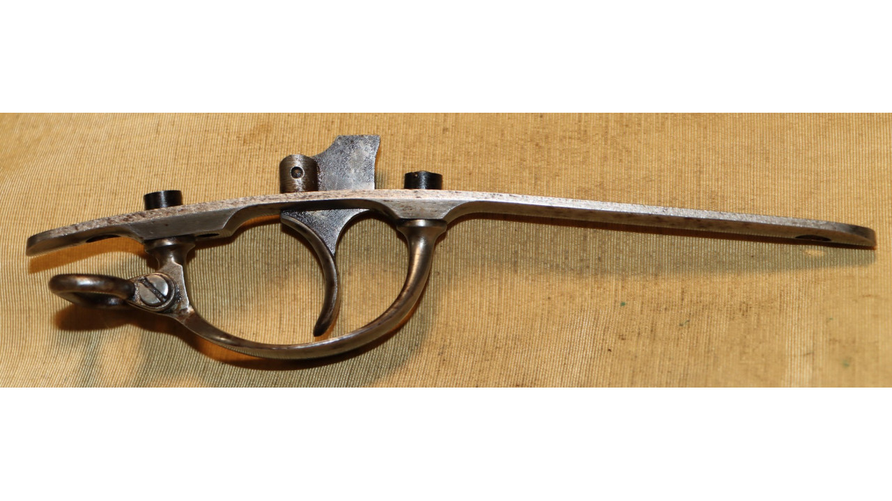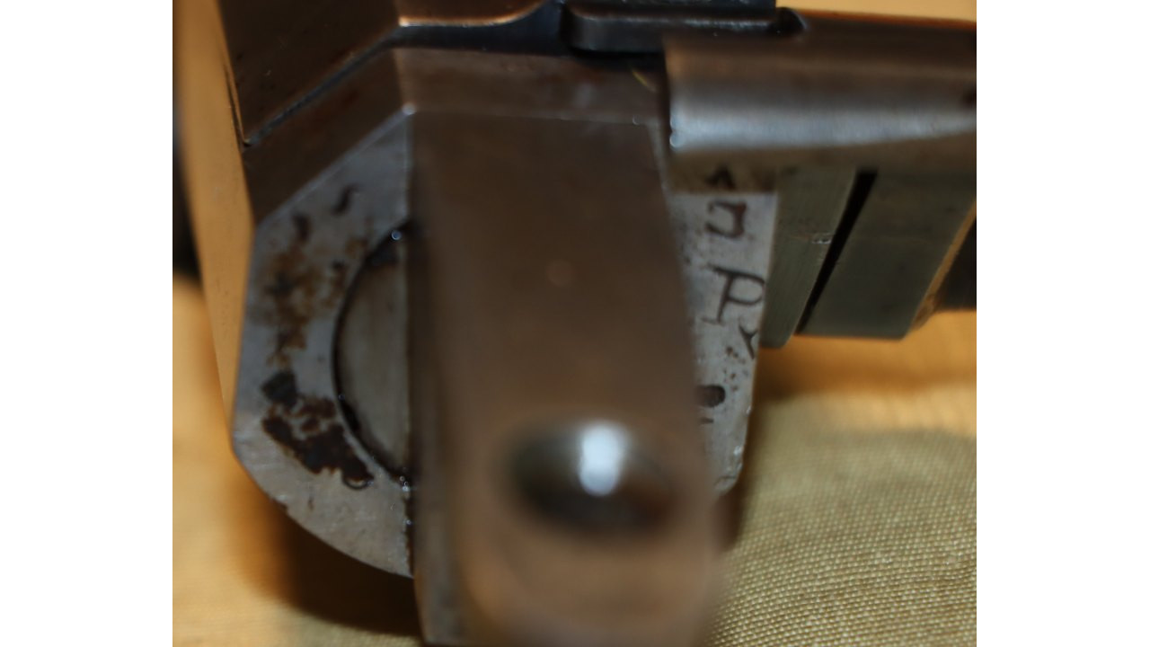 The original Thumb Latch retains the majority of its original dark oil-quenched finish with virtually no wear. The top of the Thumb Latch is correctly smooth, and the single-slot, rounded head Latch Screw is unmarred. The Thumb Latch is the first of two types used on the Model 1866, which is the “two piece” cam latch without the machined cam latch cap or plate recess on the left side of the breech block. This first type of cam was used until around production number 7,000, when the “one piece” latch with cam plate was introduced.