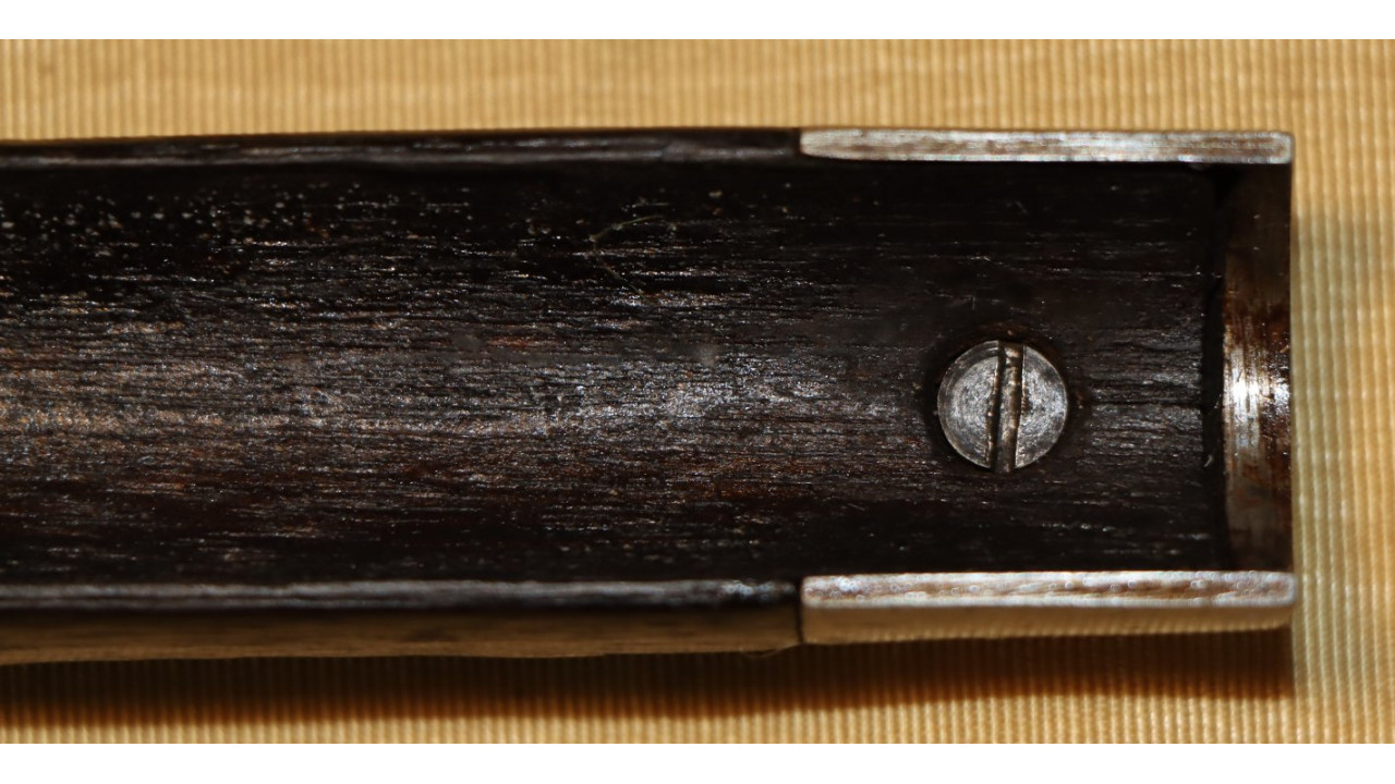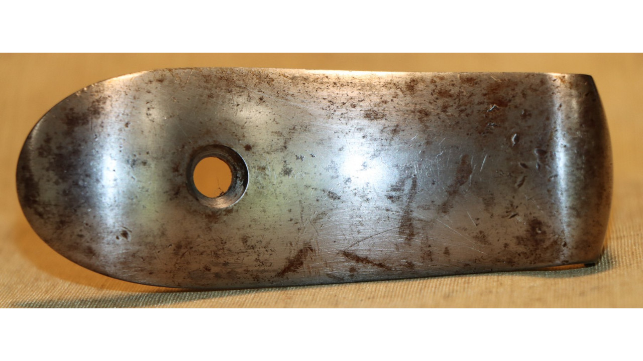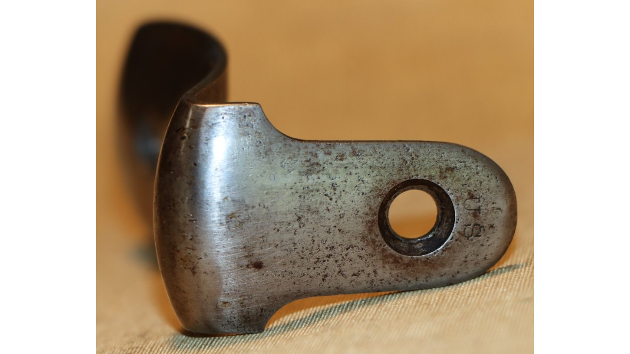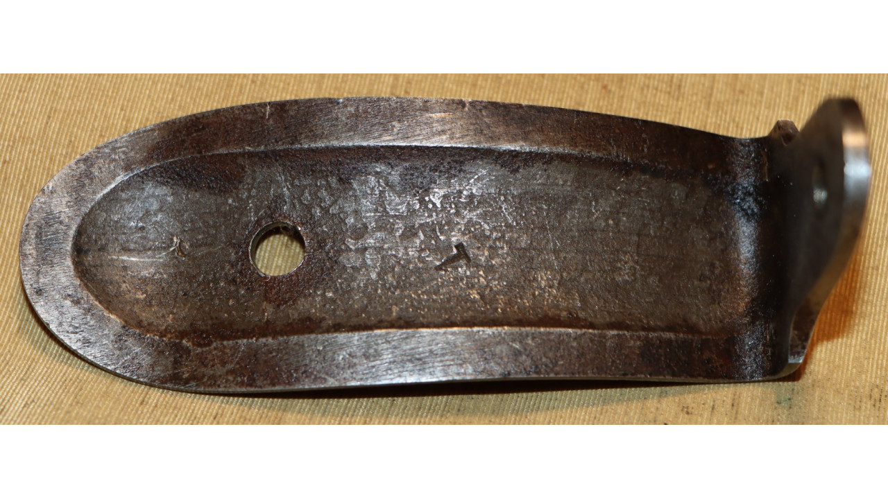 The Butt Plate is the correct and original curved profile, convex surface type with slightly faded "US" stamp on the Tang. The interior side of the butt plate has a serif “T” stamp. Both the Tang Screw and Butt Plate Screw are the correct single-slot, rounded face type that are in mint condition with only very marring of one slot. The Butt Plate itself still retains considerable original national armory bright finish, with numerous, small areas of foxing, dings, old corrosion staining, and light pitting.
