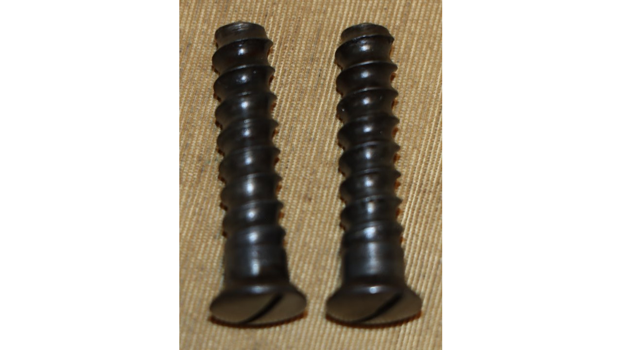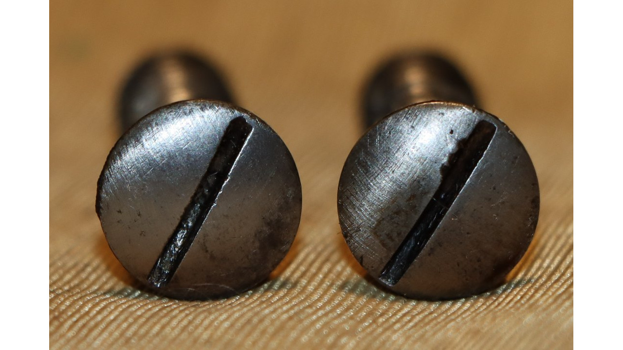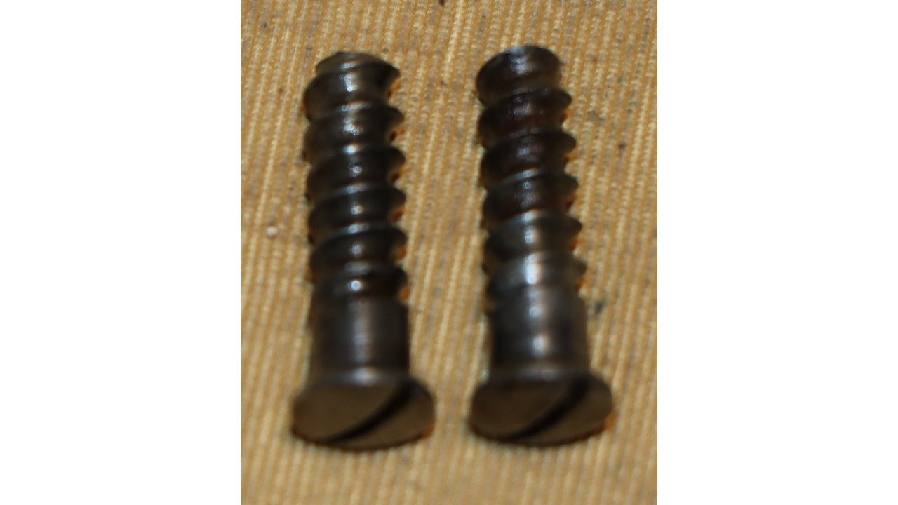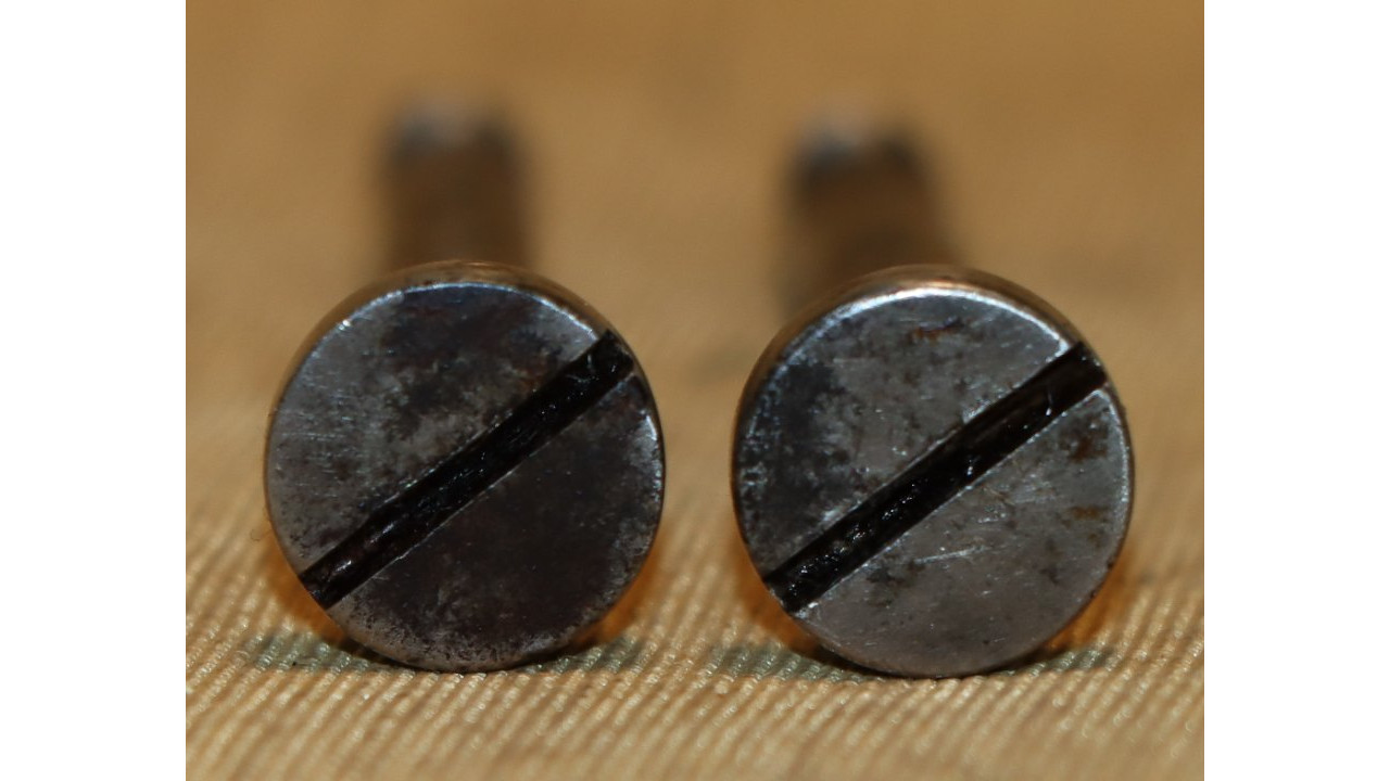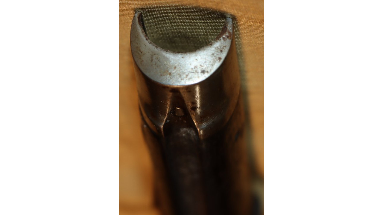 The Butt Plate is the correct and original curved profile, convex surface type with slightly faded "US" stamp on the Tang. The interior side of the butt plate has a serif “T” stamp. Both the Tang Screw and Butt Plate Screw are the correct single-slot, rounded face type that are in mint condition with only very marring of one slot. The Butt Plate itself still retains considerable original national armory bright finish, with numerous, small areas of foxing, dings, old corrosion staining, and light pitting.