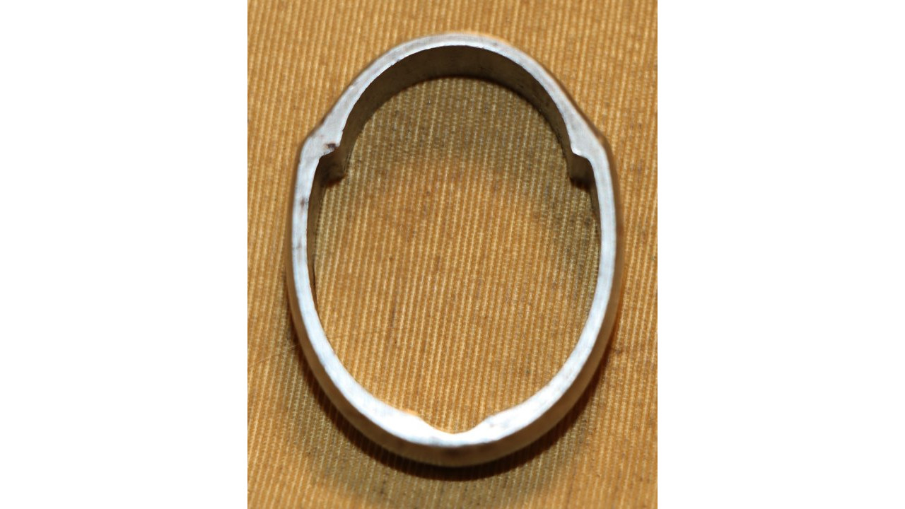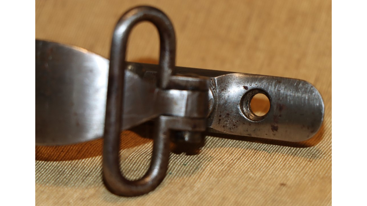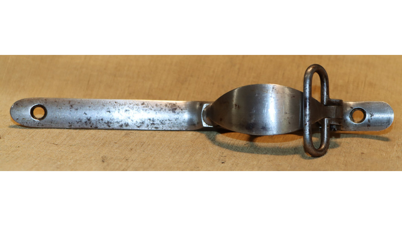 The Trigger Guard and Trigger Plate assembly remain with most of their original National Armory Bright finish that is in very good plus condition. There is moderate staining on the trigger plate and guard. The original Trigger is present, and it retains generous of its original oil blackened finish with wear noted on the trigger face. The right side of the trigger extension (that portion that contacts the sear arm) has a serif “A” stamp. The Trigger operates smoothly and still releases the Hammer crisply. Both trigger guard bow spanner nuts retain all of their original finish. The original Lower Sling Swivel Assembly is present along with the Lower Sling Swivel Screw. Both Trigger Plate Screws, which are round head, single-slot Screws, are present and both are unmarred.