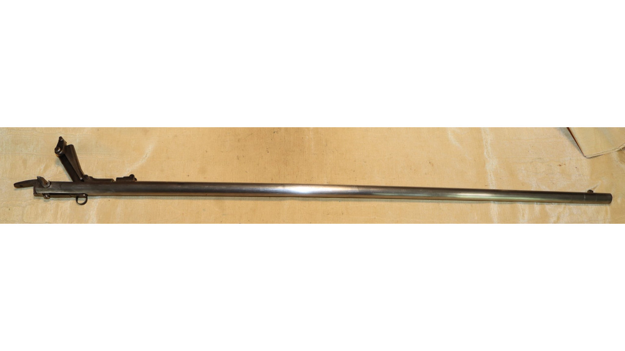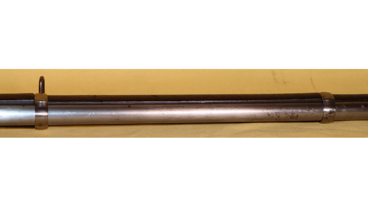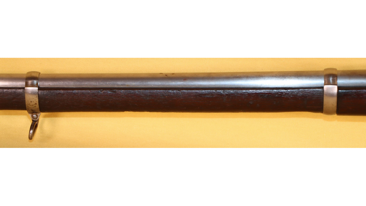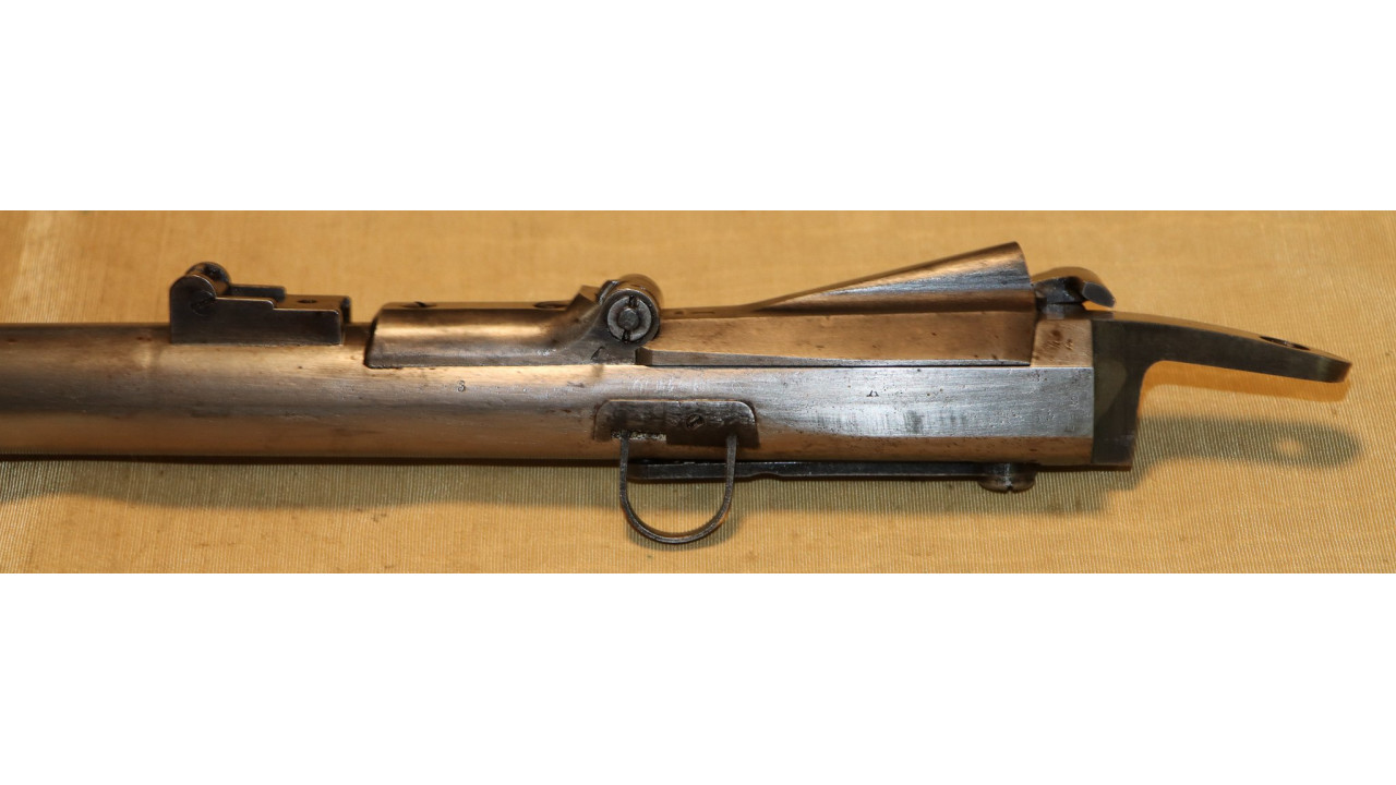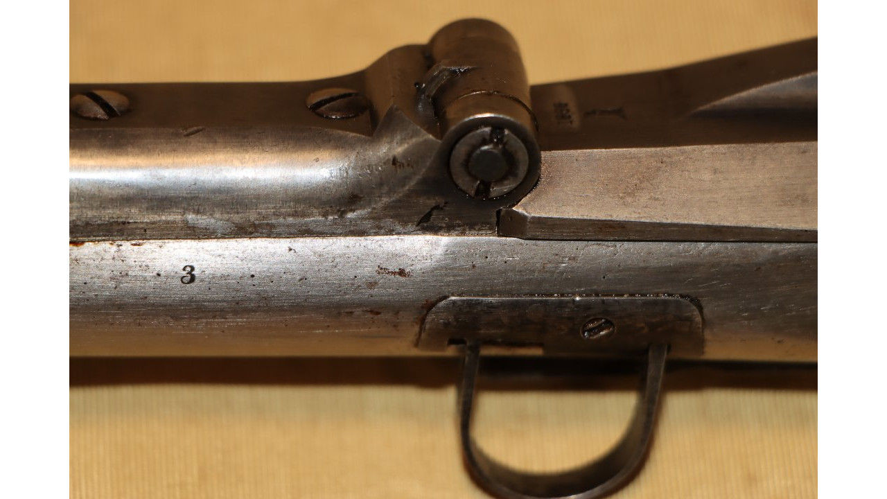 The Barrel on this Model 1866 Rifle is the very fine condition and original modified .58 caliber Model 1863 muzzle-loading Barrel that is 40" long. The Model 1863 Barrels used on the Model 1866 Rifles were reamed out to a diameter of .640" the entire length of the Barrel and were then fitted with a .50 caliber, rifled Barrel Liner that was brazed at the end and the Barrel crowned. The braze line on this Barrel is barely noticeable and the Liner is still secure. The bore has the correct 3-groove rifling, and the bore is in very fine condition with a mirror finish, strong, crisp rifling, and only a few areas of frosting in the lands and grooves. The original Front Sight is present and is still securely brazed to the top of the Barrel. The external surface of the barrel is in very fine, original condition and retains all of its original armory bright finish with only a few small areas of old corrosion staining. The sides of the barrel retain several of the original, Civil War-era inspection stamps including the “65” from what was an “1865” dated barrel. On the left side of the barrel, below the hinge is a “3” stamp. On the far left, rear of the barrel are two serif “S” stamps and a serif “A” inspection stamp, and the full Civil War-era eagle head stamp is still visible.