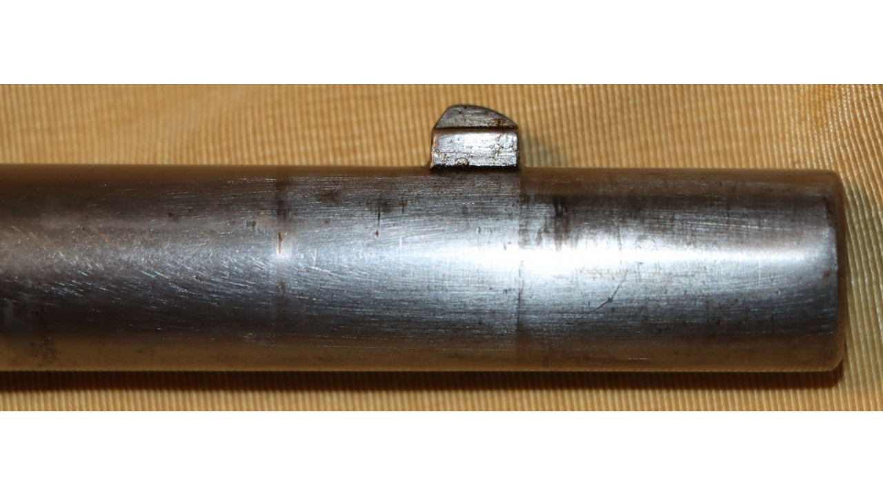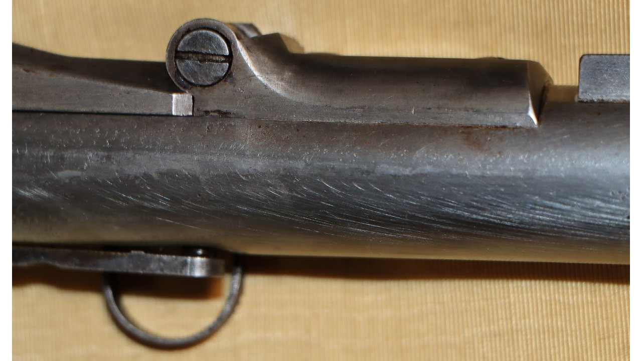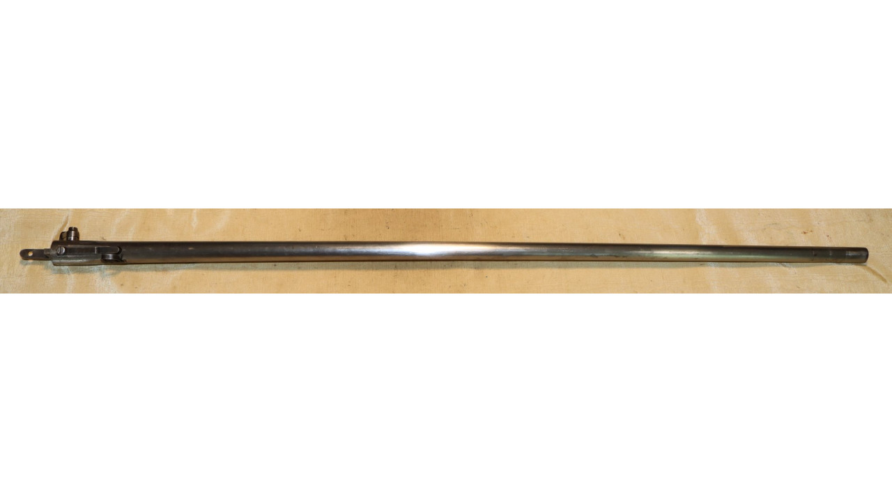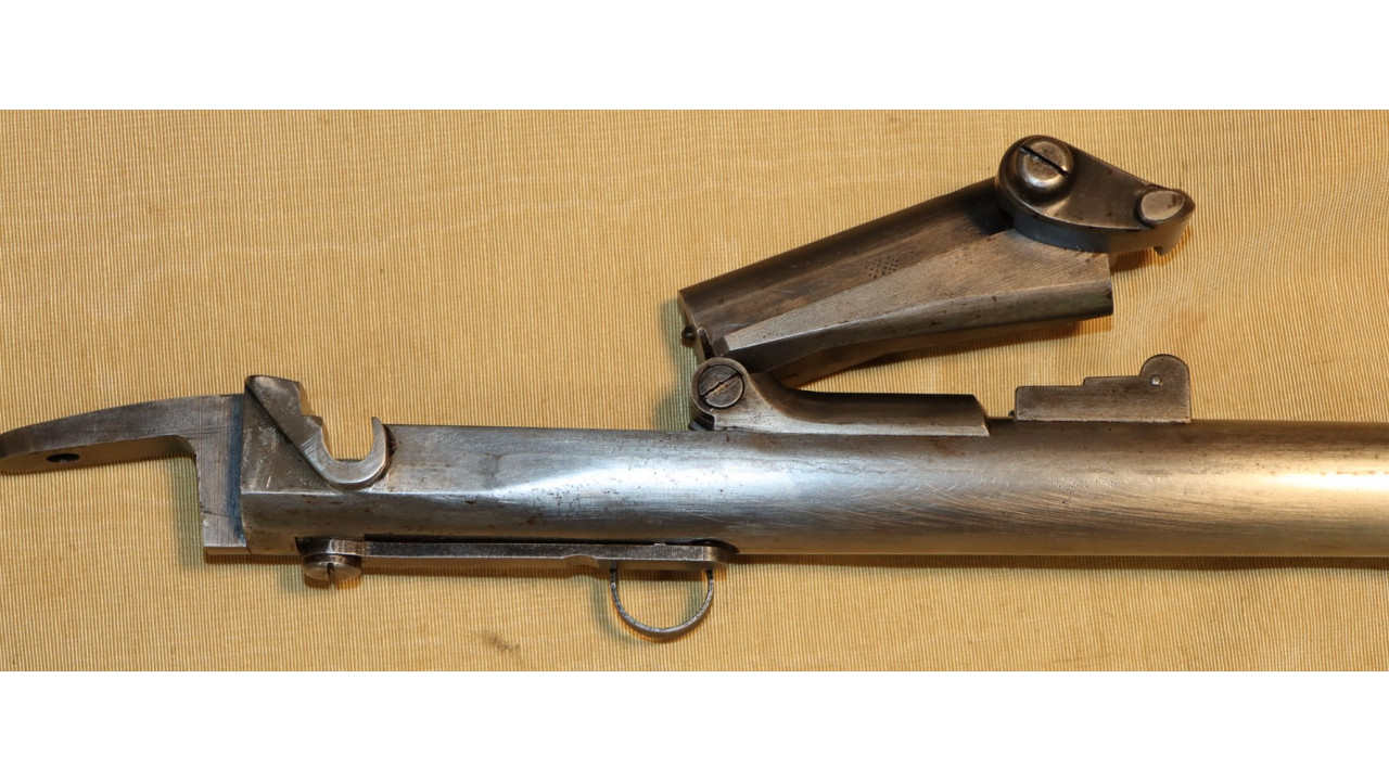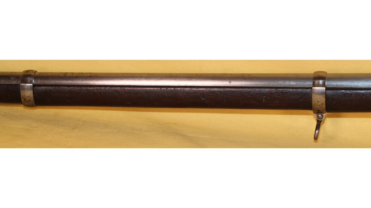 The Barrel on this Model 1866 Rifle is the very fine condition and original modified .58 caliber Model 1863 muzzle-loading Barrel that is 40" long. The Model 1863 Barrels used on the Model 1866 Rifles were reamed out to a diameter of .640" the entire length of the Barrel and were then fitted with a .50 caliber, rifled Barrel Liner that was brazed at the end and the Barrel crowned. The braze line on this Barrel is barely noticeable and the Liner is still secure. The bore has the correct 3-groove rifling, and the bore is in very fine condition with a mirror finish, strong, crisp rifling, and only a few areas of frosting in the lands and grooves. The original Front Sight is present and is still securely brazed to the top of the Barrel. The external surface of the barrel is in very fine, original condition and retains all of its original armory bright finish with only a few small areas of old corrosion staining. The sides of the barrel retain several of the original, Civil War-era inspection stamps including the “65” from what was an “1865” dated barrel. On the left side of the barrel, below the hinge is a “3” stamp. On the far left, rear of the barrel are two serif “S” stamps and a serif “A” inspection stamp, and the full Civil War-era eagle head stamp is still visible.
