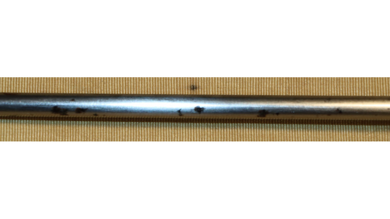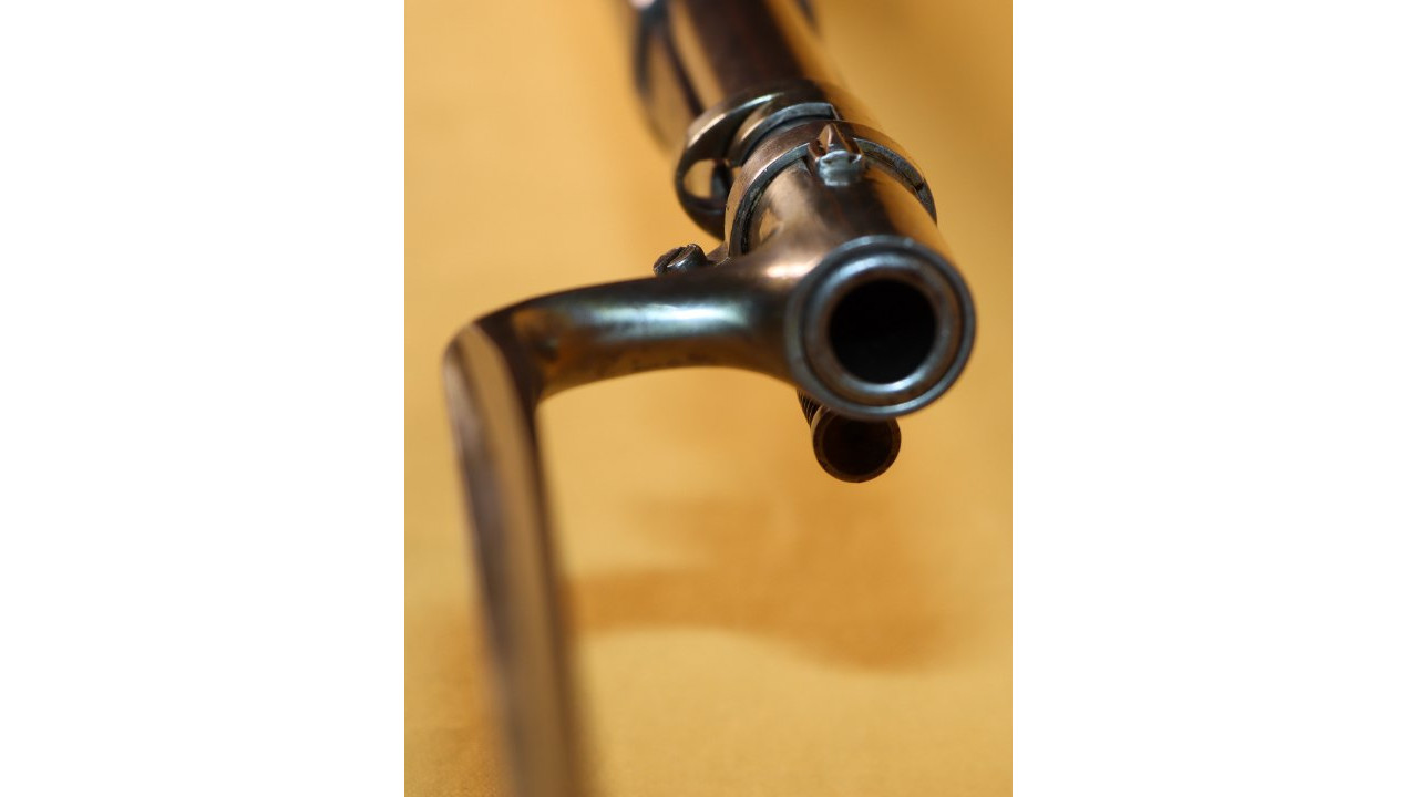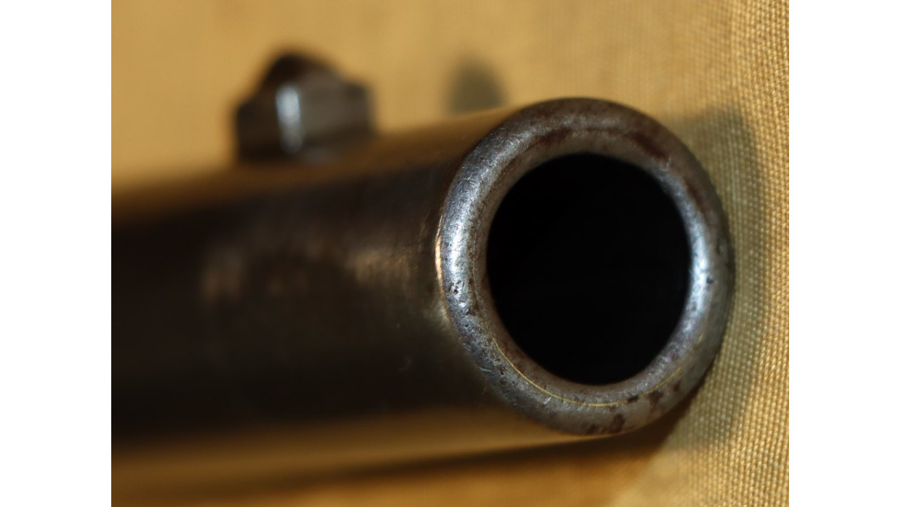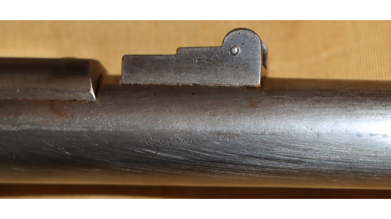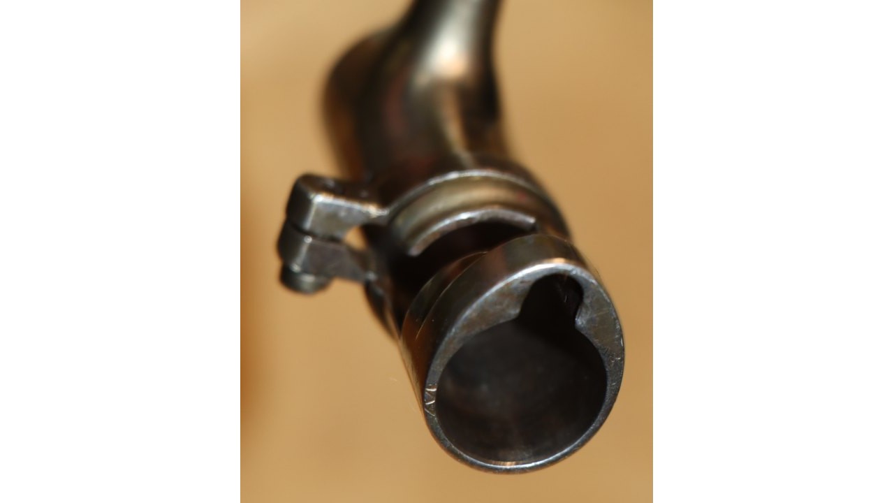 The Barrel on this Model 1866 Rifle is the very fine condition and original modified .58 caliber Model 1863 muzzle-loading Barrel that is 40" long. The Model 1863 Barrels used on the Model 1866 Rifles were reamed out to a diameter of .640" the entire length of the Barrel and were then fitted with a .50 caliber, rifled Barrel Liner that was brazed at the end and the Barrel crowned. The braze line on this Barrel is barely noticeable and the Liner is still secure. The bore has the correct 3-groove rifling, and the bore is in very fine condition with a mirror finish, strong, crisp rifling, and only a few areas of frosting in the lands and grooves. The original Front Sight is present and is still securely brazed to the top of the Barrel. The external surface of the barrel is in very fine, original condition and retains all of its original armory bright finish with only a few small areas of old corrosion staining. The sides of the barrel retain several of the original, Civil War-era inspection stamps including the “65” from what was an “1865” dated barrel. On the left side of the barrel, below the hinge is a “3” stamp. On the far left, rear of the barrel are two serif “S” stamps and a serif “A” inspection stamp, and the full Civil War-era eagle head stamp is still visible.