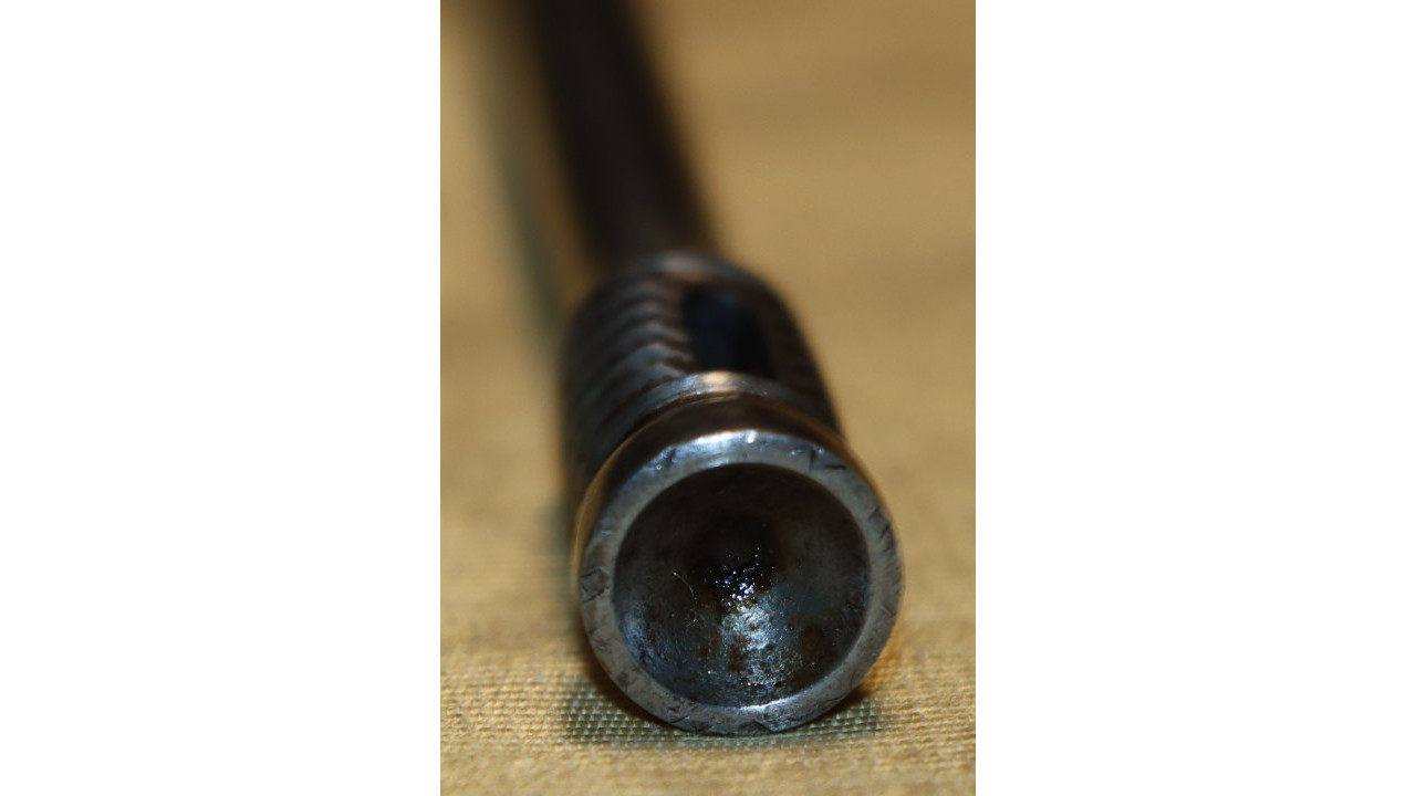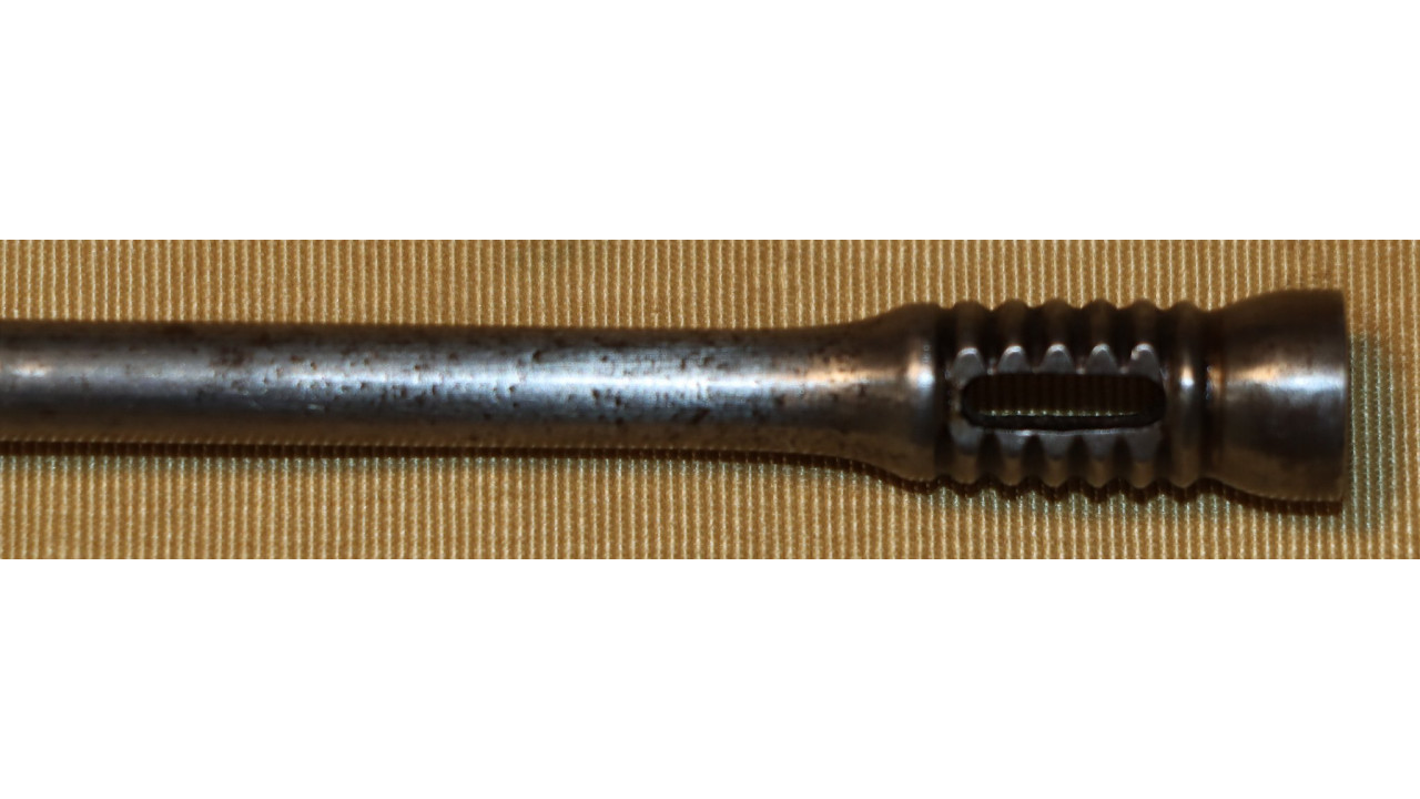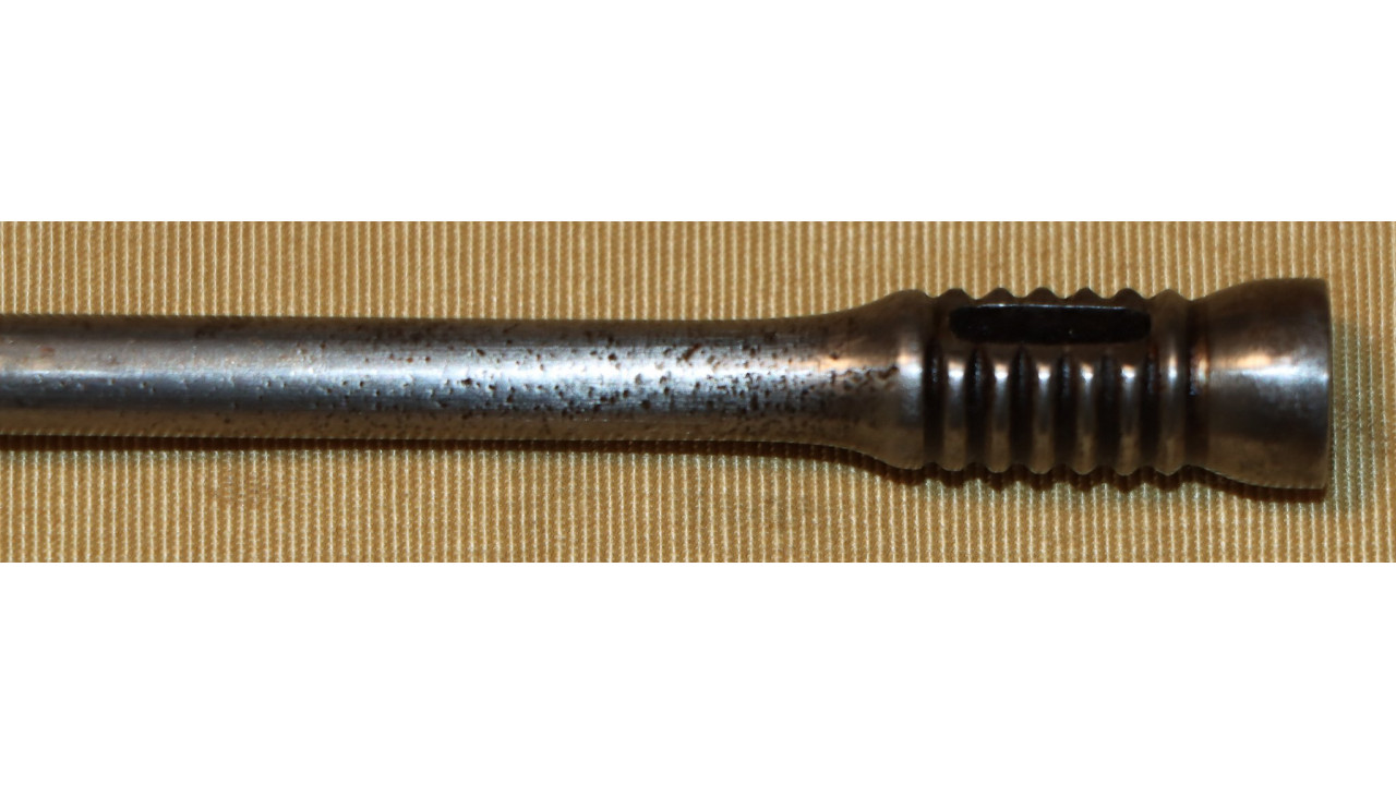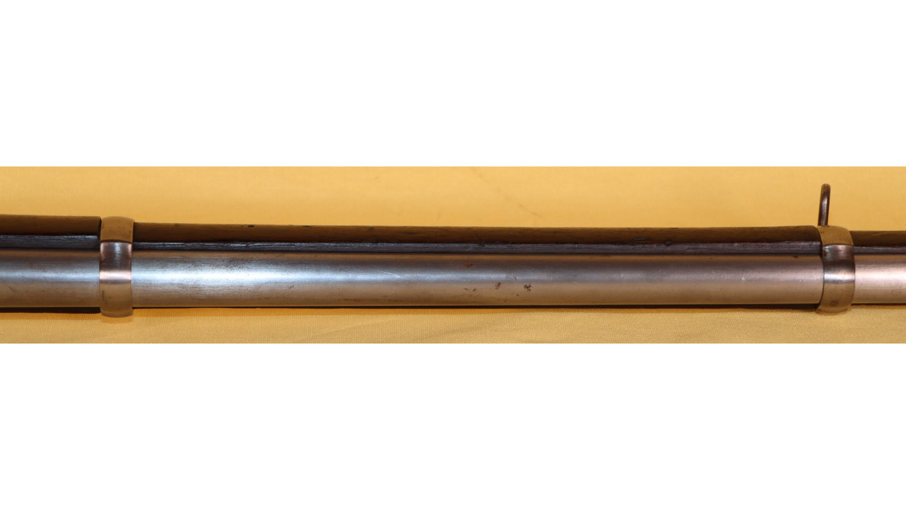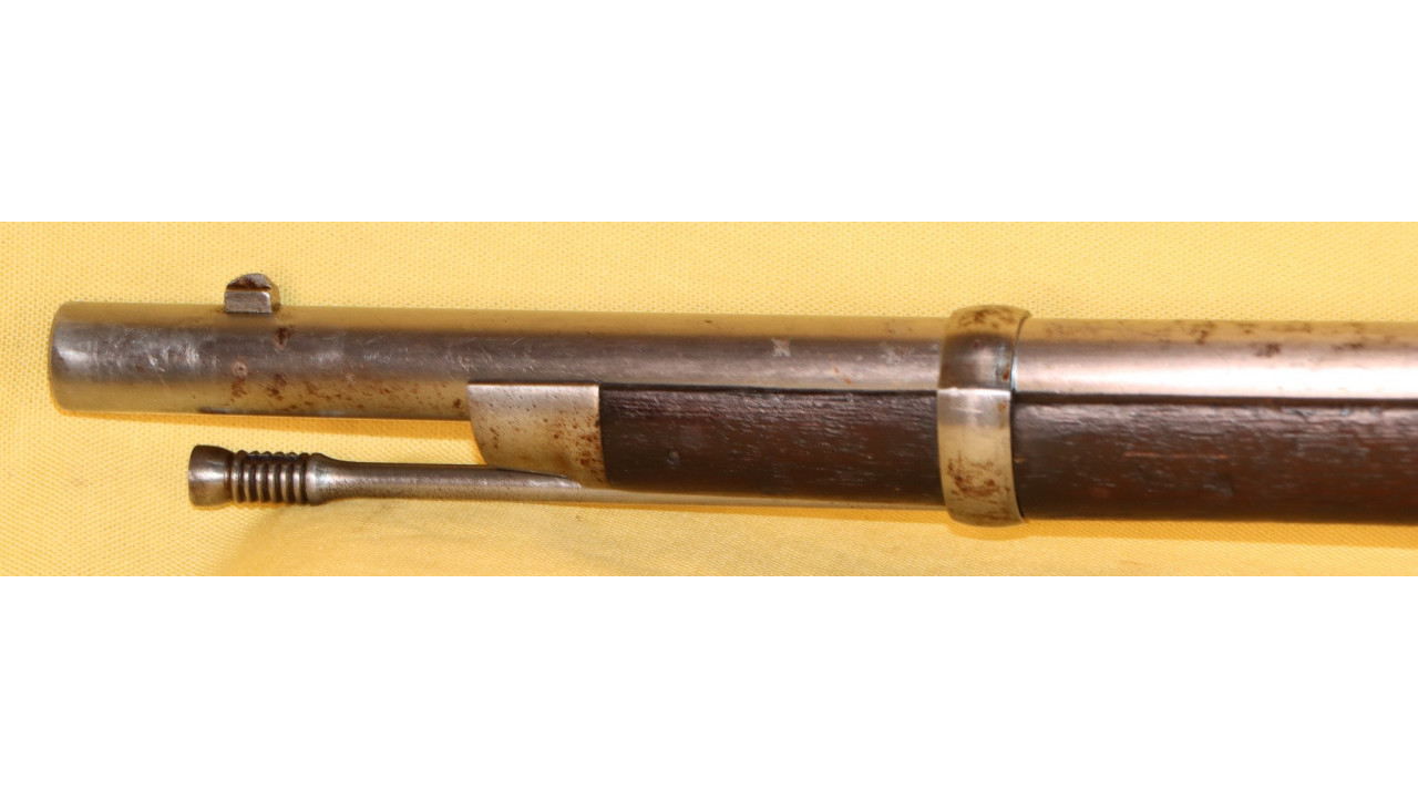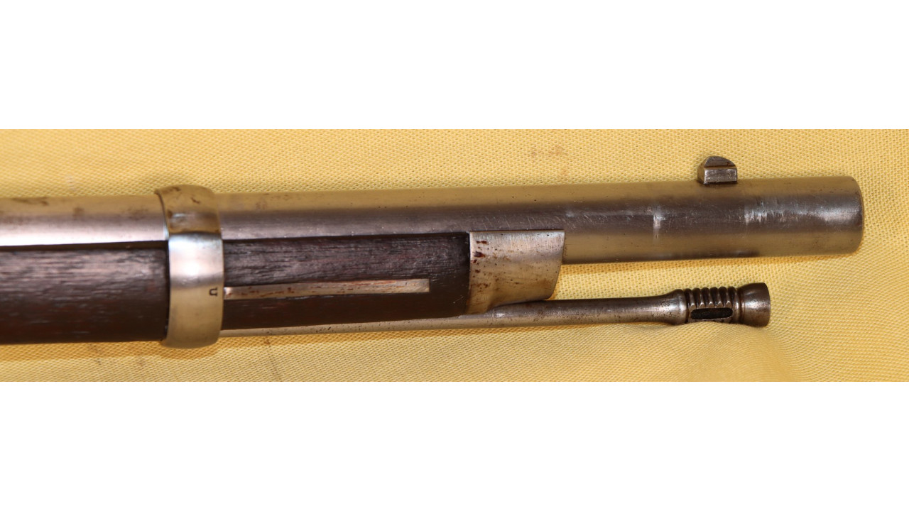 The Upper Band also has the correct serif “U” stamp on the right side, and it retains the majority of its original National Armory Bright finish with minor foxing present in several places. The Upper Band Spring is in fine condition. The original slotted-head Ramrod with seven cannelures is present and is 38 3/4" long and it retains the vast majority of its National Armory Bright finish with only a few areas of small corrosion staining. The Ramrod, when stowed, is correctly 1 1/8" short of the muzzle.