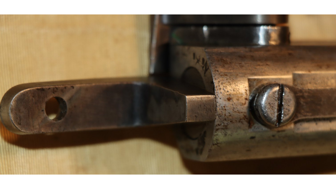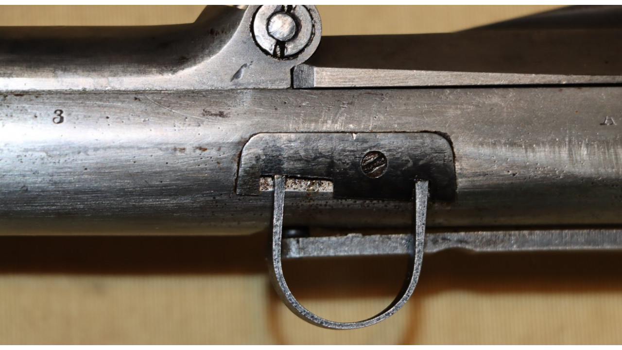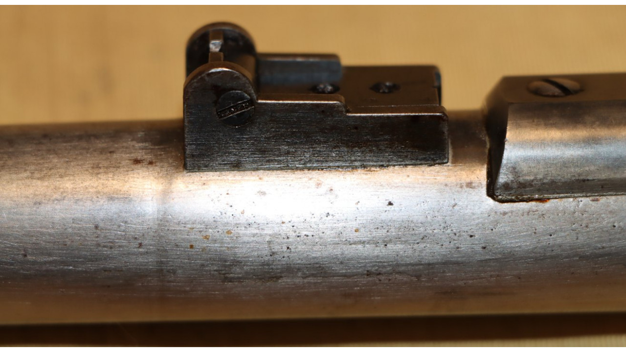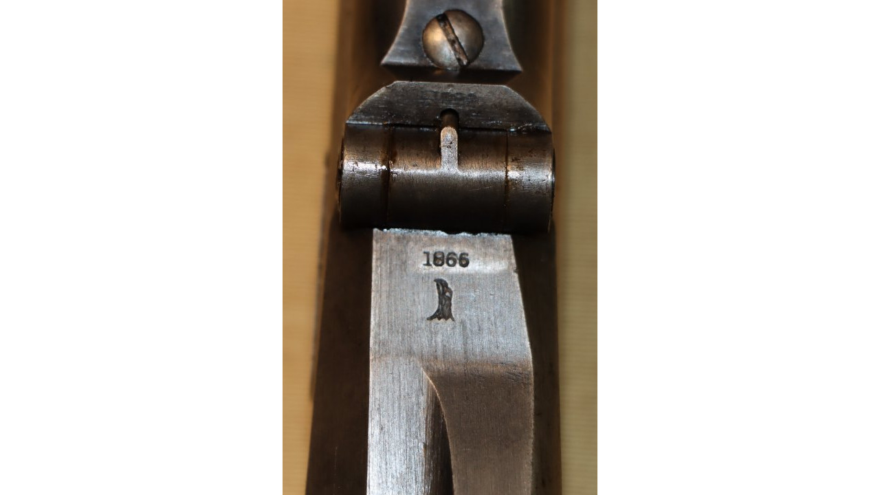 The Rear Sight on this Model 1866 Rifle is the very fine condition and correct US Model 1863/64 Rear Sight from the Civil War. The Rear Sight Base is attached to the top of the barrel in a dovetail and is held in place by its original Spanner Head Screw, and this Screw and the "floor" of the Rear Sight Base in which the Spanner Nut secures the sight are both in very fine condition and retain the majority of the original dark oil finish. The Elevation Leaf is correctly marked for 100 (“1”), 300 (“3”) and 500 yards with a 700-yard notch at the top of the Leaf. The face of the leaf has a serif “H” inspection stamp. The Elevation Leaf retains the vast majority of its original blued finish. The Leaf Screw secures from the left side and the Leaf Screw's single-slot is unmarred.