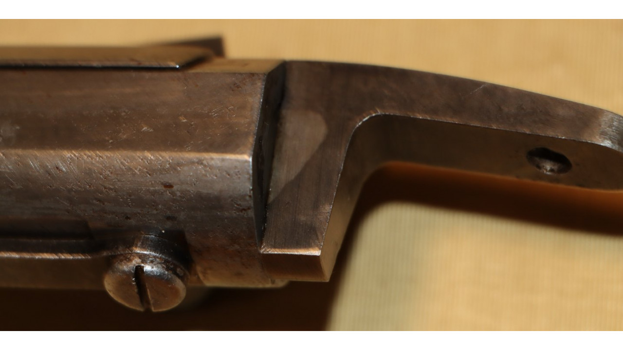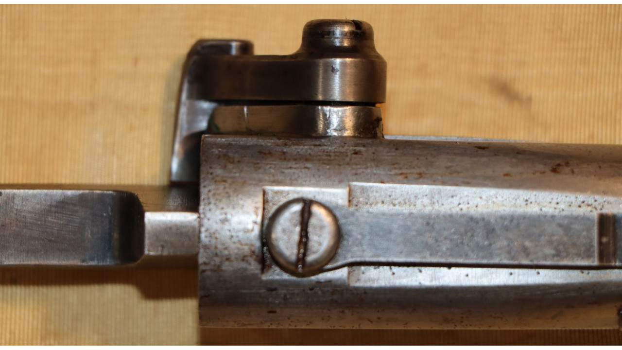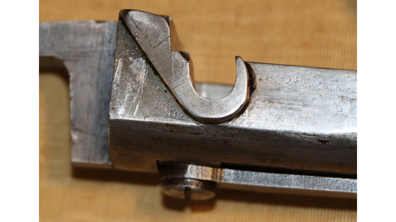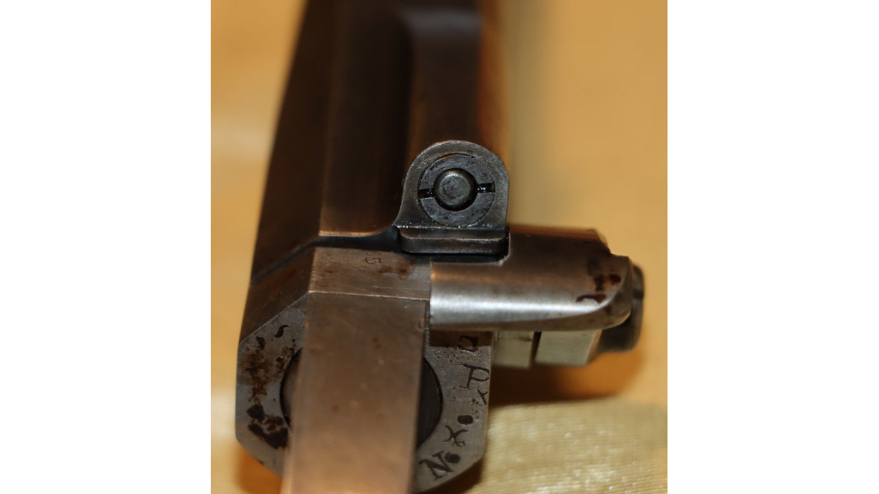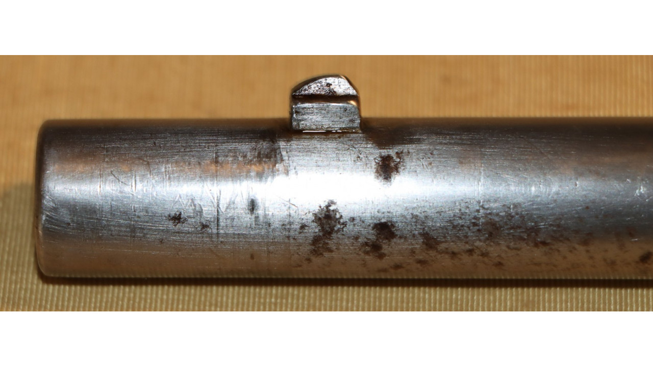 The Rear Sight on this Model 1866 Rifle is the very fine condition and correct US Model 1863/64 Rear Sight from the Civil War. The Rear Sight Base is attached to the top of the barrel in a dovetail and is held in place by its original Spanner Head Screw, and this Screw and the "floor" of the Rear Sight Base in which the Spanner Nut secures the sight are both in very fine condition and retain the majority of the original dark oil finish. The Elevation Leaf is correctly marked for 100 (“1”), 300 (“3”) and 500 yards with a 700-yard notch at the top of the Leaf. The face of the leaf has a serif “H” inspection stamp. The Elevation Leaf retains the vast majority of its original blued finish. The Leaf Screw secures from the left side and the Leaf Screw's single-slot is unmarred.