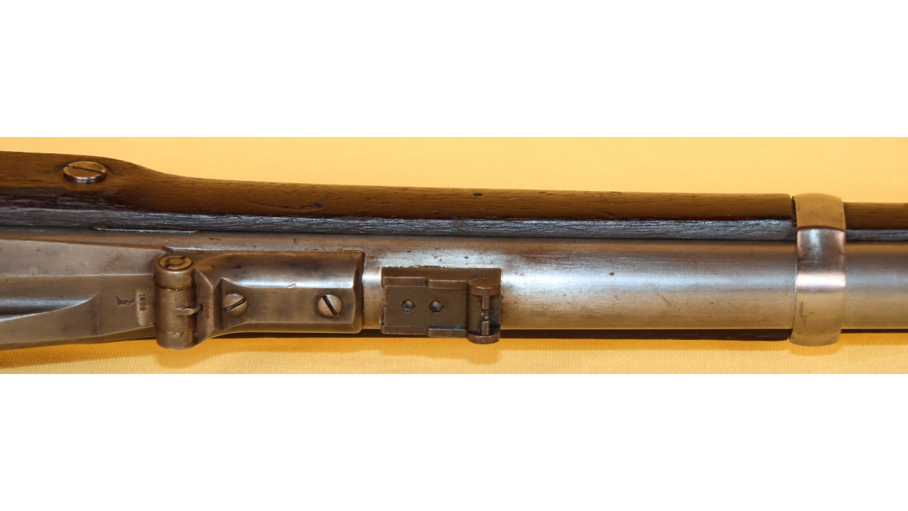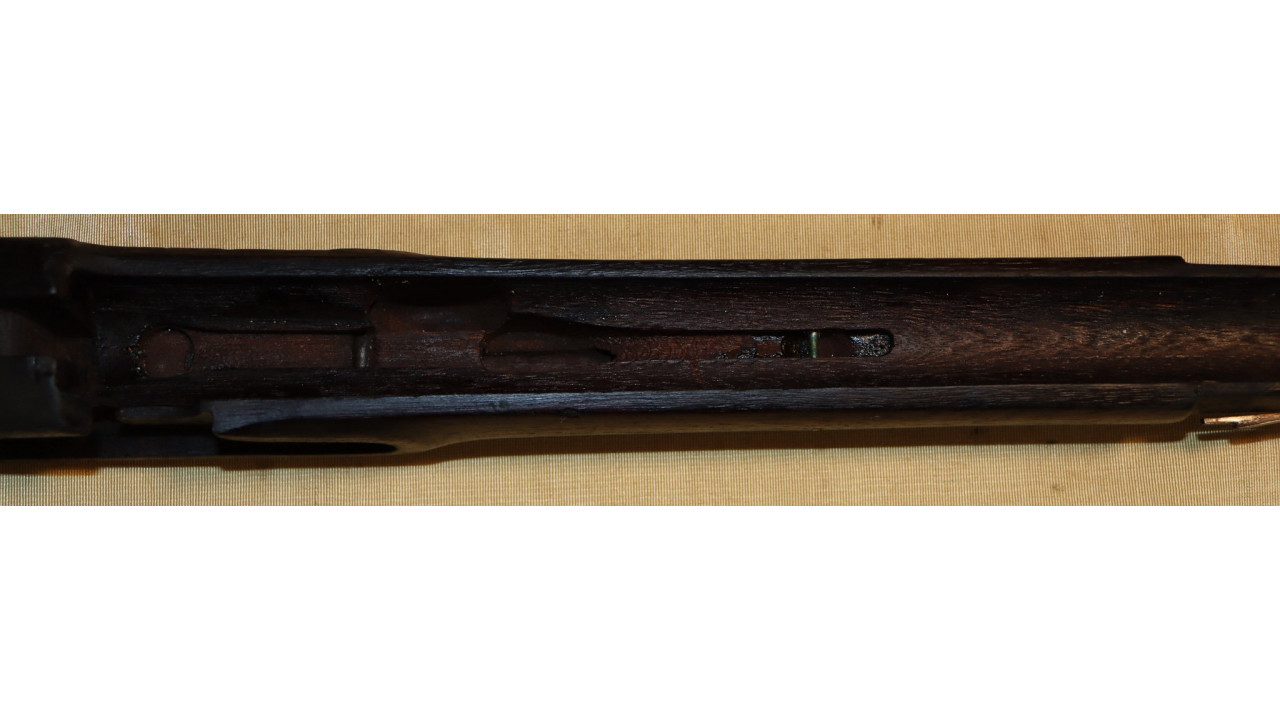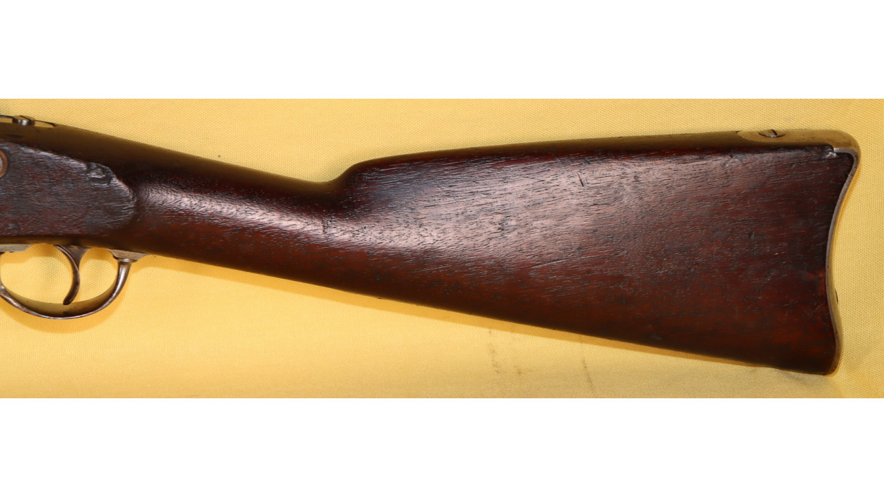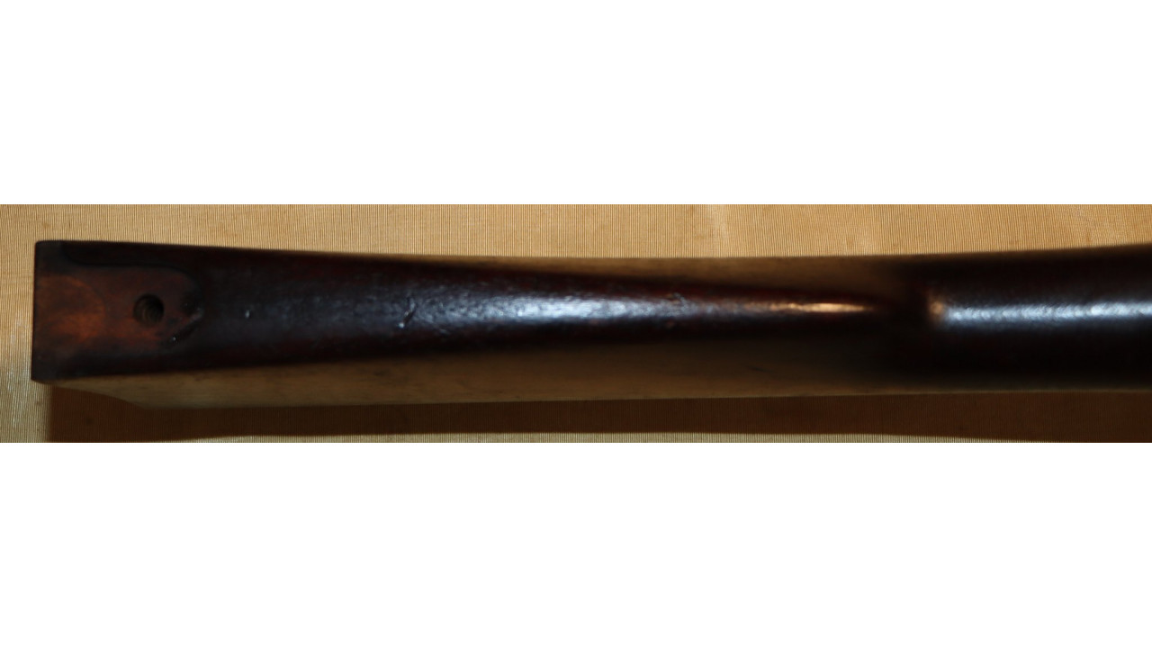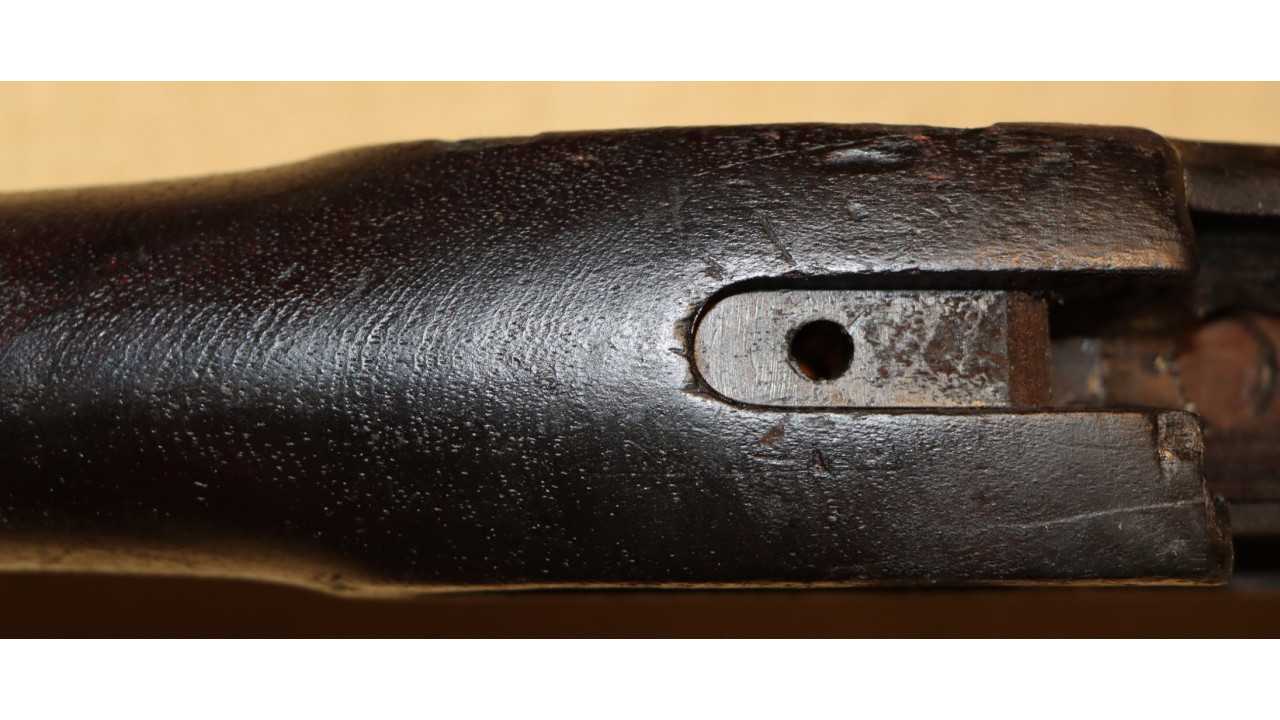 The Stock on this rifle is the original in fine condition with a only a very few minor storage dings, but there are no cracks or chips noted. Model 1866 Rifles used one of two types of stocks. The first were existing, but unissued US Model 1863/64 Civil War-era stocks that were subsequently modified to accommodate Erskine Allin's mechanism. The second type of stock was a new, black walnut stock that was milled from a stock blank especially for the Model 1866 Rifle and its unique mechanism.
