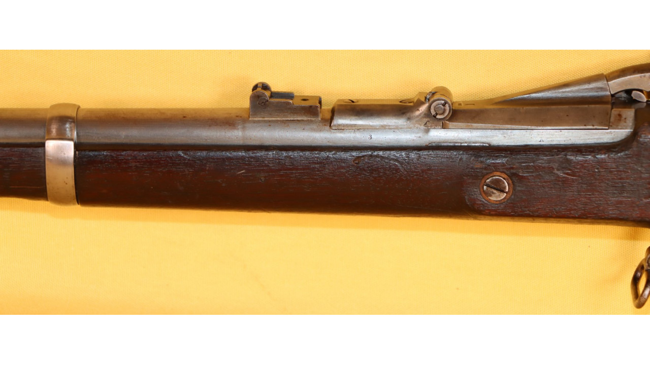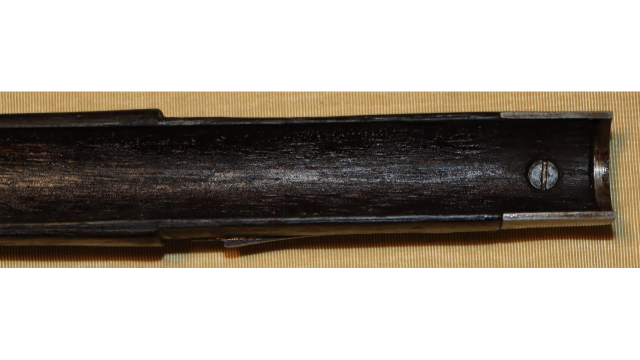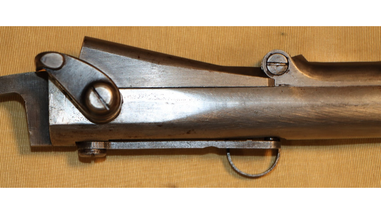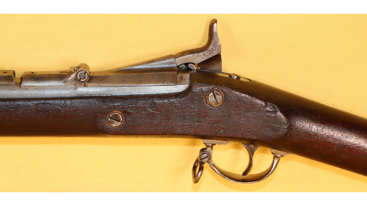 The Stock on this rifle is the original in fine condition with a only a very few minor storage dings, but there are no cracks or chips noted. Model 1866 Rifles used one of two types of stocks. The first were existing, but unissued US Model 1863/64 Civil War-era stocks that were subsequently modified to accommodate Erskine Allin's mechanism. The second type of stock was a new, black walnut stock that was milled from a stock blank especially for the Model 1866 Rifle and its unique mechanism.