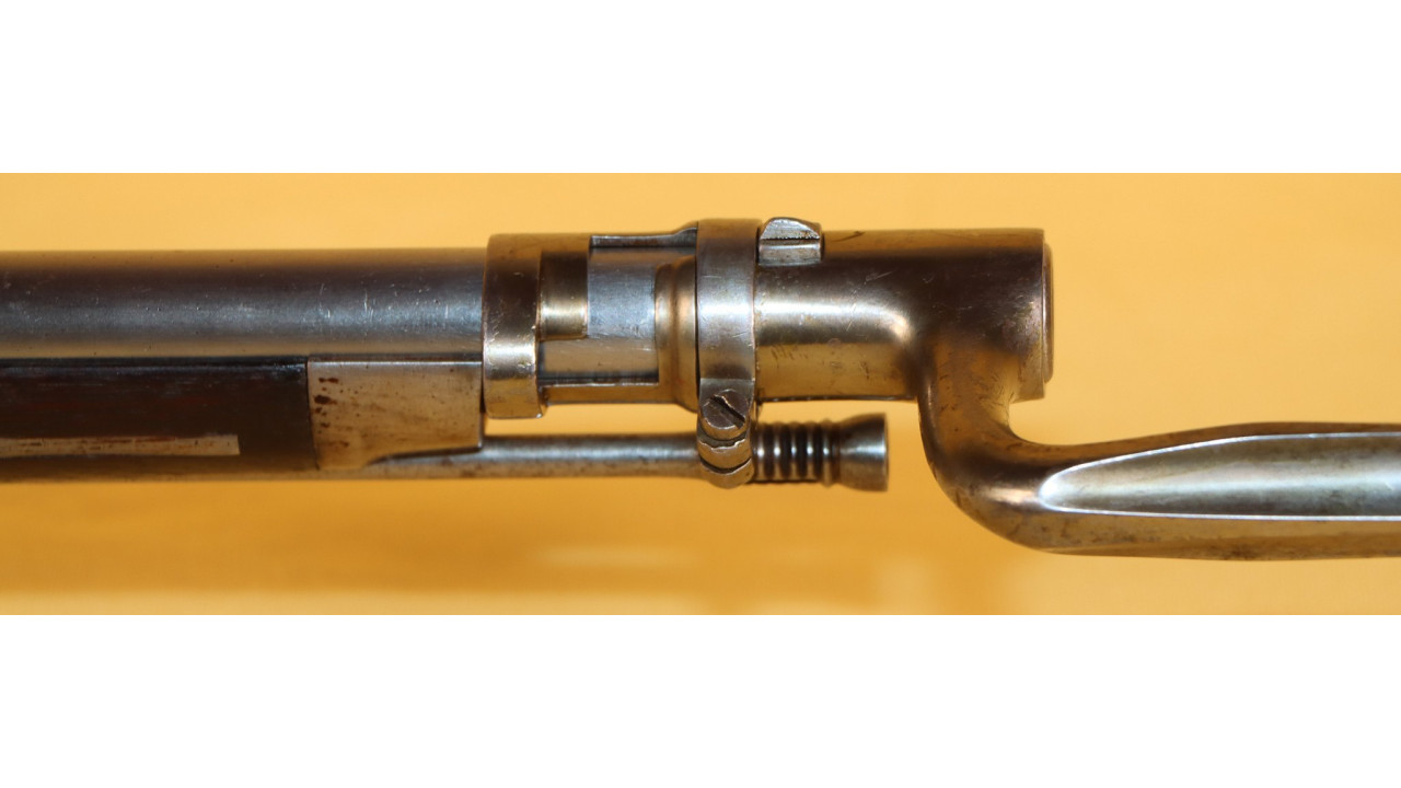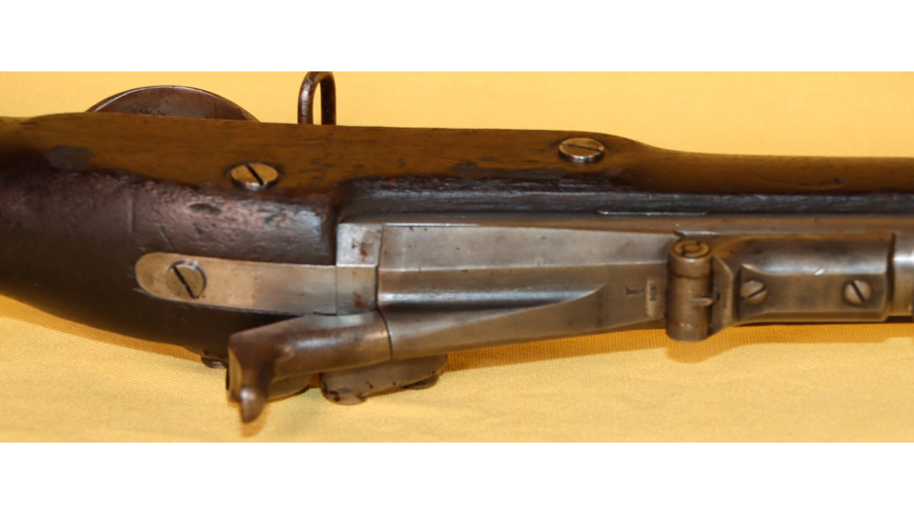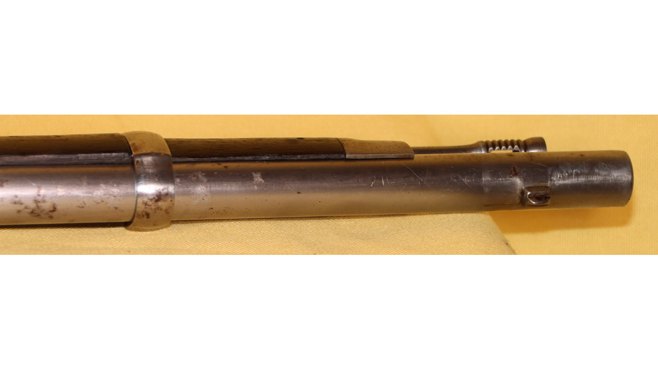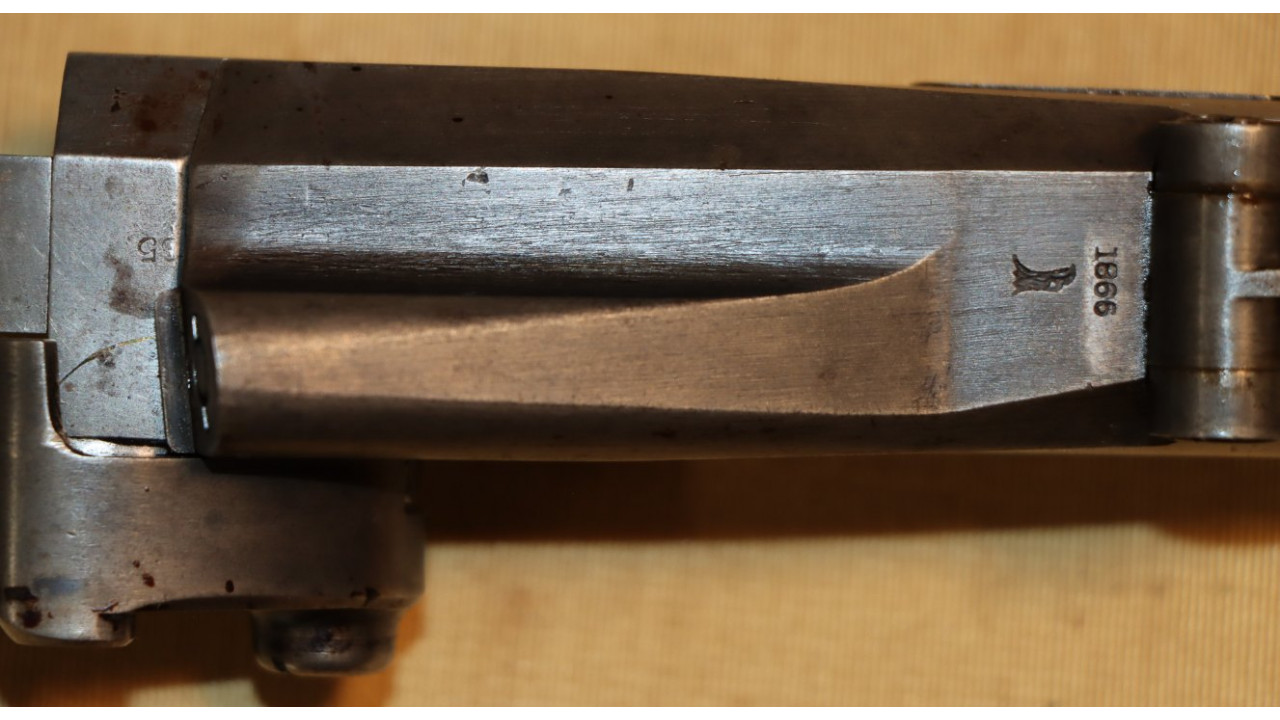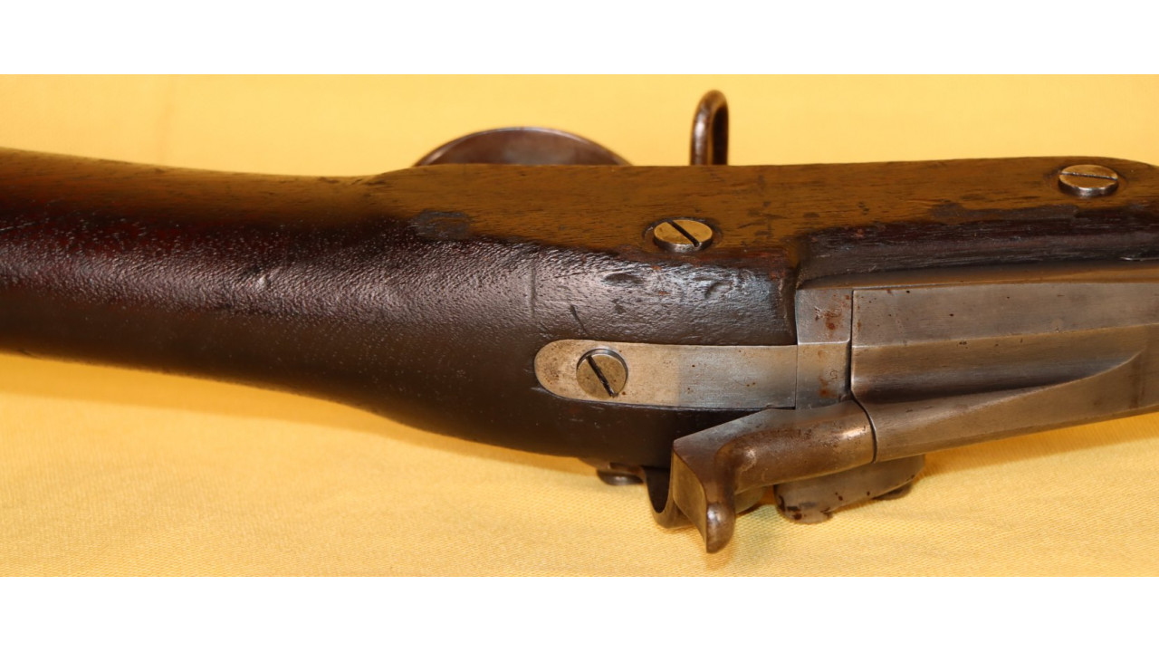 The Stock on this rifle is the original in fine condition with a only a very few minor storage dings, but there are no cracks or chips noted. Model 1866 Rifles used one of two types of stocks. The first were existing, but unissued US Model 1863/64 Civil War-era stocks that were subsequently modified to accommodate Erskine Allin's mechanism. The second type of stock was a new, black walnut stock that was milled from a stock blank especially for the Model 1866 Rifle and its unique mechanism.