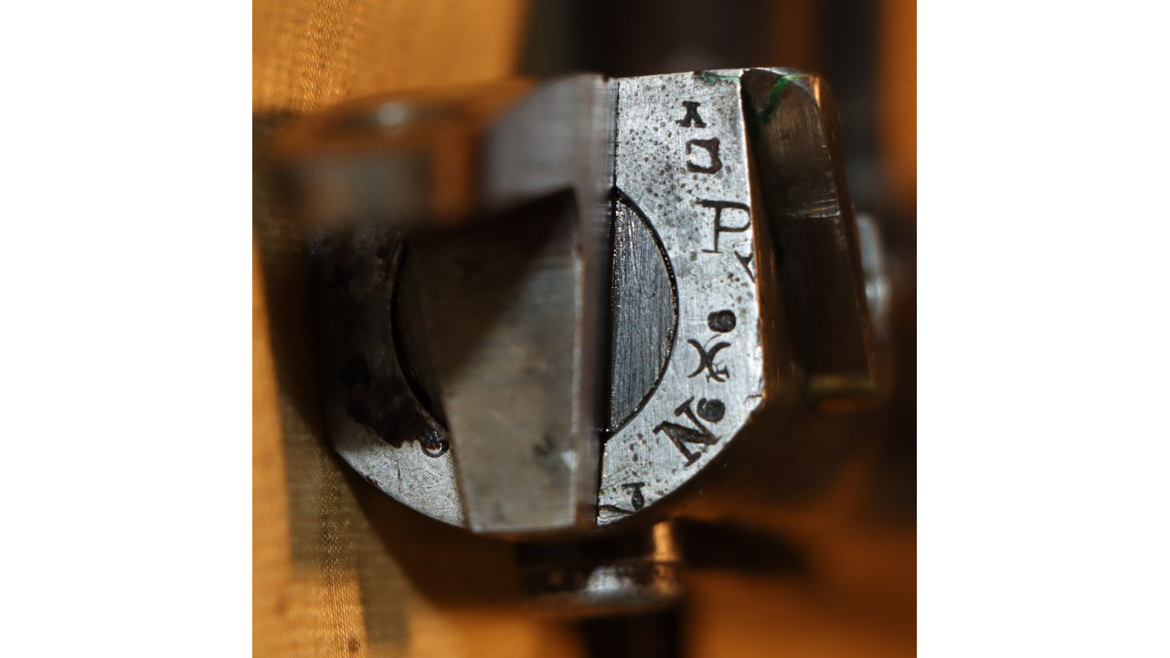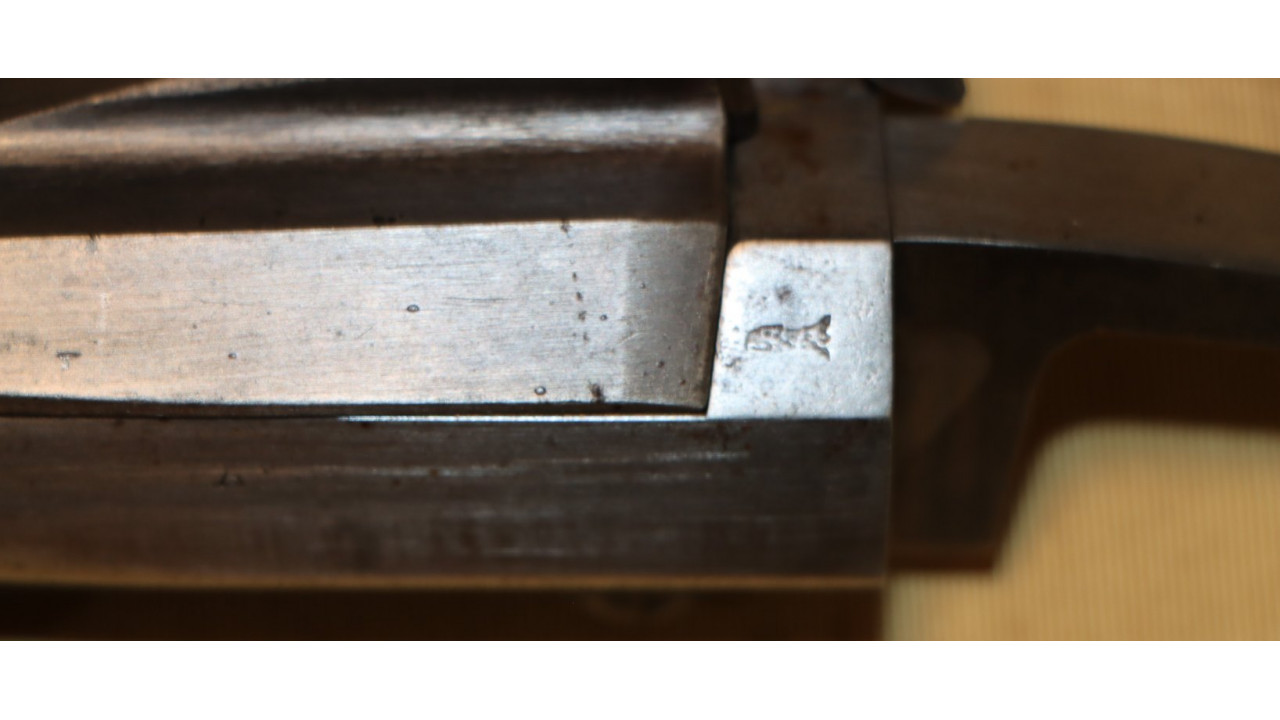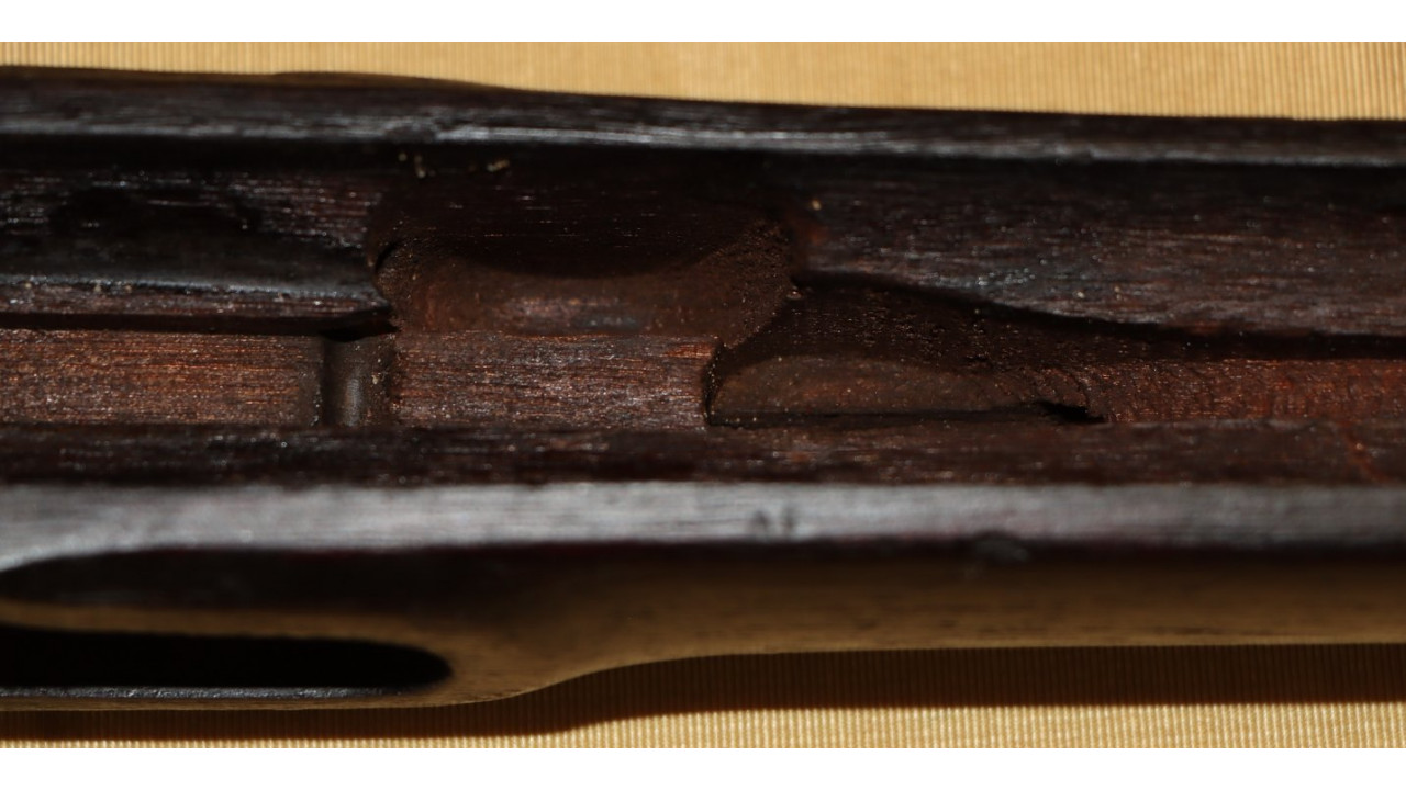 This particular stock is the earlier, Civil War Model 1863/64 Stock that was modified in 1866 for the alteration and it still retains its original oiled finish. As part of its modification, the original ramrod friction spoon was removed and the spoon inletting remains. On the left stock flat are two oval-end, boxed cartouches. The first, which is the forward most cartouche, has the script letters "HSH" inside the box, which is the cartouche of Henry S. Hill, who was a civilian sub-inspector in the machine shop at Springfield Armory during the Civil War. To the rear of Hill’s cartouche is the oval with script “ESA” stamp of Erskine S. Allin, Master Armorer at Springfield and the designer of this alteration.